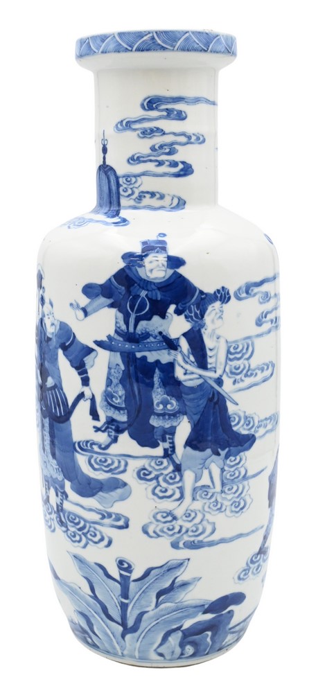 Chinese Blue and White Rouleau Vase, 19th century, decorated with warriors in landscape, Kangxi six-character regnal mark on base, height 18 1/2 inches. Provenance: An estate from Redding, CT.