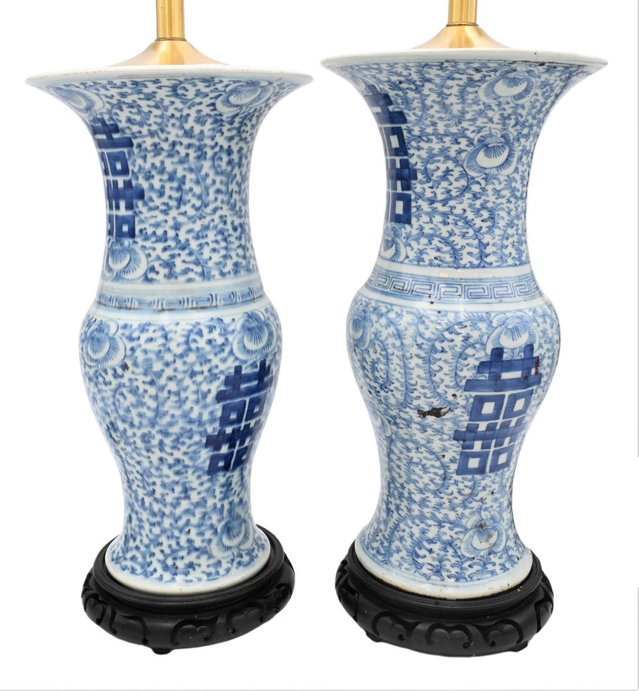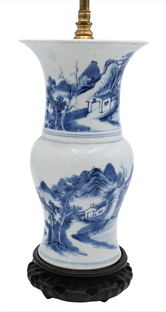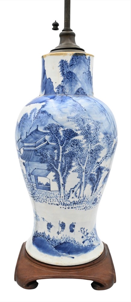 Chinese Blue and White Porcelain Vase, having painted landscape scene, made into a table lamp, vase height 11 inches, total height 24 1/2 inches. Provenance: Estate of Wallace Bradway, New Haven, CT.