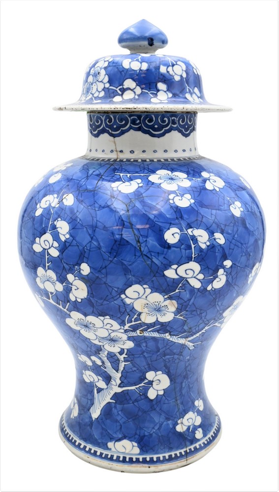 Chinese Blue and White Prunus Covered Temple Jar, 18th century, Kangxi period (1644 – 1722), decorated with white flowers on blue background, age crack and chip to cover, having fitted wooden base, height 17 inches.