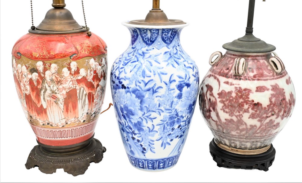Three Piece Group of Japanese Porcelain, to include a satsuma vase having painted figures, height 11 inches; blue and white lobed vase having painted flowers and birds; along with a white glazed vase having painted birds and blossoming trees.