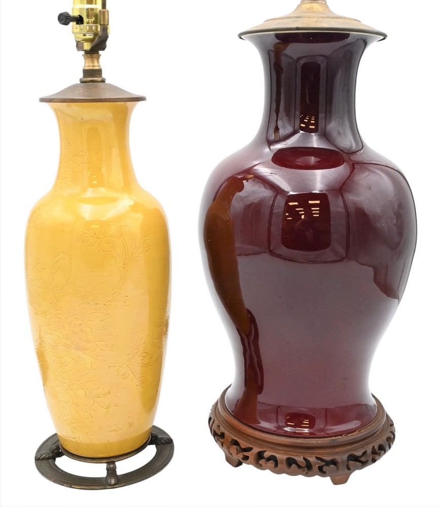 Two Chinese Glazed Vases, to include a yellow glaze vase having incised flowers and bird design, height 13 1/2 inches; along with a red glazed lobed vase, height 14 1/2 inches; both made into table lamps.