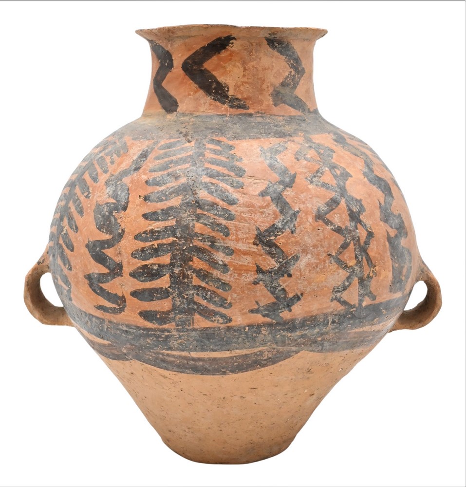 Chinese Neolithic Pottery Jar, possibly Majiayao culture, Banshan phase, circa 2,500 BCE, the buff body decorated in black with geometric zigzag and stylized leaves, height 13 inches.