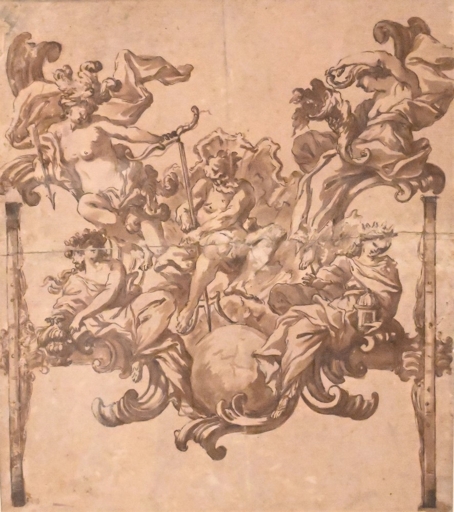 Roman School, 17th century or later, design for the rear of a carriage with Neptune and personifications of the four continents; pen, brown ink and wash on tan paper, 12 5/8″ x 11 1/2″. Provenance: Purchased Sotheby’s, New York, January 26, 2000, Lot 67, for $7,475, receipt on back. Estate of Wallace Bradway, New Haven, CT.