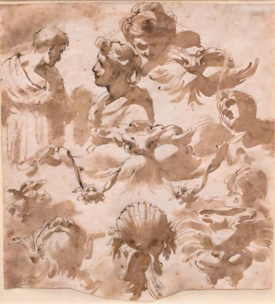 Ubaldo Gandolfi (1728 – 1781), Studies of Heads and Grotesque Ornaments, pen and brown ink and wash over black chalk, inscribed on back, 8 1/2″ x 8″. Provenance: Sotheby’s receipt January 12, 1994 for $8,714. Estate of Wallace Bradway, New Haven, CT.