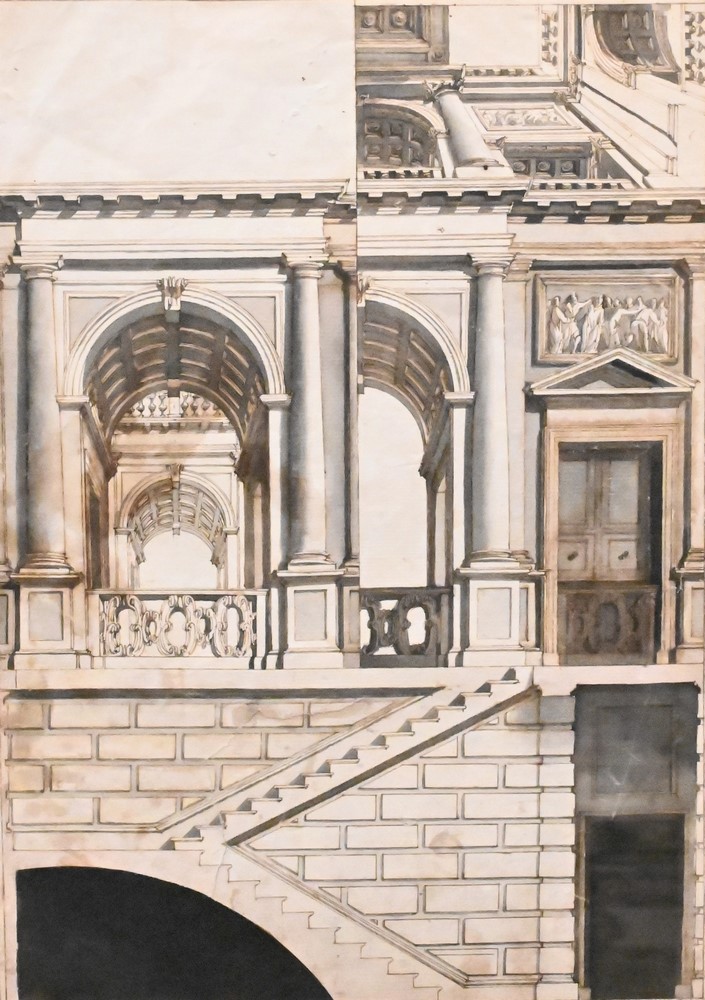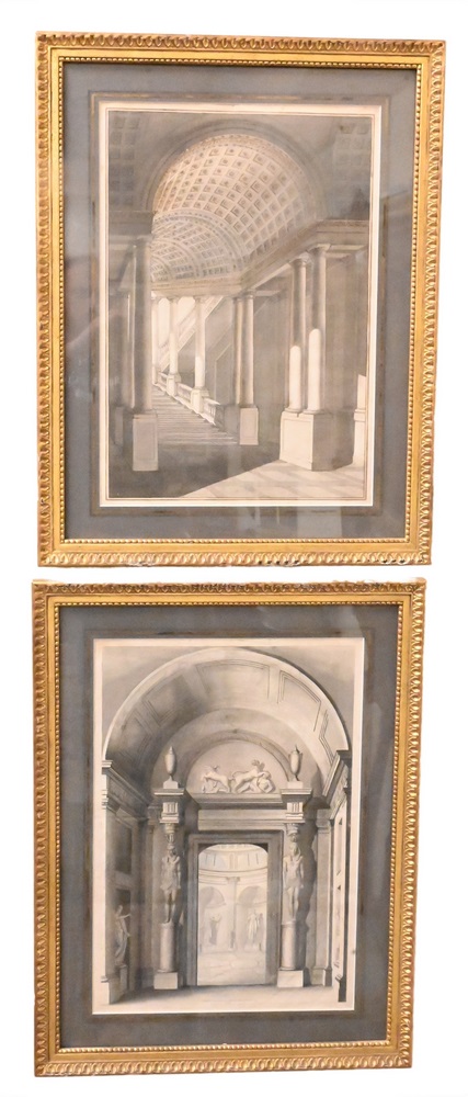 Pair of Italian School Pen and Ink, 18th century, staircase to entrance of Museo Pio Clementino, Vatican; along with a view through a monumental doorway into sculpture gallery, pen and grey ink with grey wash; each 19 1/8″ x 13 1/8″. Provenance: Ex coll: David T. Hersey, Boston. Purchased at Marika’s Antiques, Boston, December 2, 1975, no receipt available.Estate of Wallace Bradway, New Haven, CT.