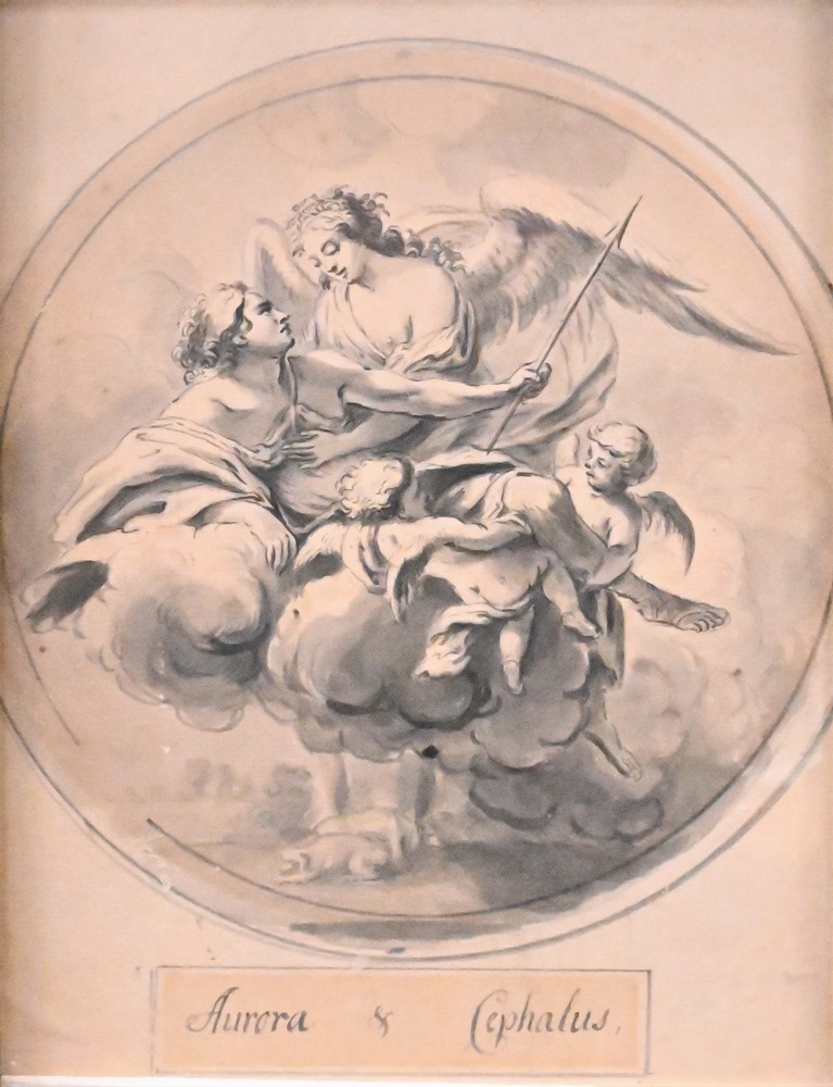Attributed to Thomas Stothard (British, 1755 – 1834), Aurora and Cephalus, pen and ink and grey wash, diameter 6 inches, sheet size 7 1/2″ x 6 3/4″. Provenance: Appleby Brothers, London; Charles E. Buckley, Mont Vernon, New Hampshire, from who acquired on July 5, 1976, no receipt available. Estate of Wallace Bradway, New Haven, CT.
