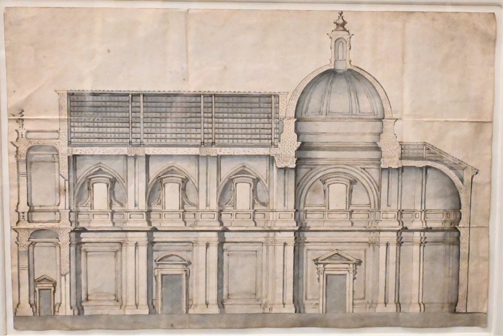 Continental School, 18th century, longitudinal section of a church with narthex, nave, dome and apse; pen and brown ink with blue grey wash, 10 7/8″ x 16 3/8″. Provenance: Purchased by Walter Schatzki, New York, 1974, no receipt available. Estate of Wallace Bradway, New Haven, CT.
