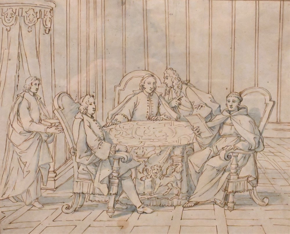Venetian School, 18th century, A Venetian Conversation, pen and brown ink with blue wash on cream paper, 10 1/8″ x 12 1/4″. Provenance: Purchased by Pietro Scarpa, Venice, May 20, 1991 receipt on back. Provenance: Estate of Wallace Bradway, New Haven, CT.