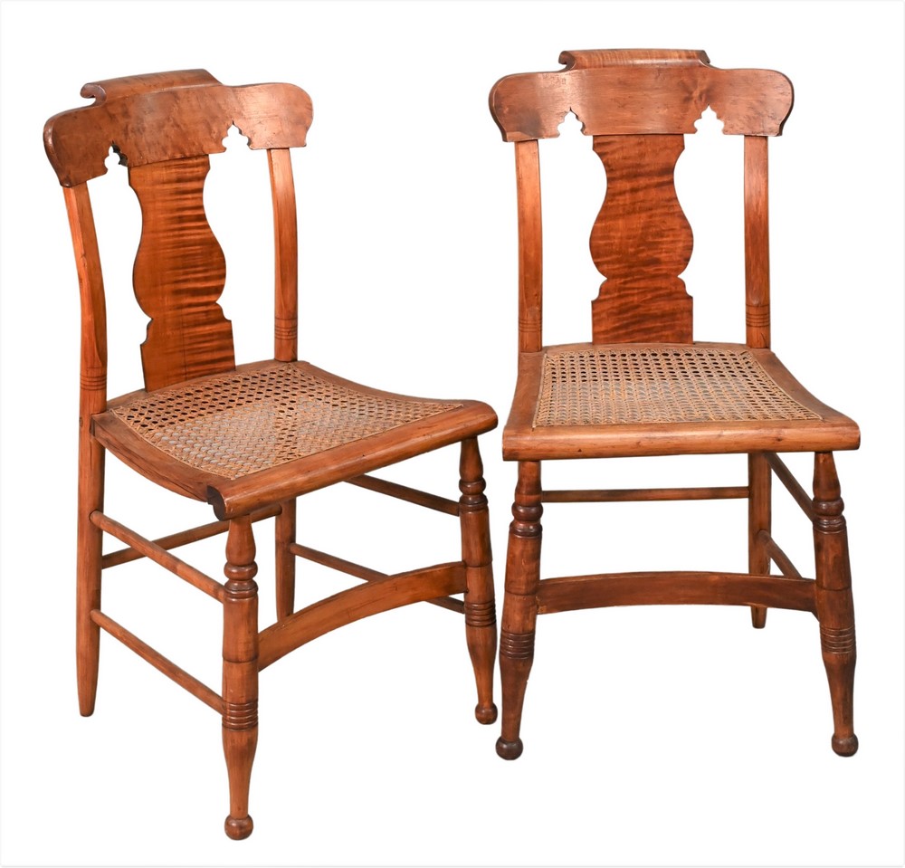 Assembled Set of Eight Maple Chairs, having caned seats, four of one style, four of another, height 34 inches. Provenance: Estate of Florence Yannios, Waterfront Home, Guilford, CT.