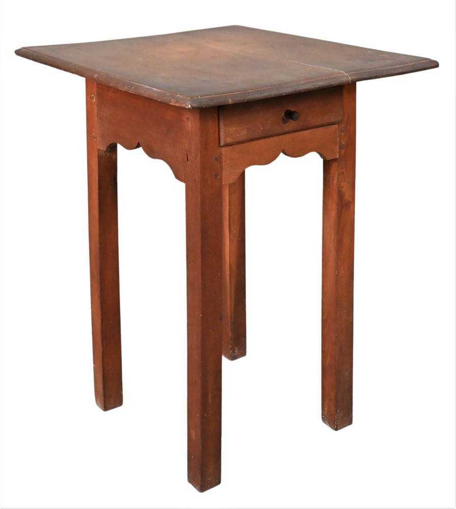 Chippendale Cherry Side Table, having large overhanging top over one drawer, over scalloped skirt, set on squared legs, circa 1760, height 27 inches, depth 45 inches, top 20″ x 22 1/2″. Provenance: Estate of Florence Yannios, Waterfront Home, Guilford, CT.