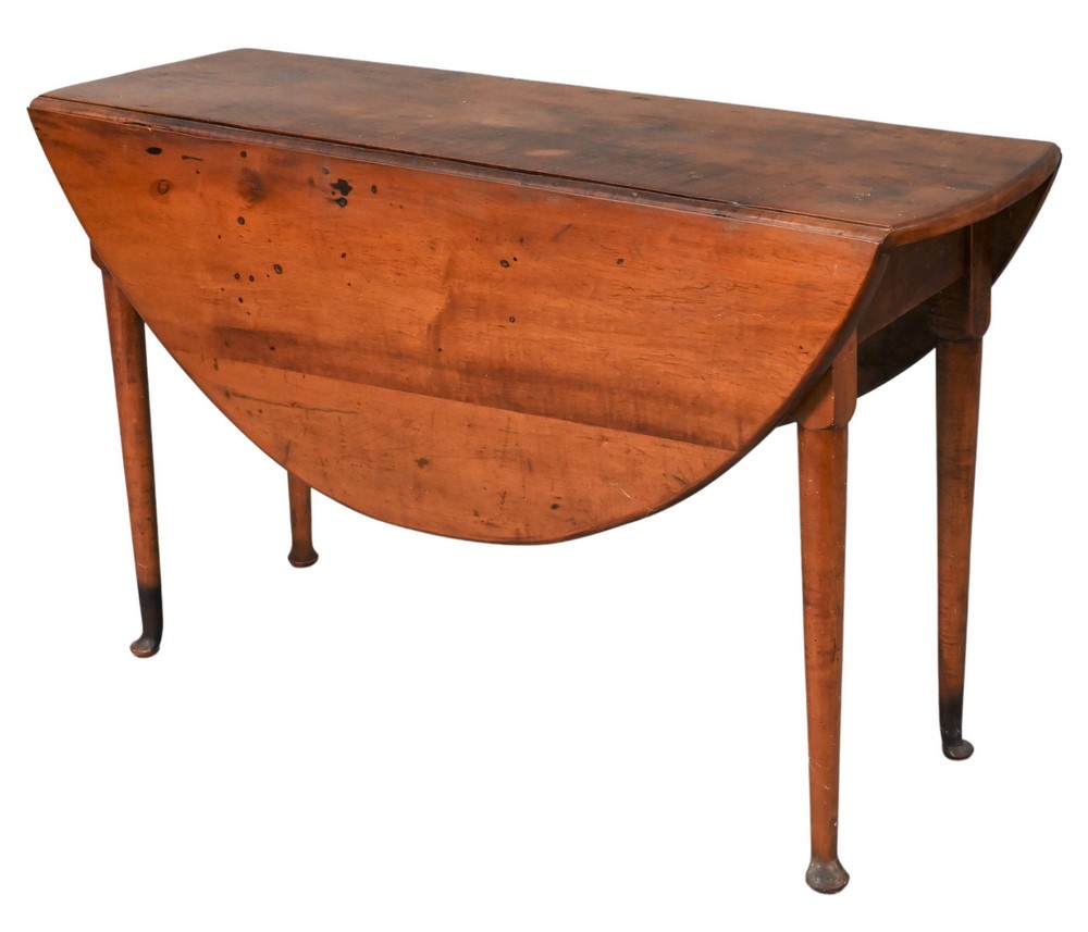 Queen Anne Maple and Tiger Maple Table, having oval drop leaves, circa 1750, (restored), height 27 1/2 inches, width (top closed) 15 inches. Provenance: Estate of Florence Yannios, Waterfront Home, Guilford, CT.