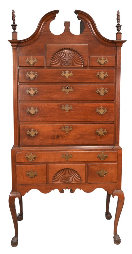 Chippendale Walnut Highboy, in two parts, upper section with bonnet top over three short drawers, over four drawers, having fan carved center drawer, all flanked by fluted pilasters on lower section with one drawer over three drawers, fan carved center drawer, over scalloped skin with carved pinwheels set on cabriole legs, ending in ball and claw feet, height 84 inches, width 37 1/2 inches. Provenance: Estate of Florence Yannios, Cheshire, CT.