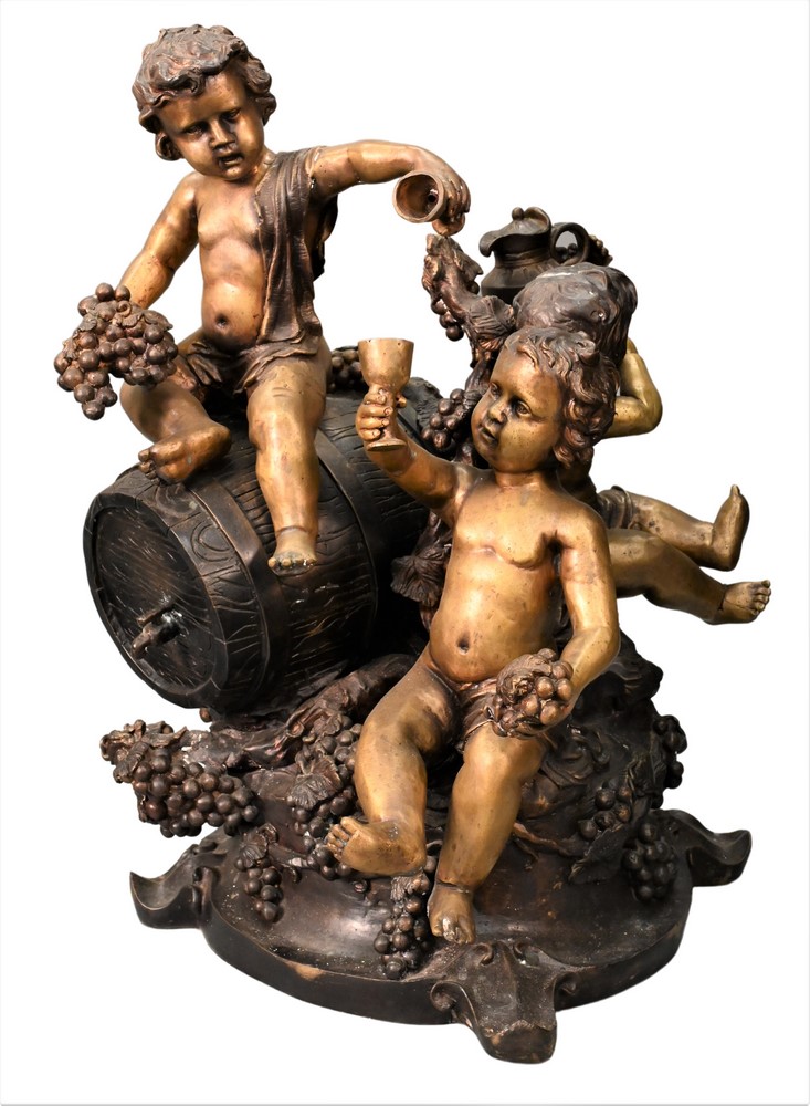 After Auguste Moreau Bronze Fountain, having three puttis sitting atop a wine barrel with grape vines and chalaces, signed “A. Moreau” on base, height 25 inches.