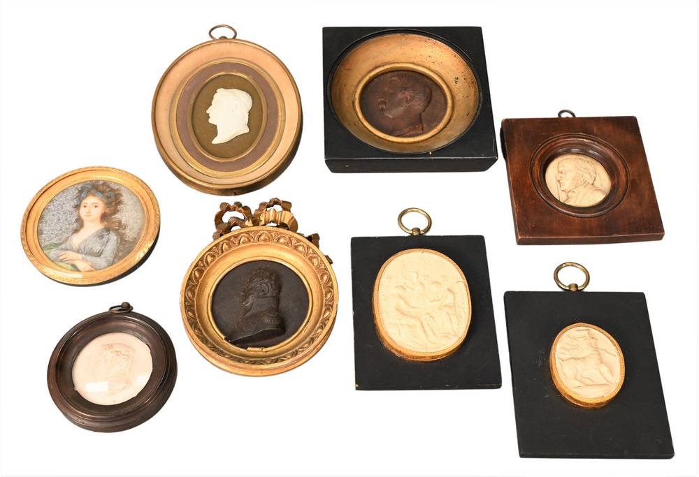 Eight Piece Lot, to include a classical head signed Andried F., 19th century; an ivory bust signed Wagner; two metal mini plaques; a mini painting; etc.; largest 5″ x 5″. Please note: Items containing ivory cannot be purchased or shipped by bidders residing outside of the United States or California, Hawaii, Nevada, New Jersey, New York, Washington, Oregon, or District of Columbia. If an ivory item is purchased by a bidder in one of the above mentioned locations or attempts to ship ivory to one of the above mentioned locations, bidder will forfeit the item and be responsible for any incurred fees such as a restocking fee.