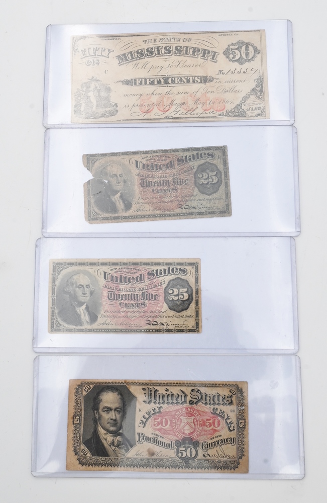 Group of Four Small Bank Notes, to include two 25 cent fractional currency 1863 bank notes; one 50 cent fractional currency 1875 bank note along with one 50 cent Mississippi 1864 note.