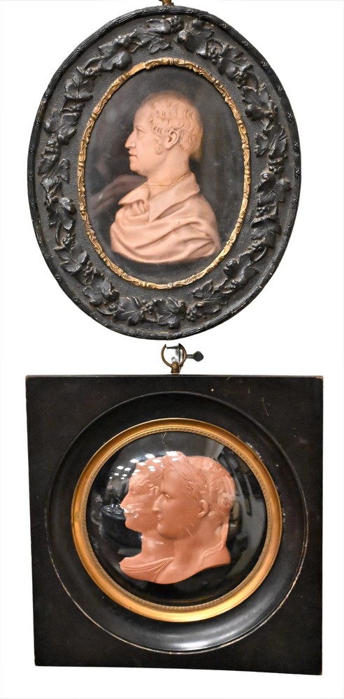 Three Wax Relief Portrait Plaques, to include a double portrait signed illegibly, diameter 6 inches; along with a Cartl Hettler classical bust of Ludwig Von Bayern, 4 3/4″ x 3″, signed C. Hettler, 1818.