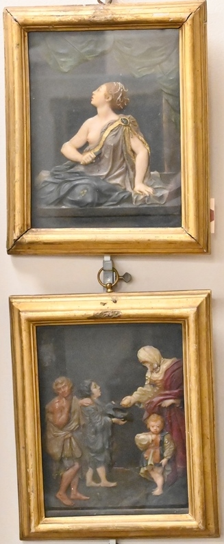 Pair of Wax Relief Plaques, offering with four figures and a classical partially clad figure of a woman stabbing herself, 18th century or later in shadow box frames, 7 3/4″ x 6″.