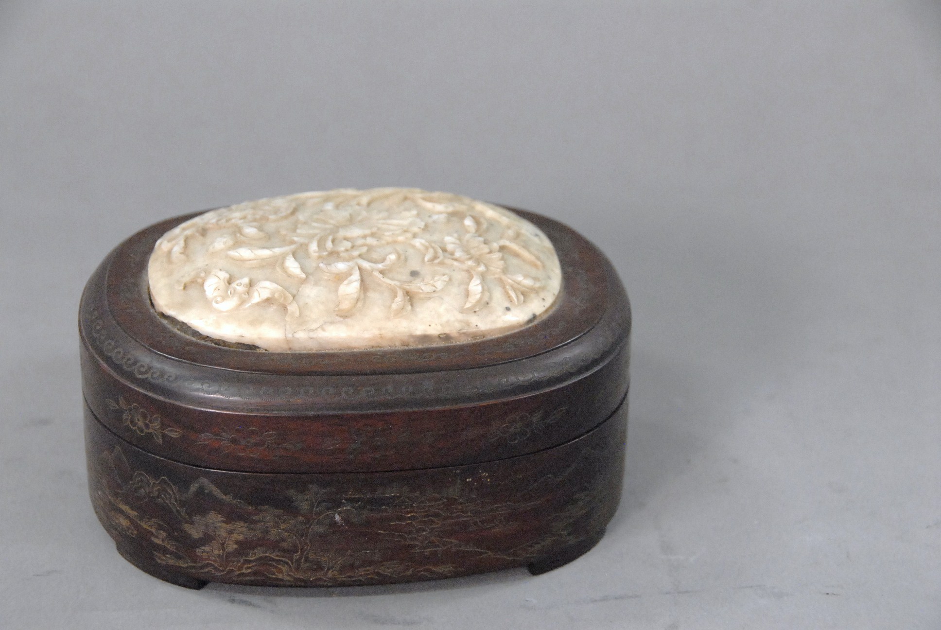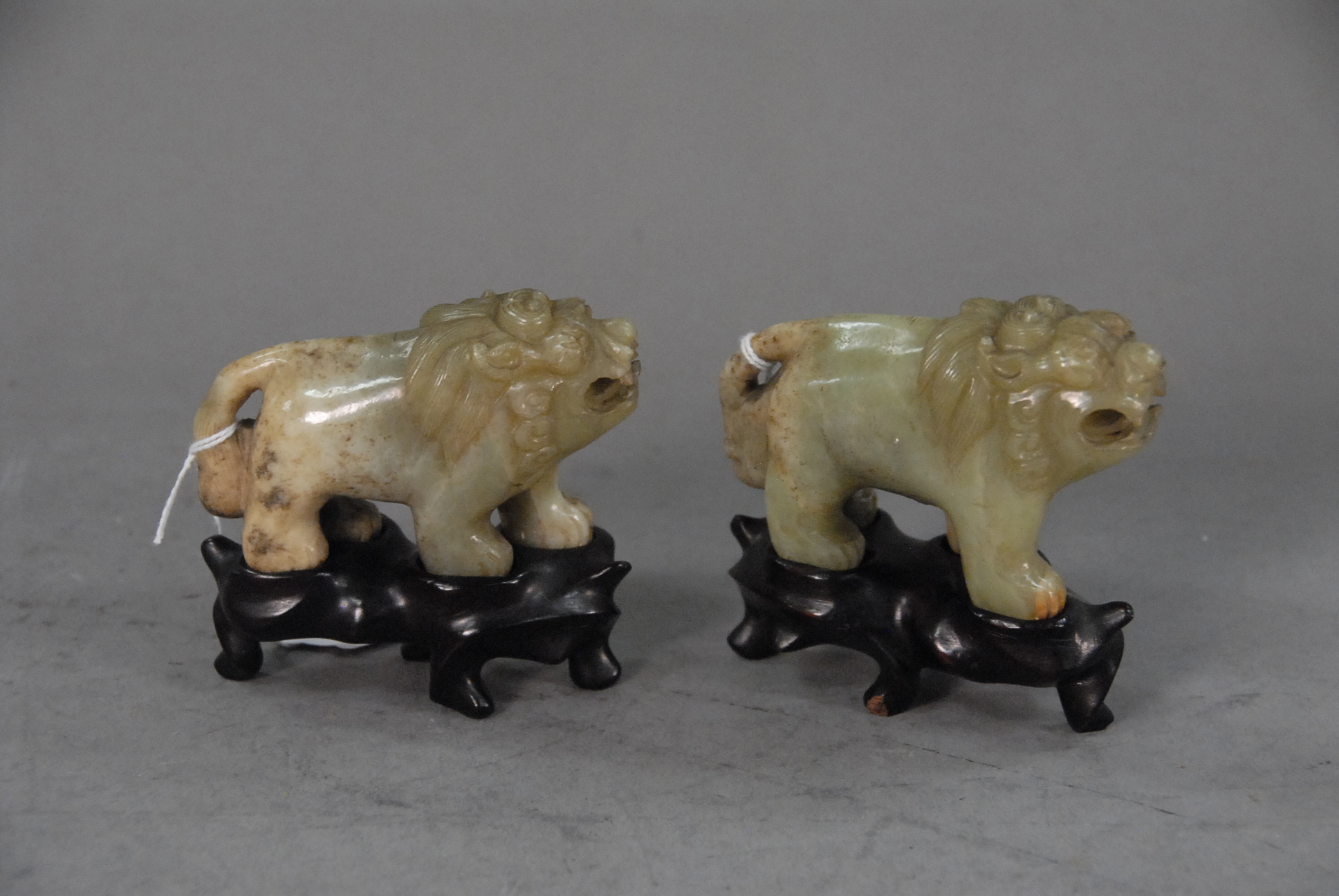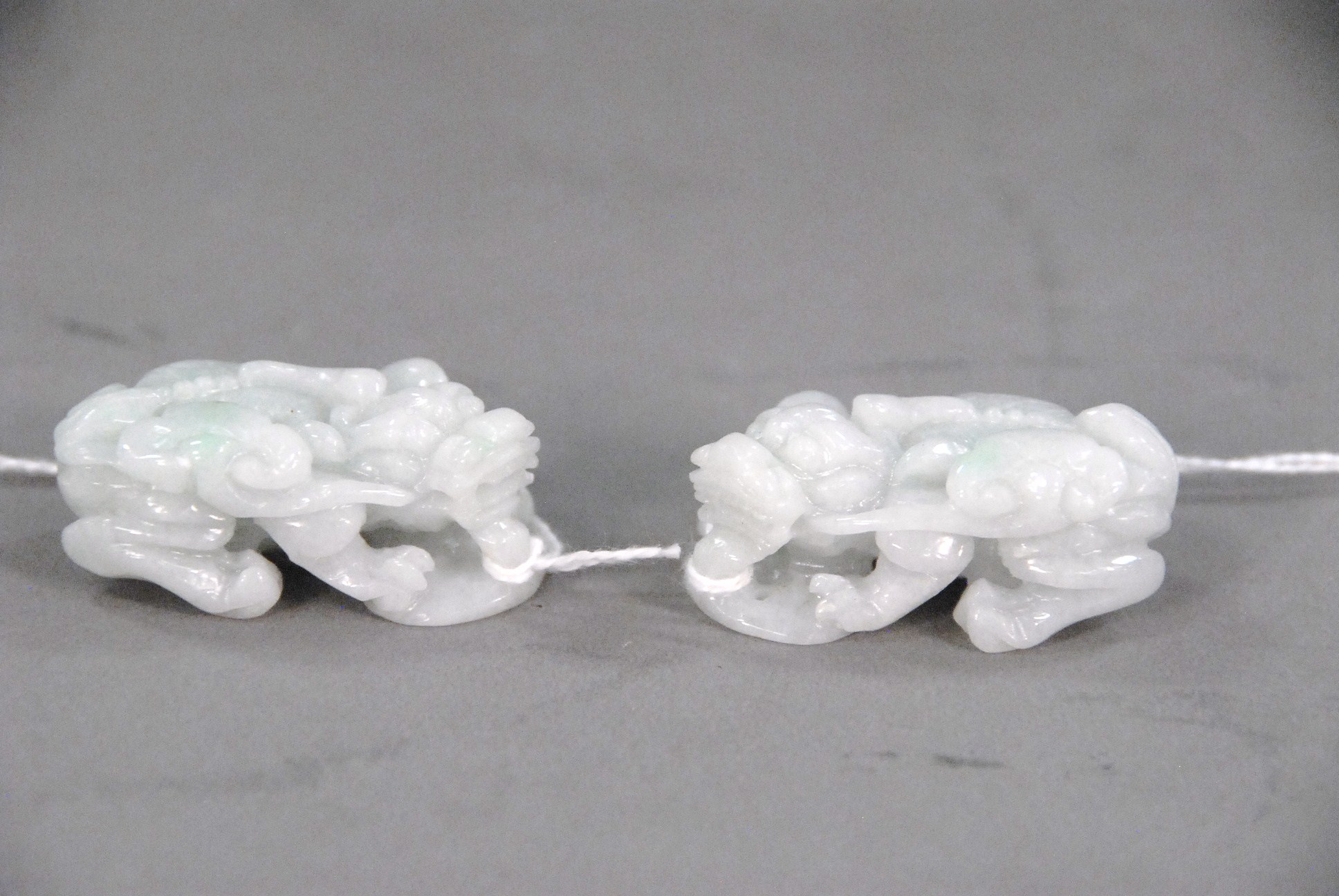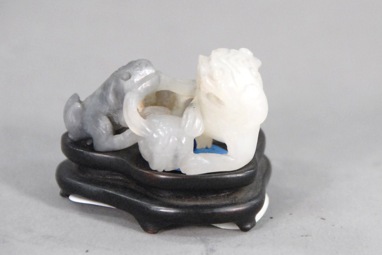 Small black and white jade foo dogs playing with a ball one foo dog mostly white jade and the smaller foo dog mostly black jade with ball in the middle.