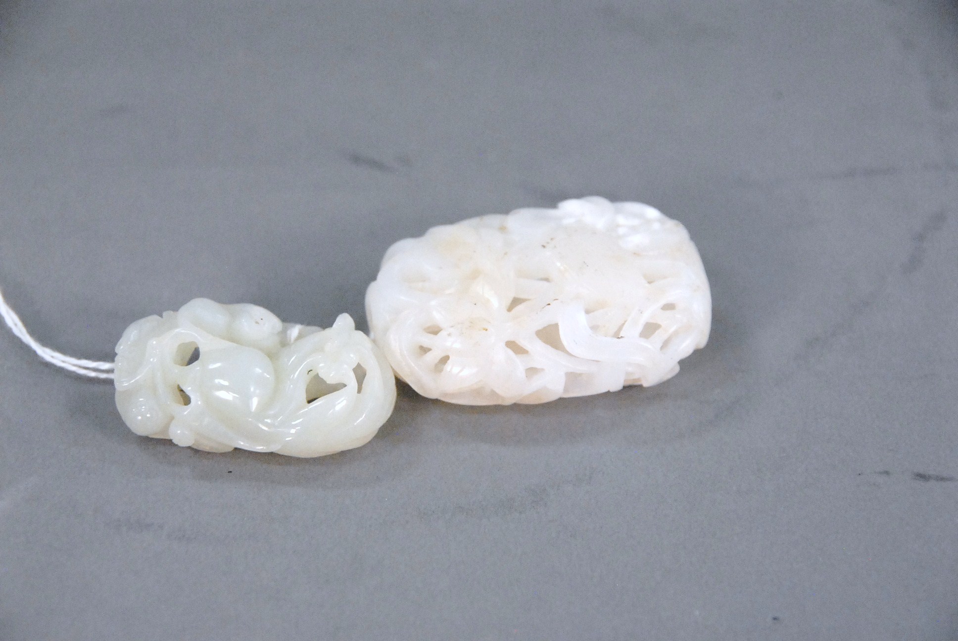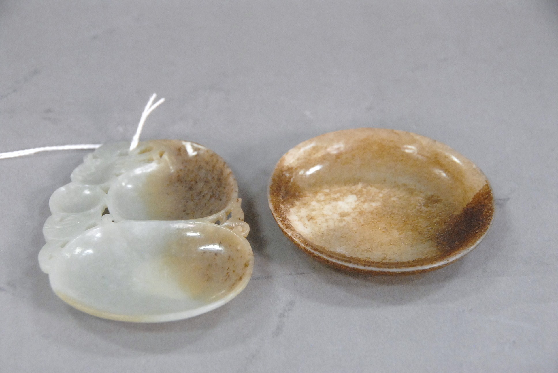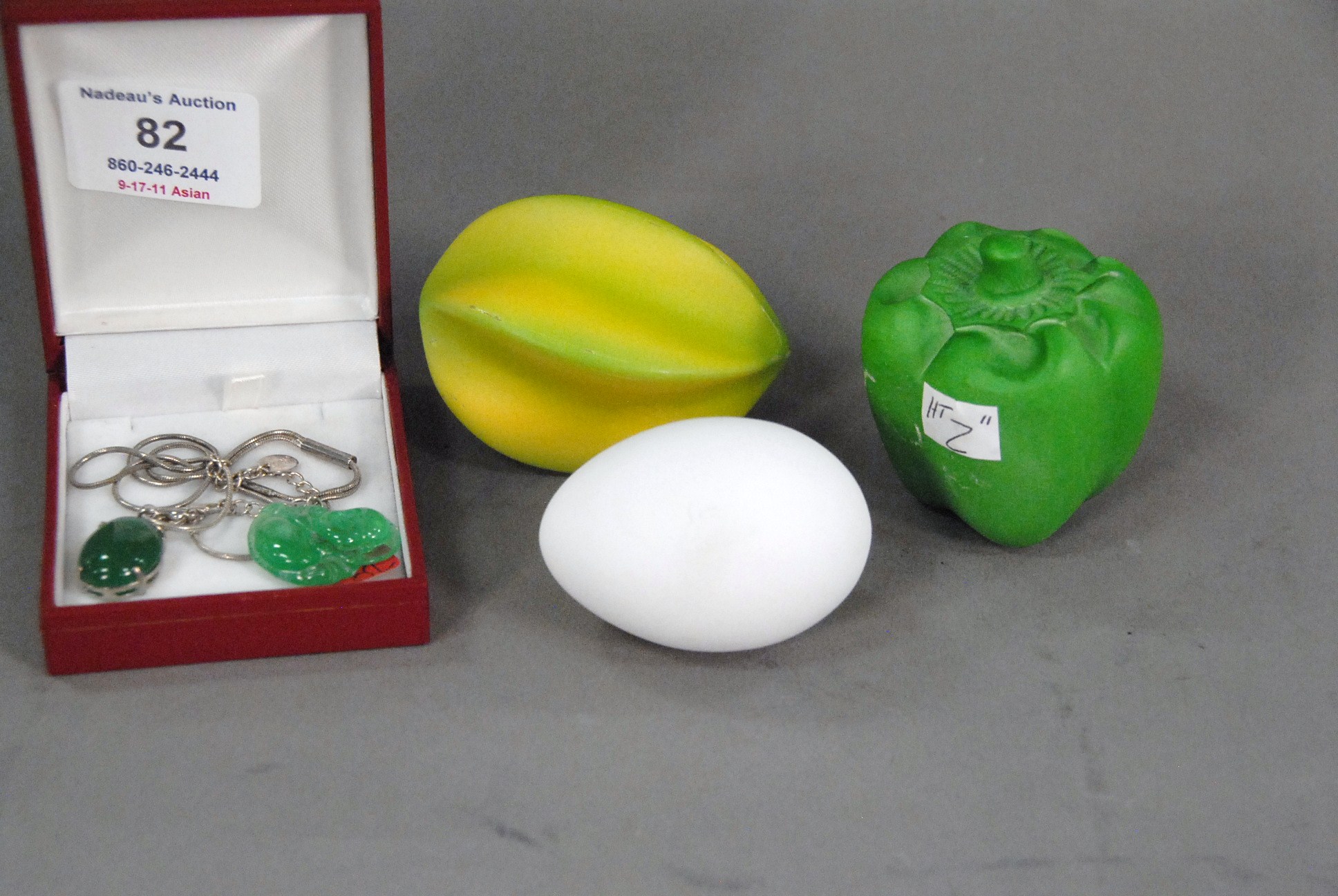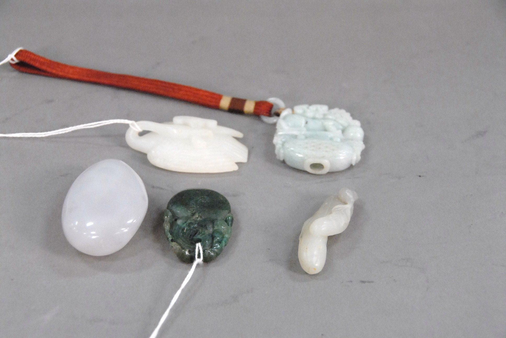 Group lot of jade, jadeite, and agate to include: white jade phoenix bird and eggplant, spinach green jade eggplant, reticulated carved jade foo-dog and vase, and an agate stone.