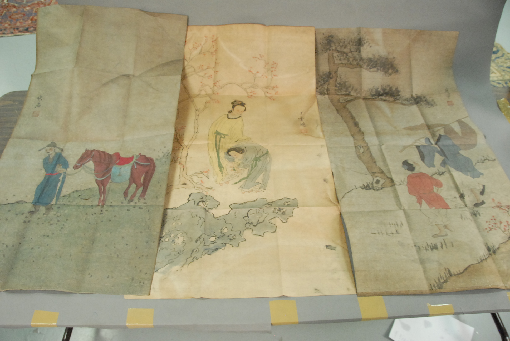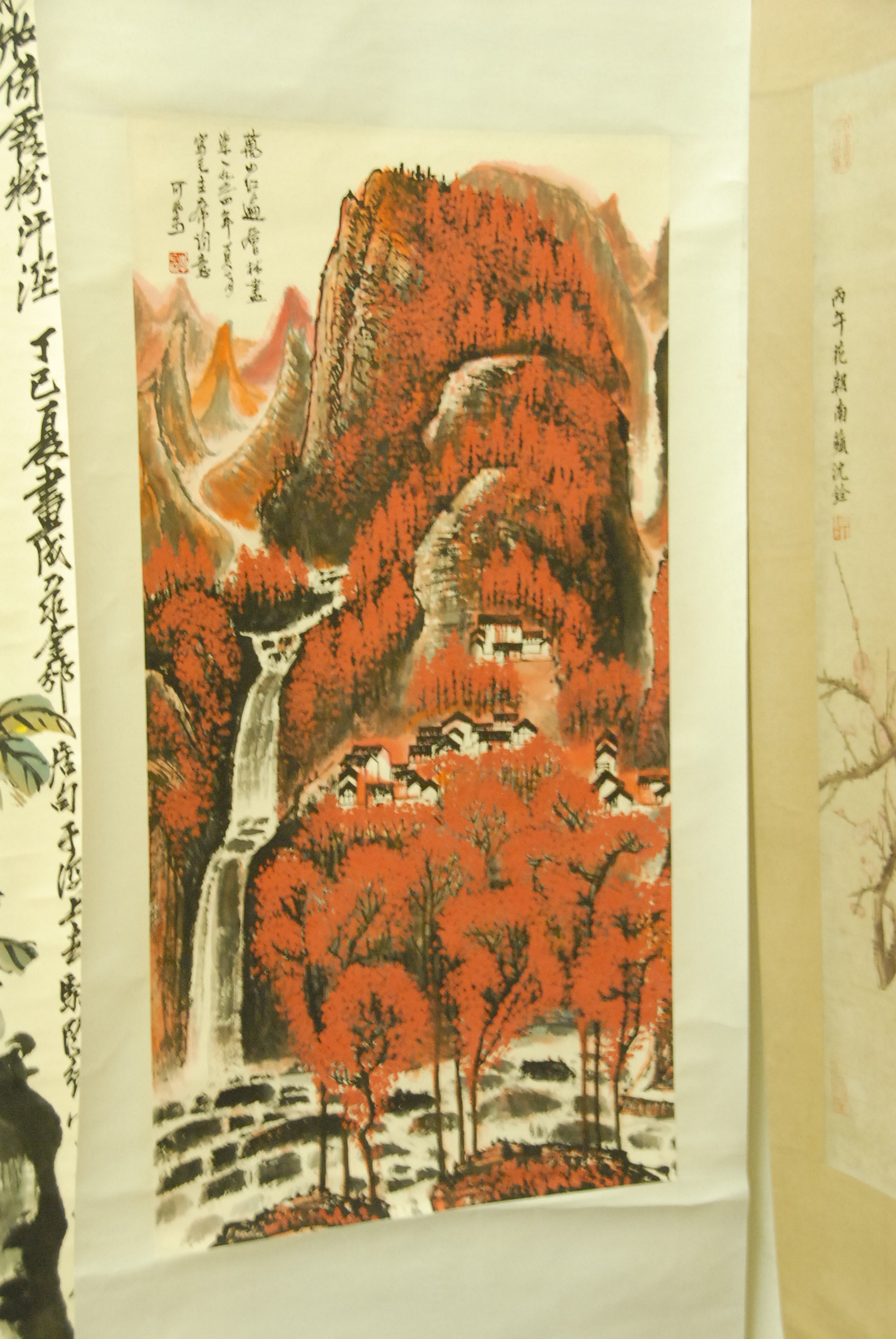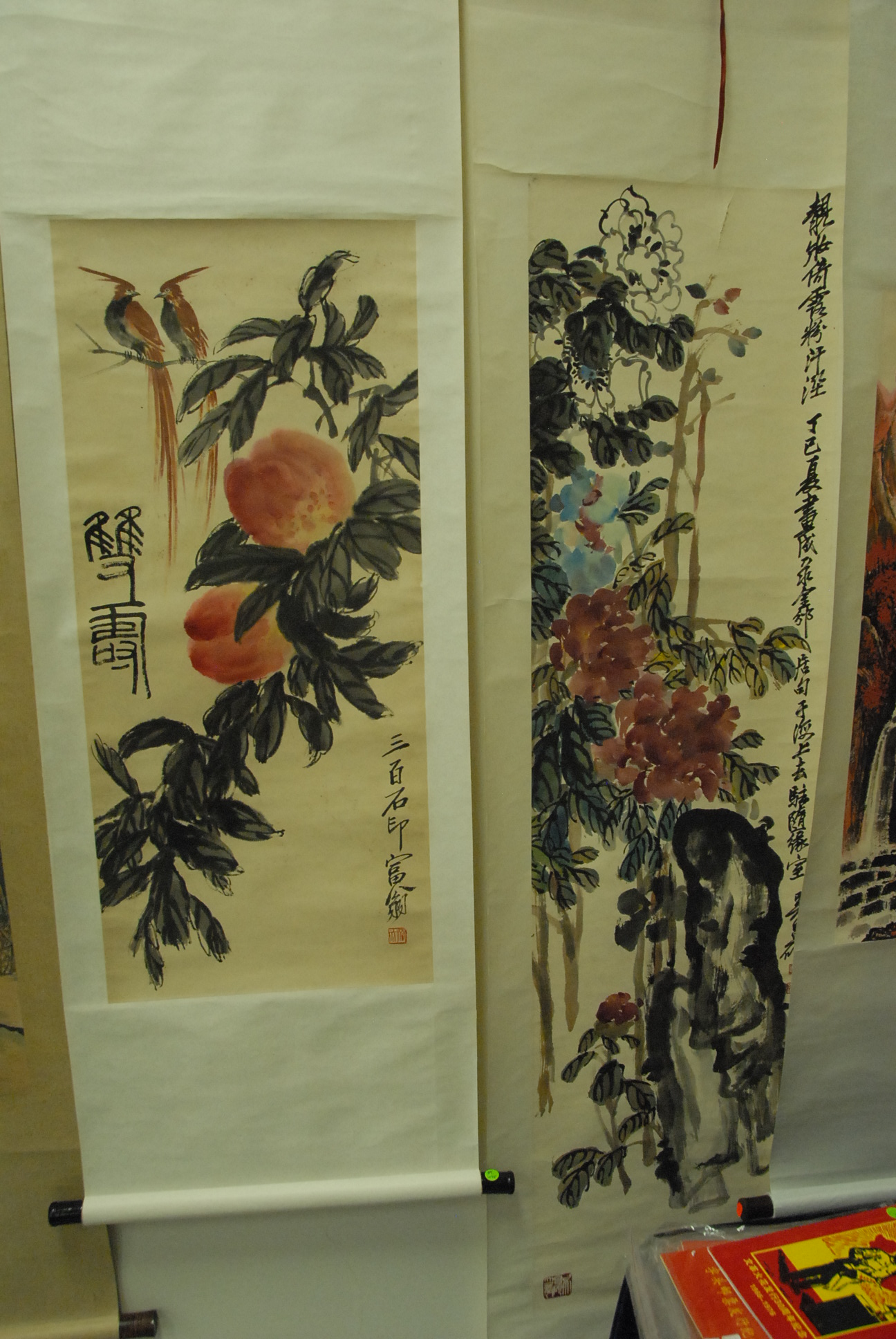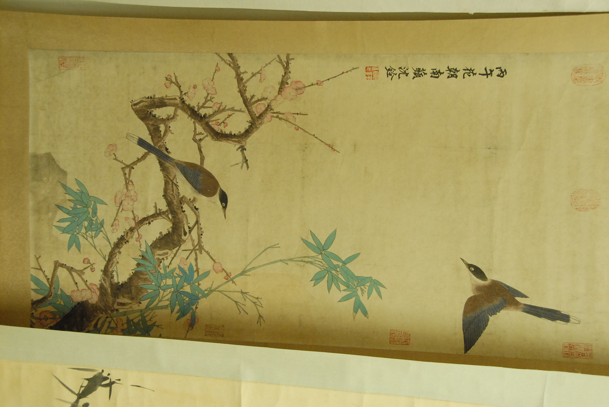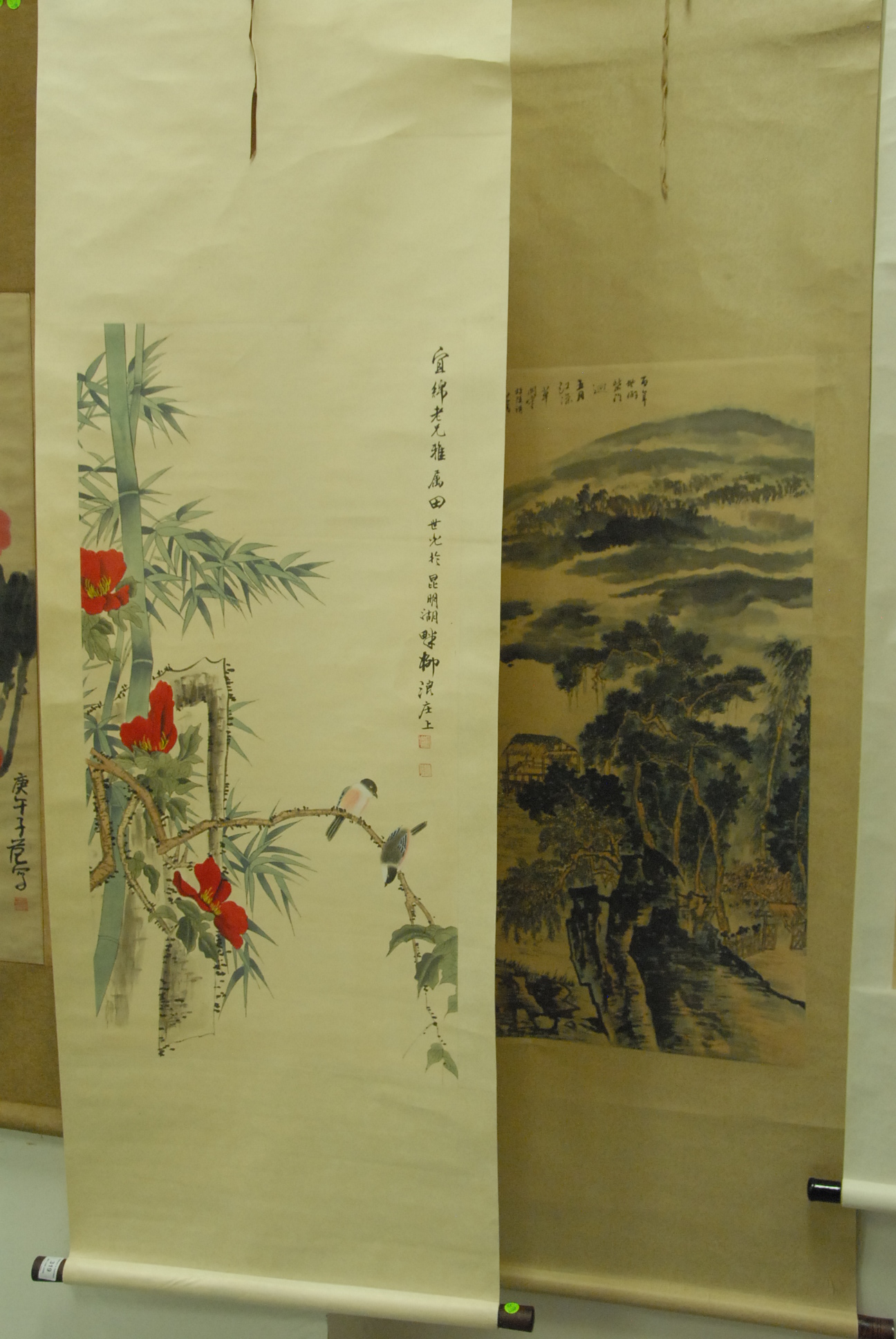 Chinese scroll painting of birds on camellia in a rock garden with bamboo tree and flowers and Chinese scroll painting of landscape with pine trees and a gazebo.