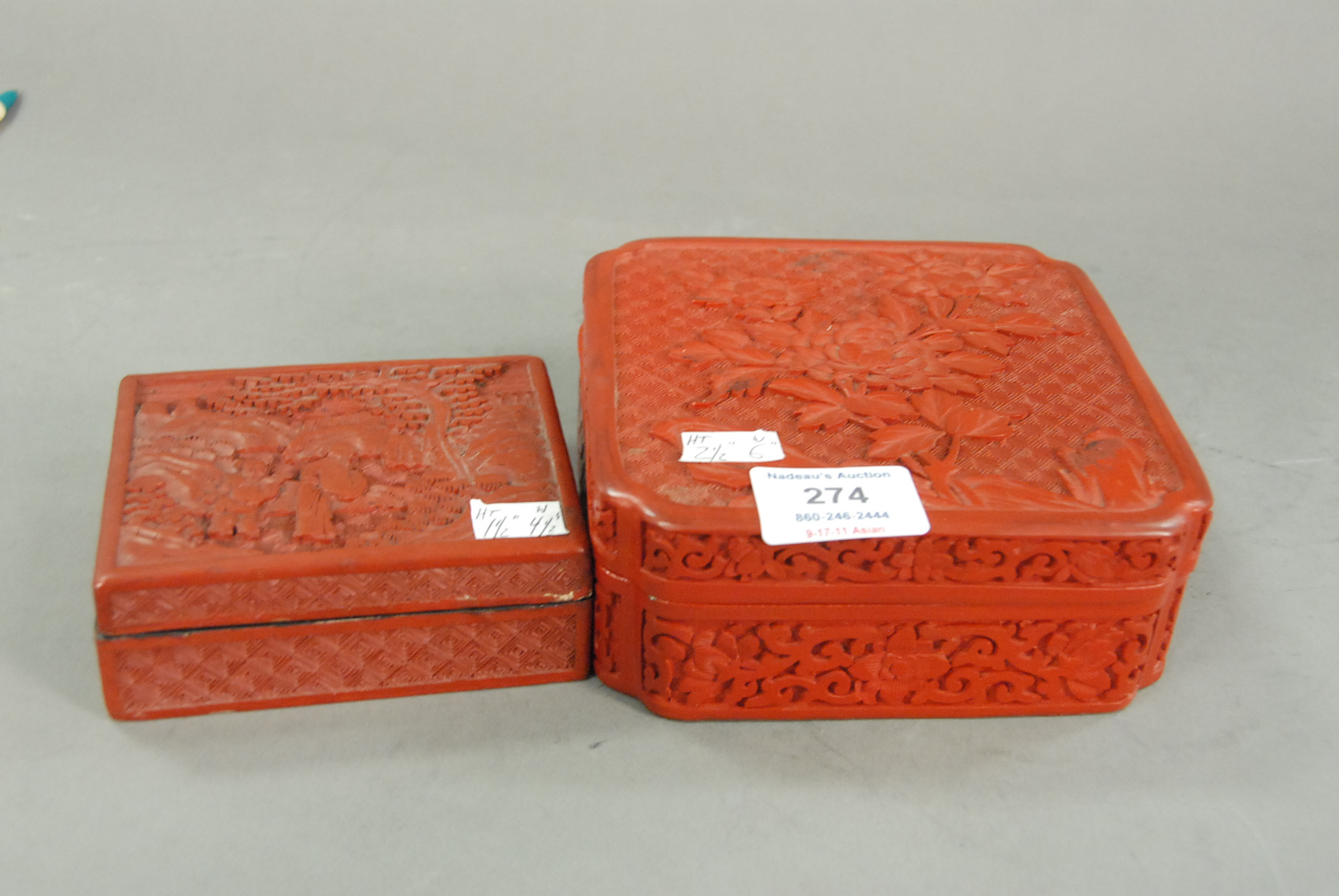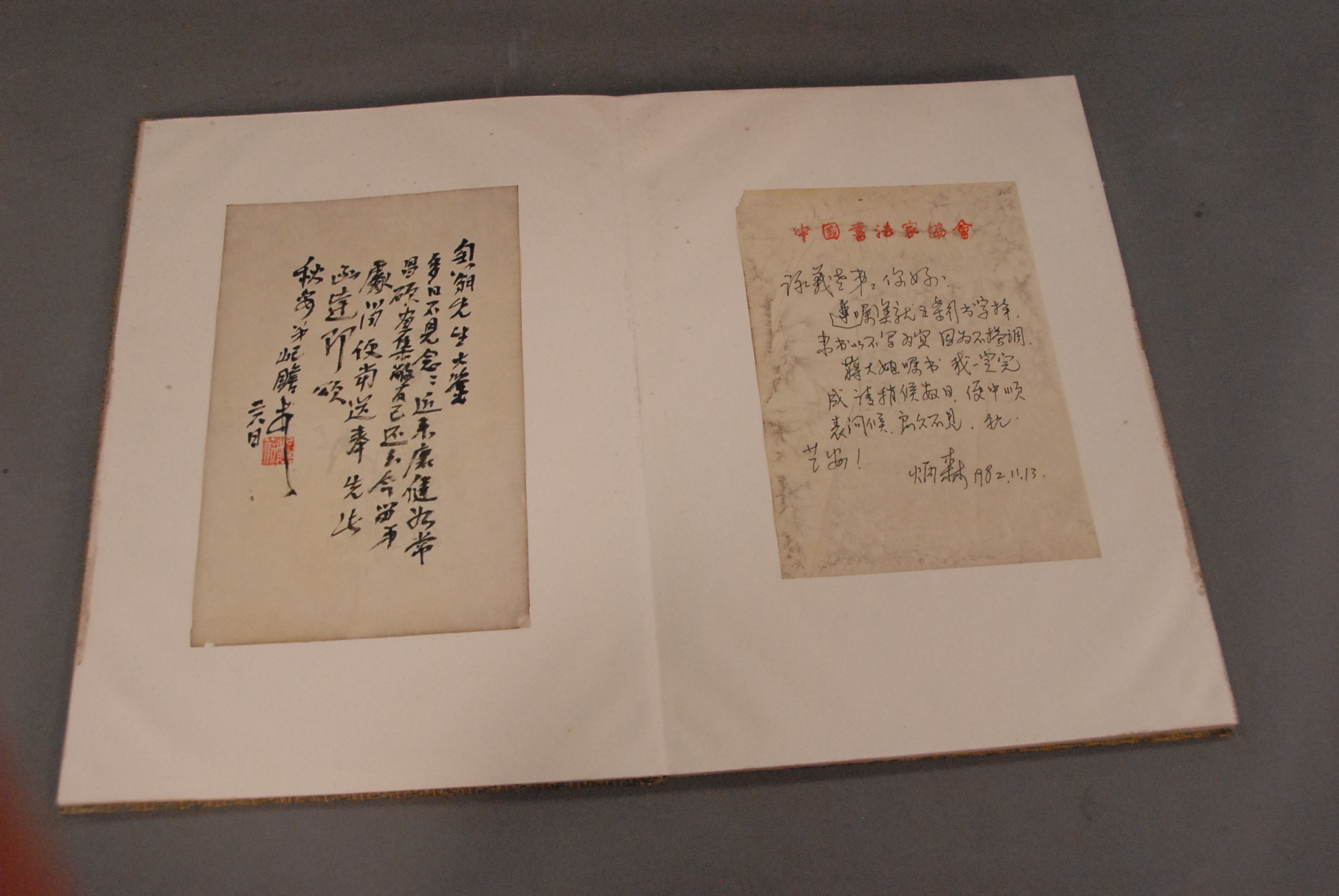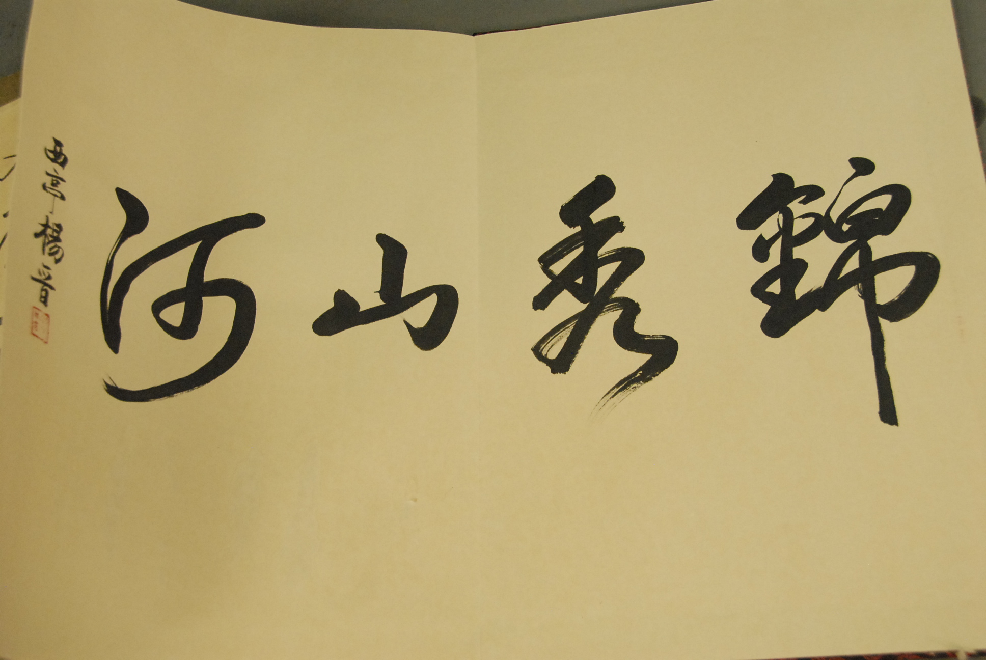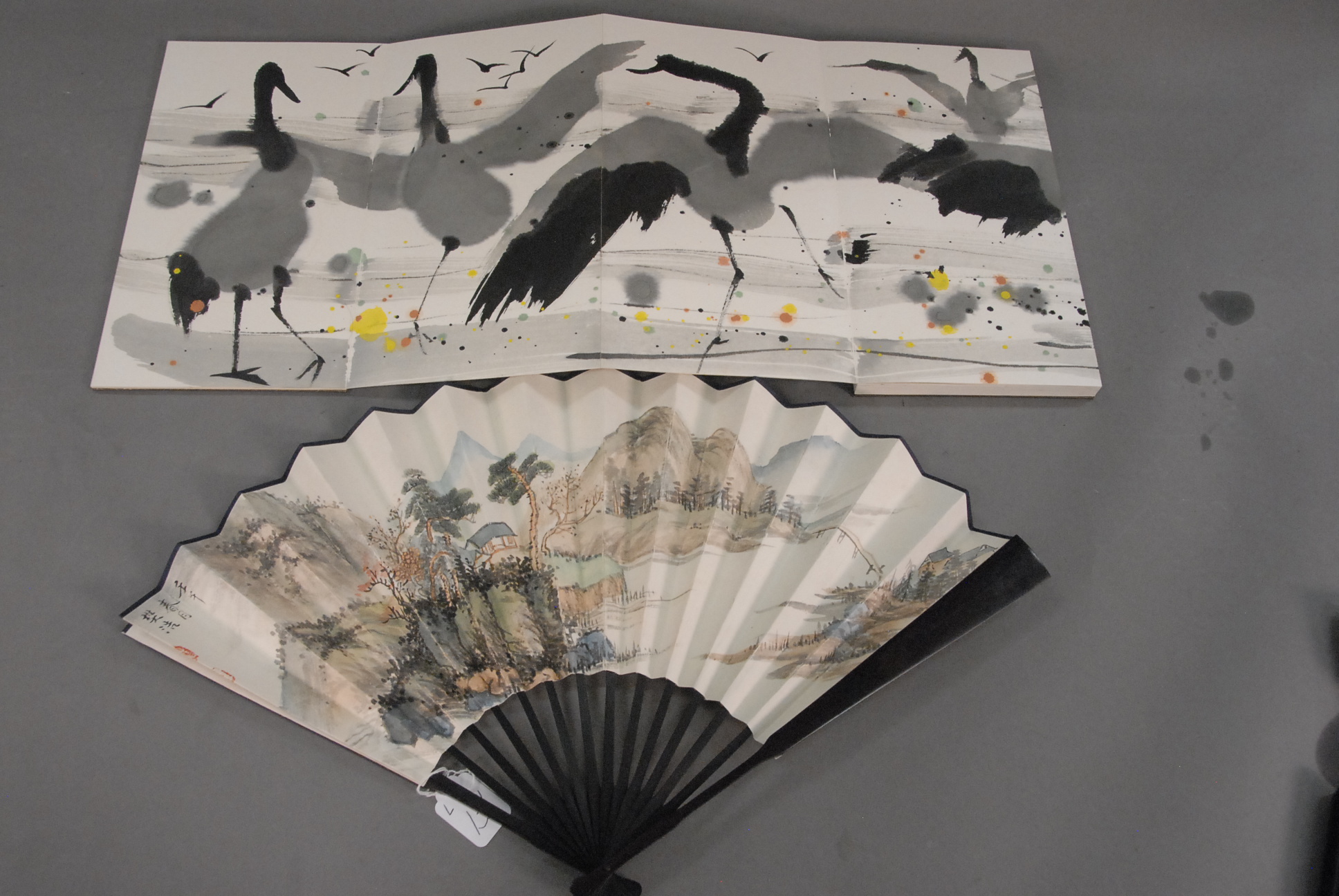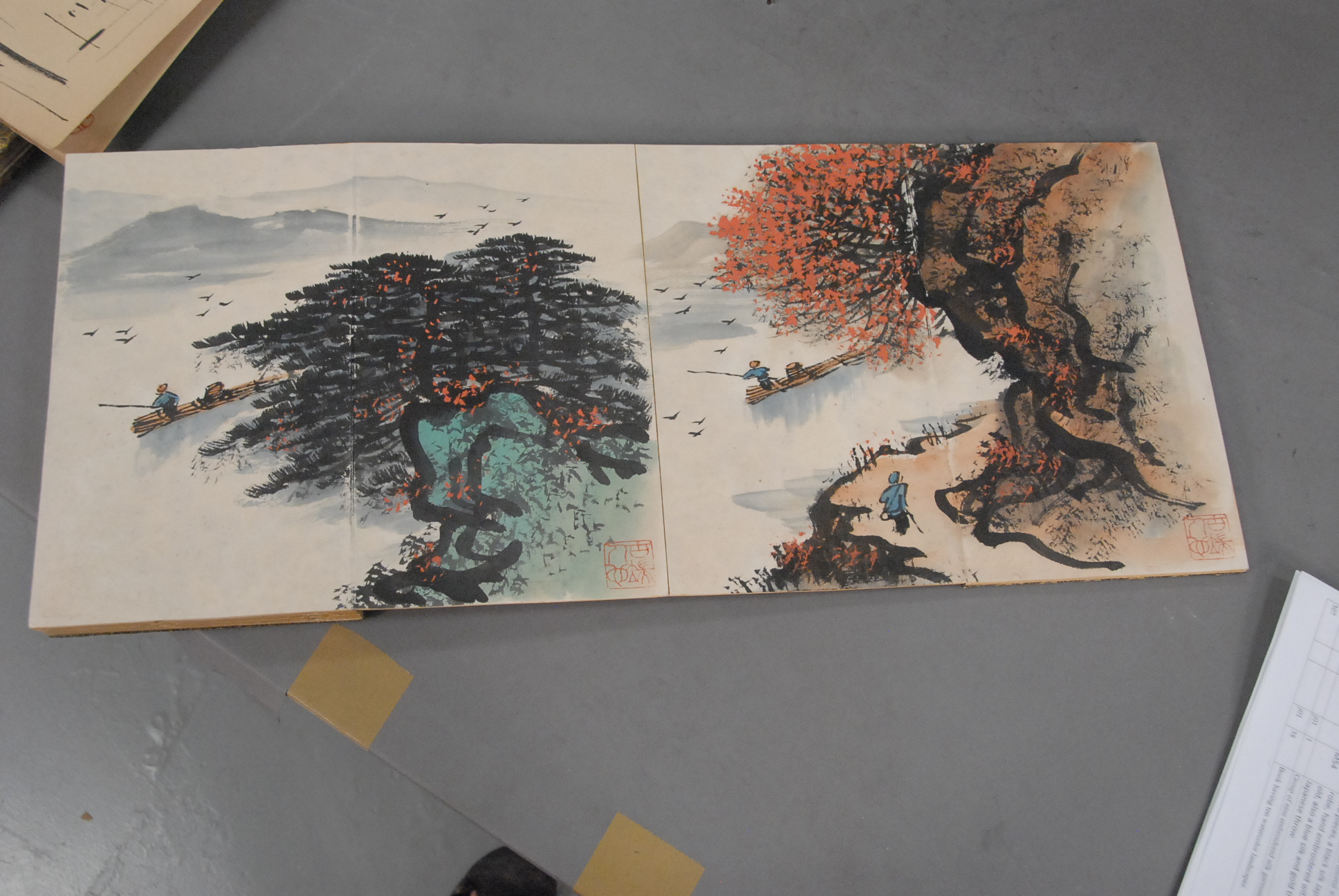 Chinese scroll painting of birds on camellia in a rock garden with bamboo tree and flowers and Chinese scroll painting of landscape with pine trees and a gazebo.