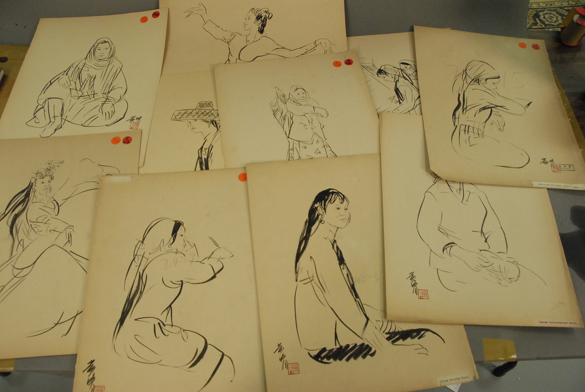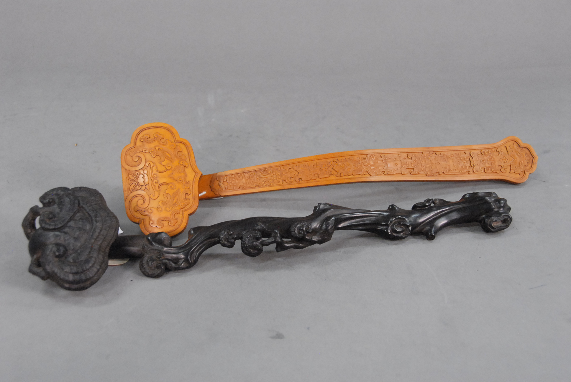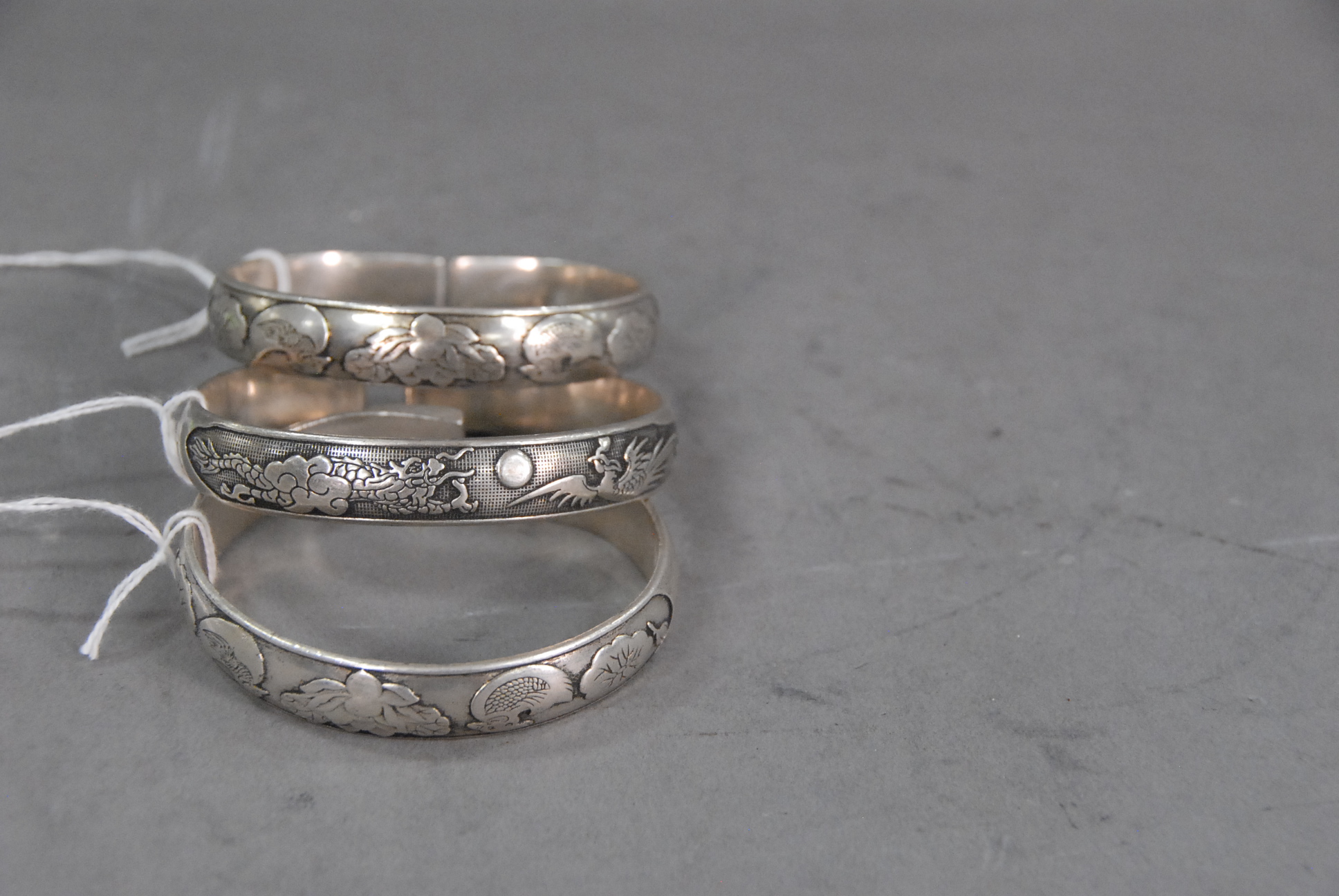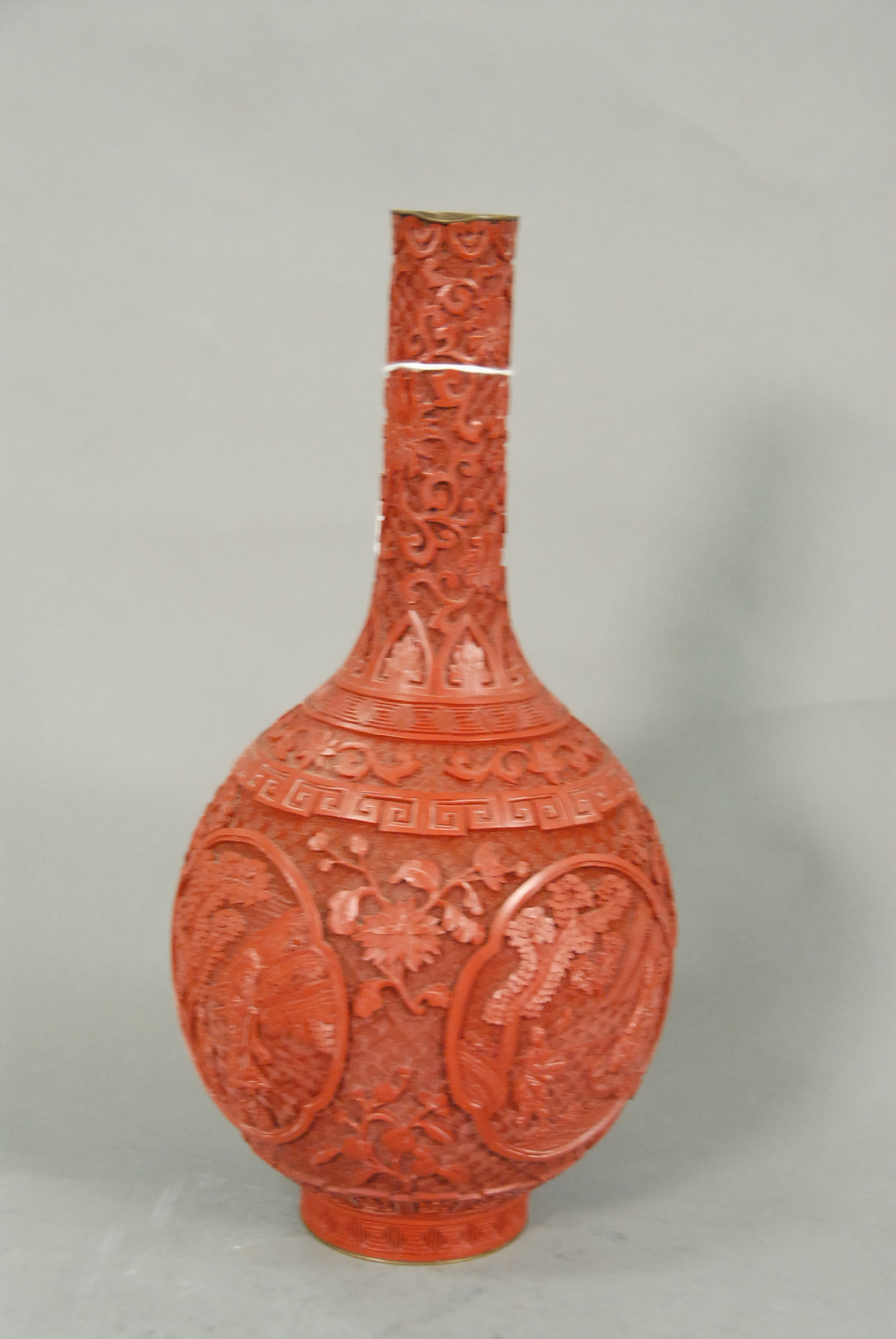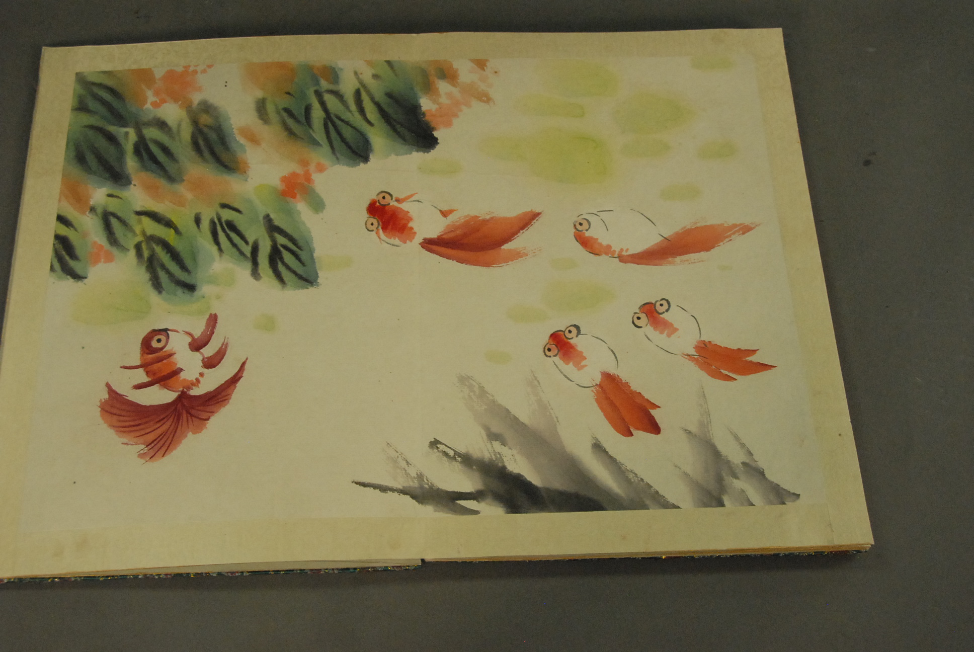 Chinese scroll painting of birds on camellia in a rock garden with bamboo tree and flowers and Chinese scroll painting of landscape with pine trees and a gazebo.