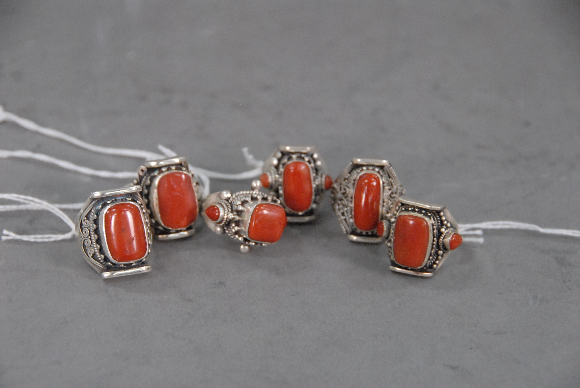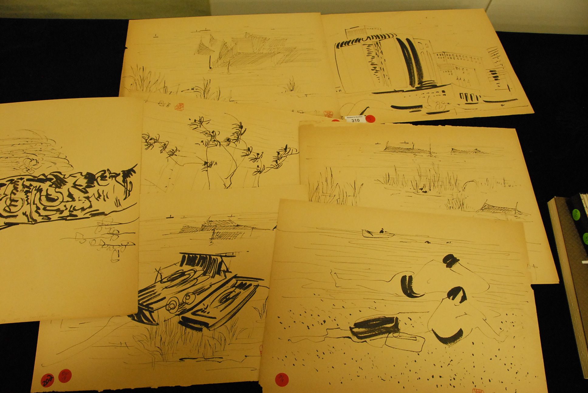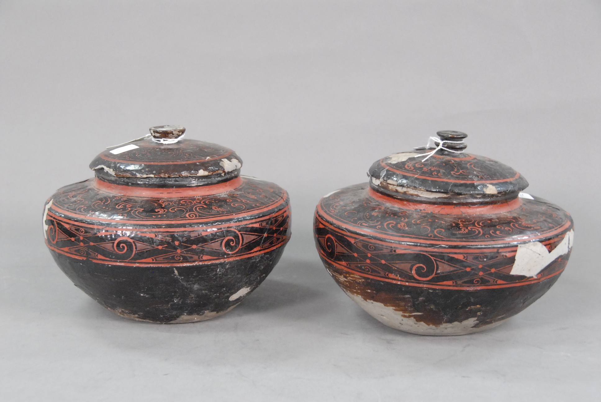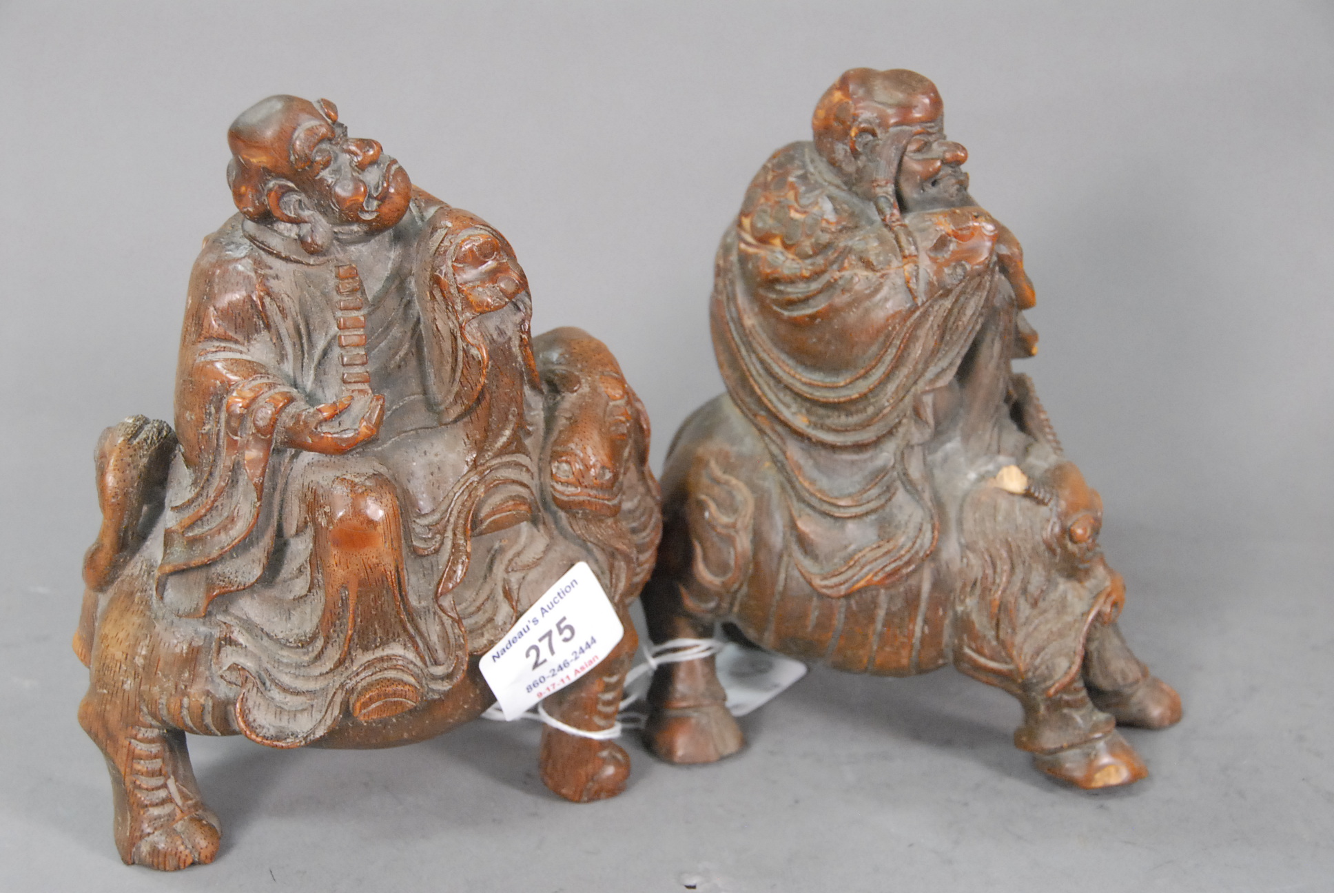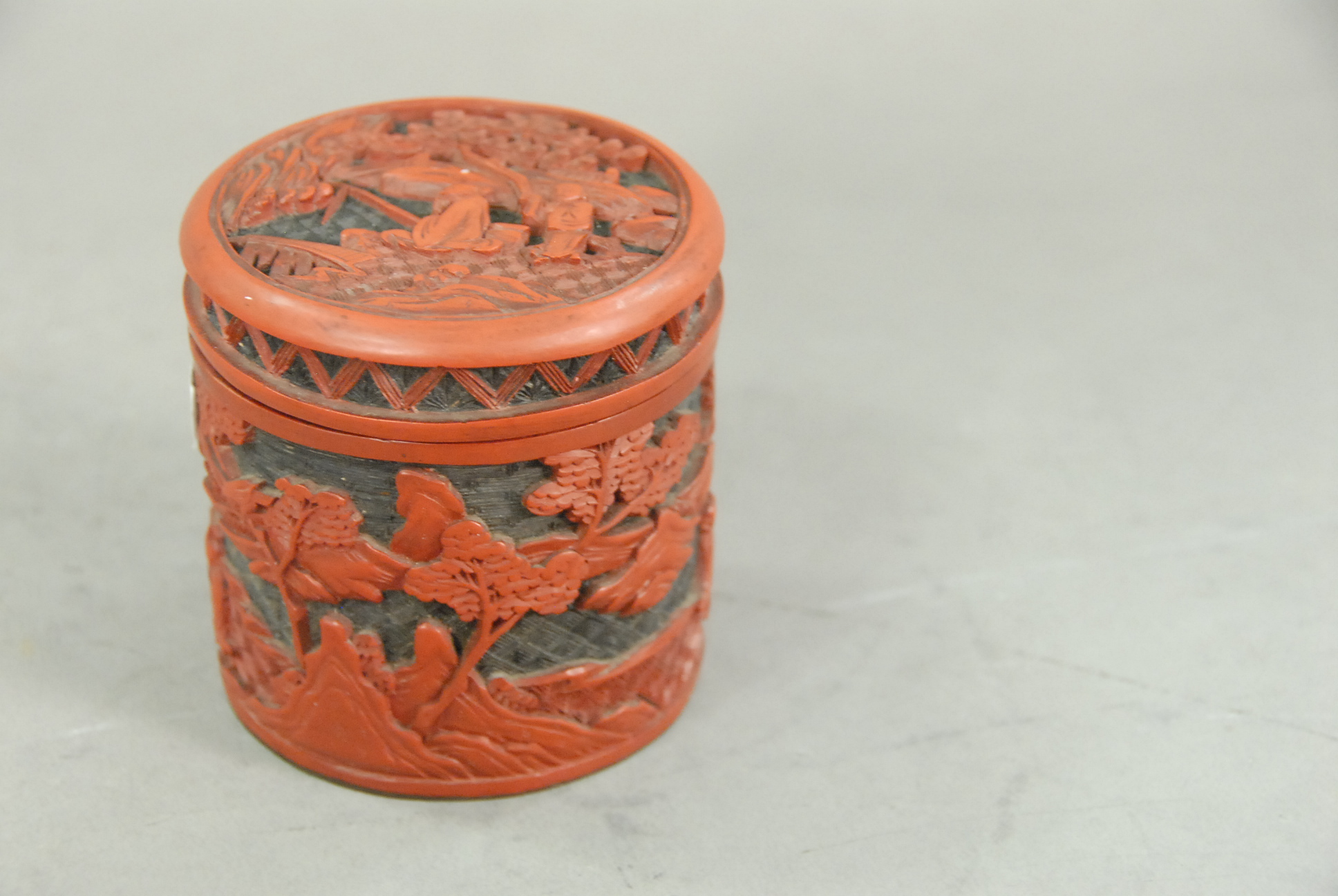 Chinese scroll painting of birds on camellia in a rock garden with bamboo tree and flowers and Chinese scroll painting of landscape with pine trees and a gazebo.