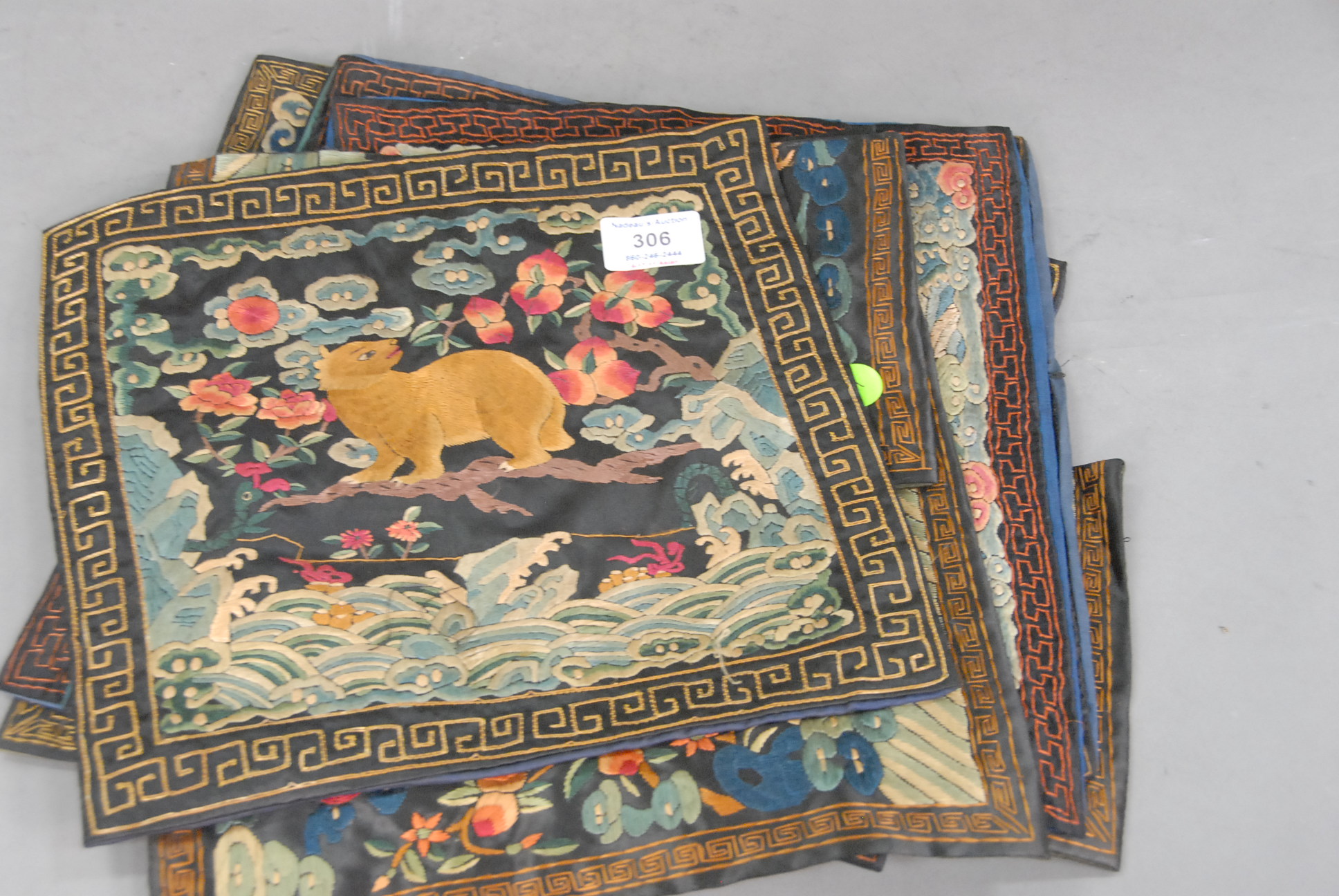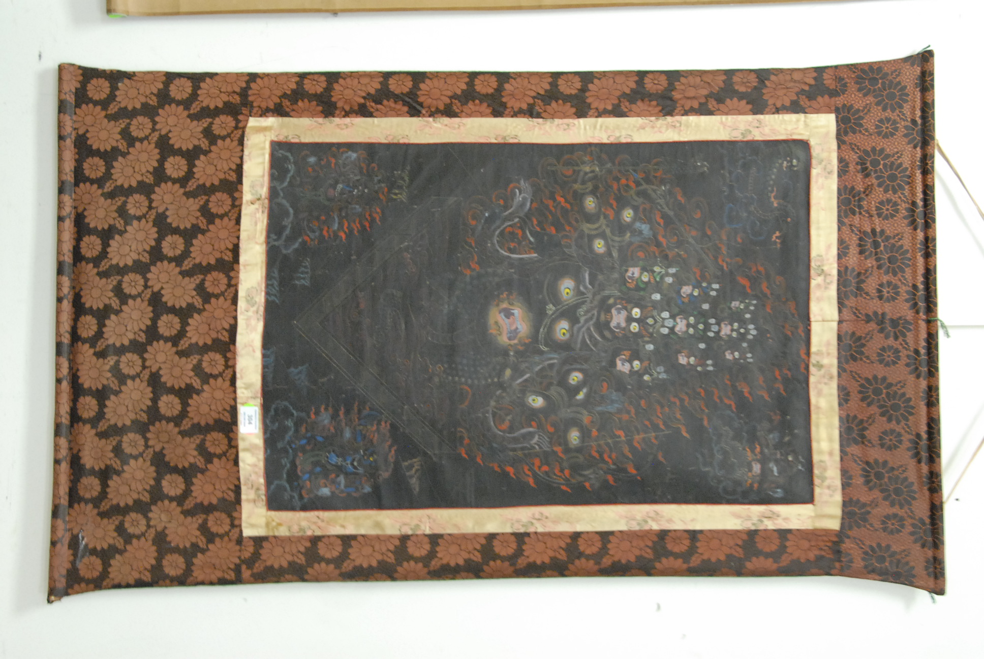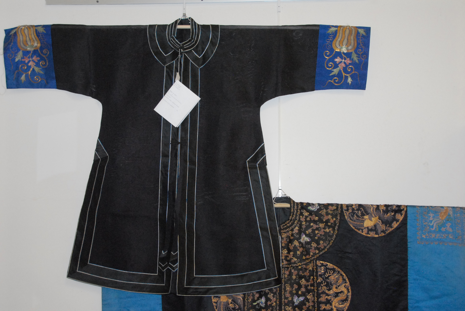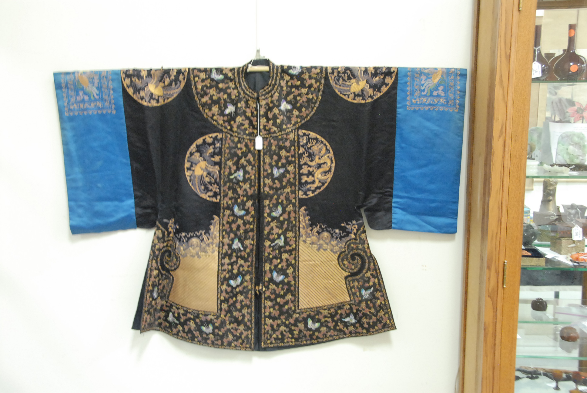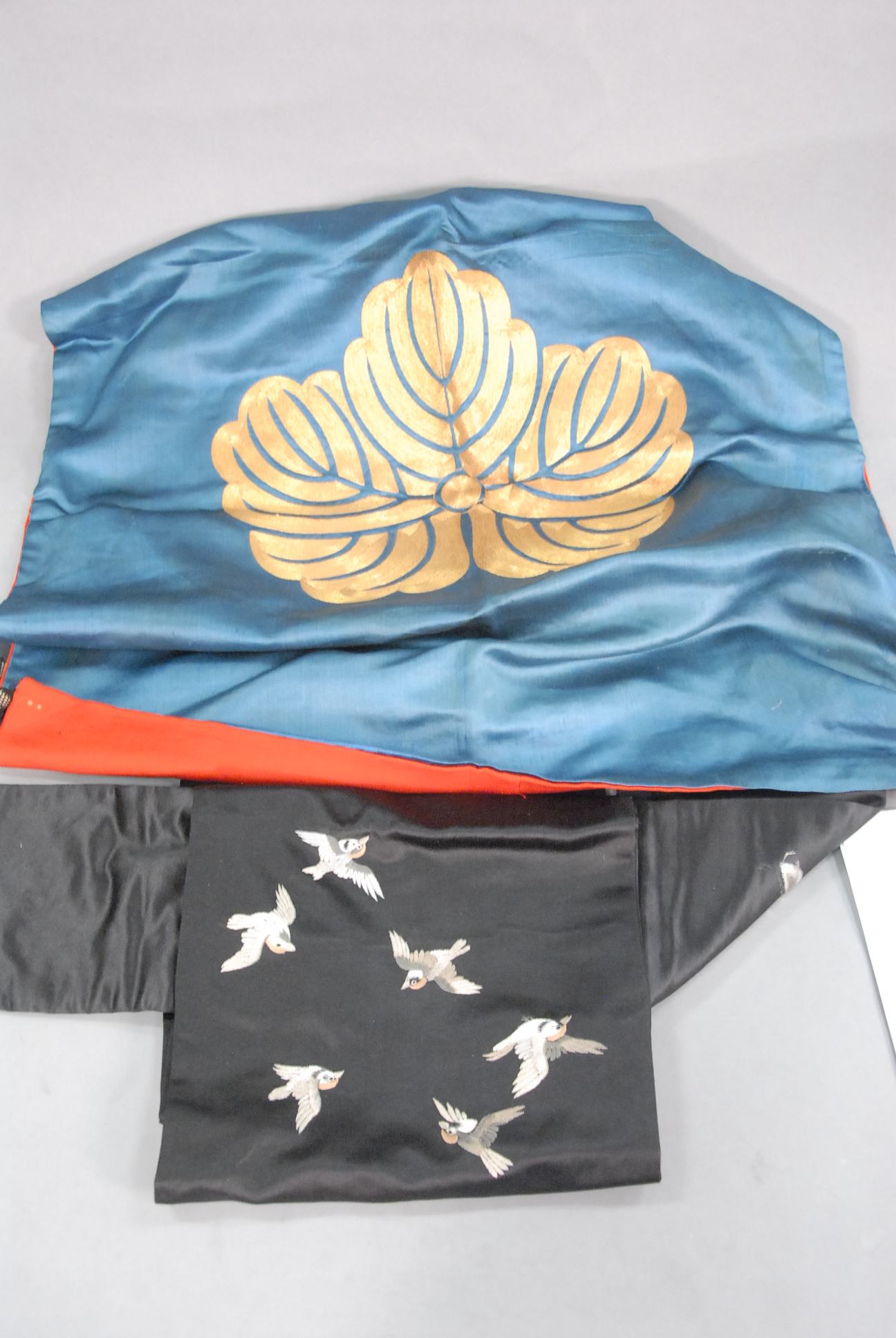 Two piece lot: a black silk Japanese piece of robe, hand embroidered with swallows, 120 yrs old, and a blue silk and gold thread medallion Japanese throw.