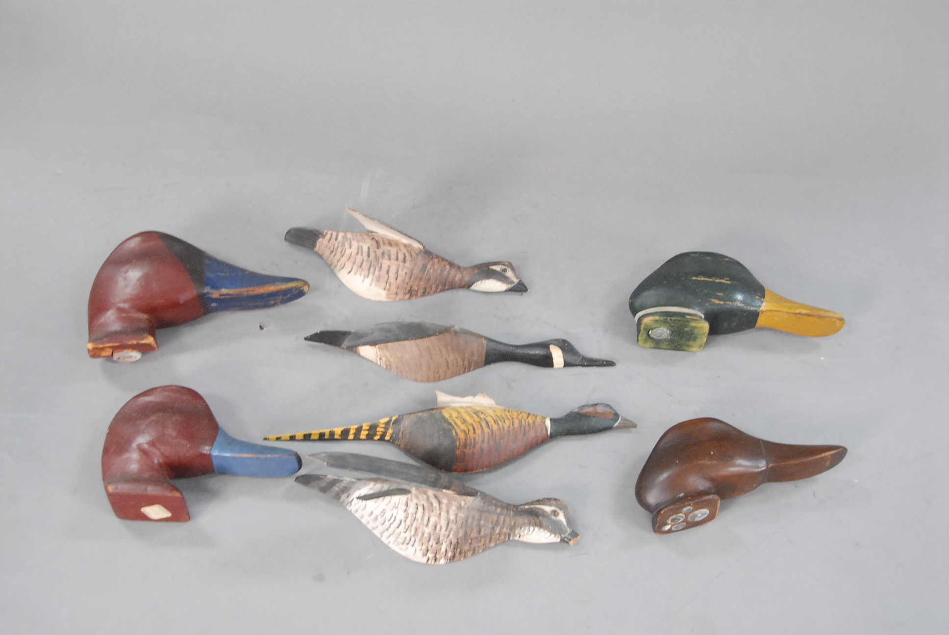 Group lot of eight pieces to include four wall mount 1/2 decoy miniature models and four duck decoy heads two Jack Snipes, one goose, one pheasant signed Roy Conklin Jr. One wing, one beak and feet as is.