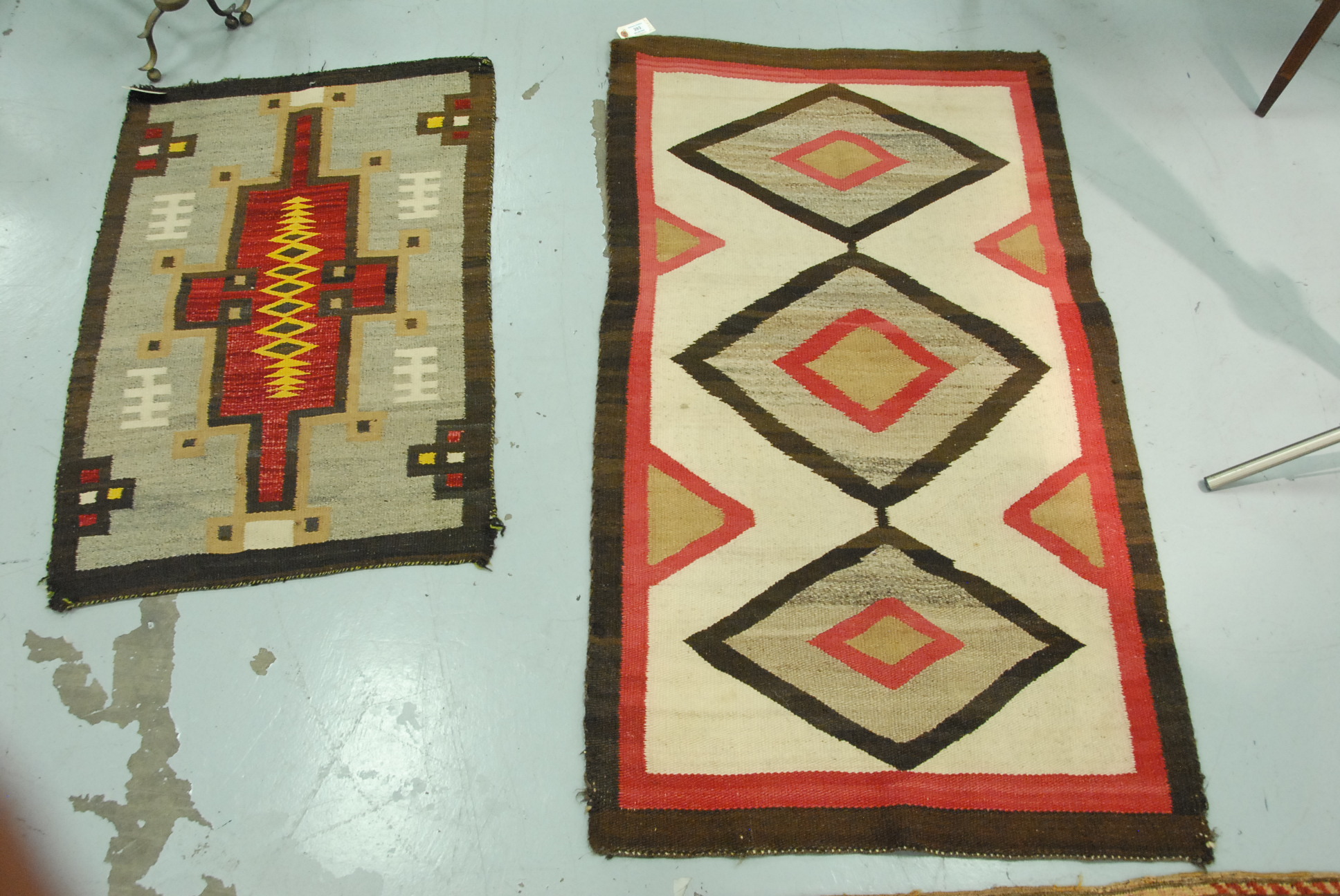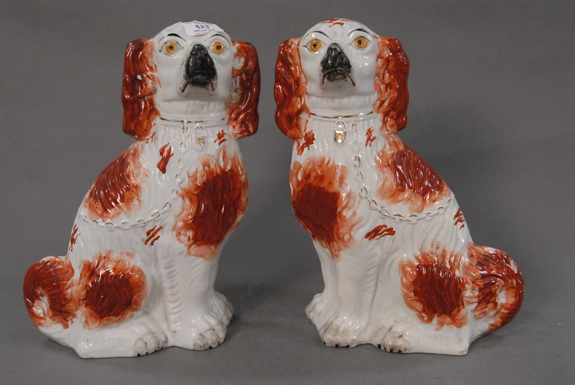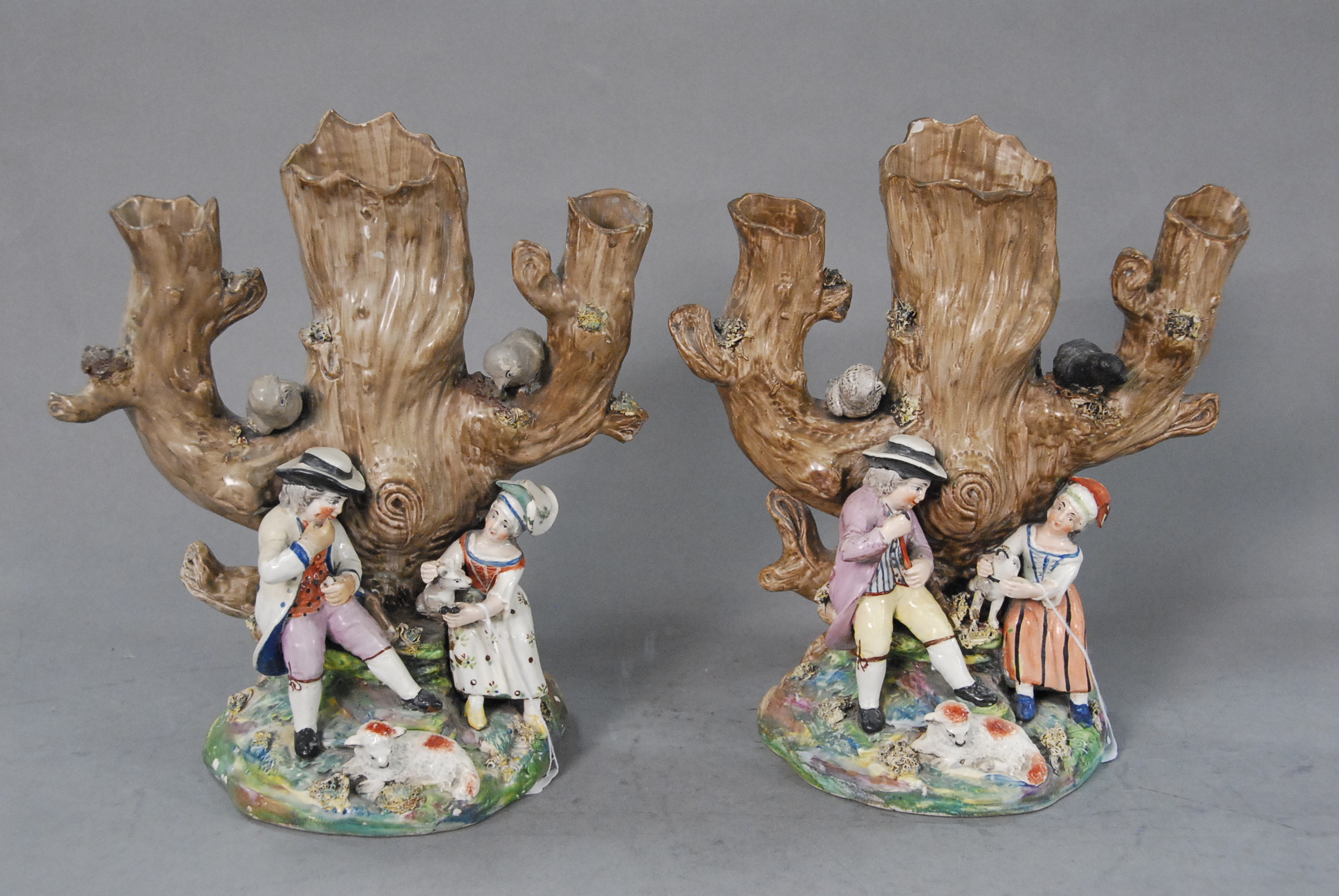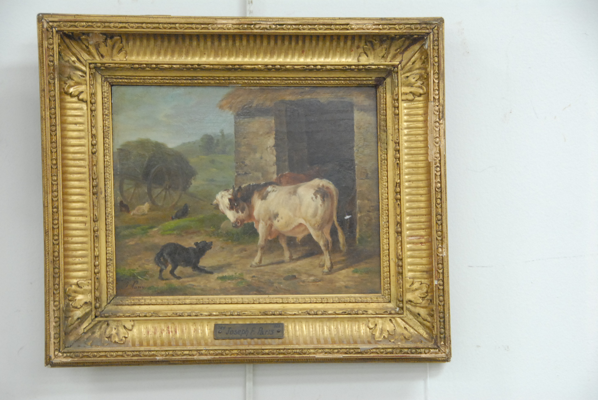 Pair of primitive oil on canvas portraits in matching period frames, 19th century. Unsigned. Portrait of a woman seated with a bird and black sheep. Portrait of a gentleman seated with a dog overlooking valley.