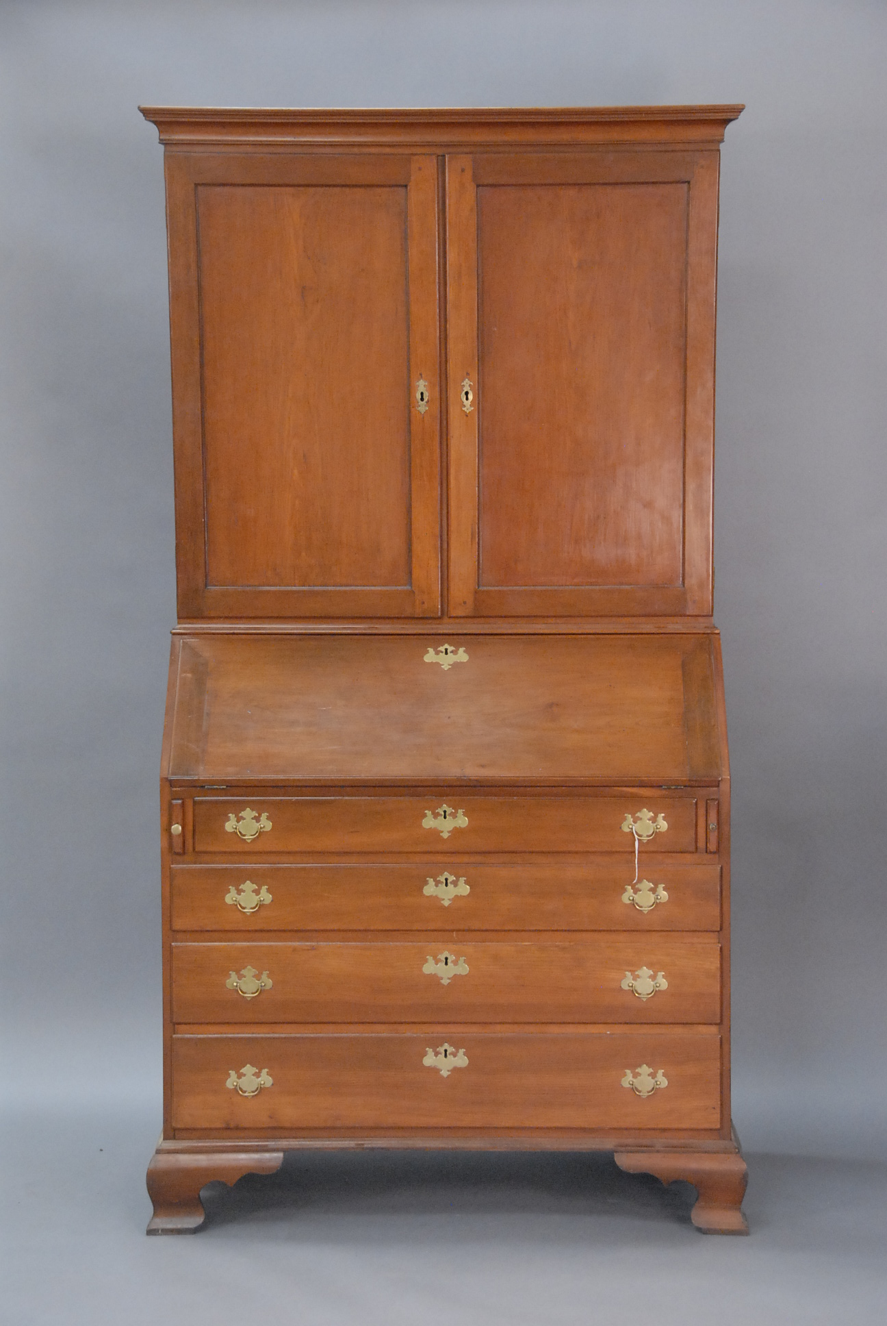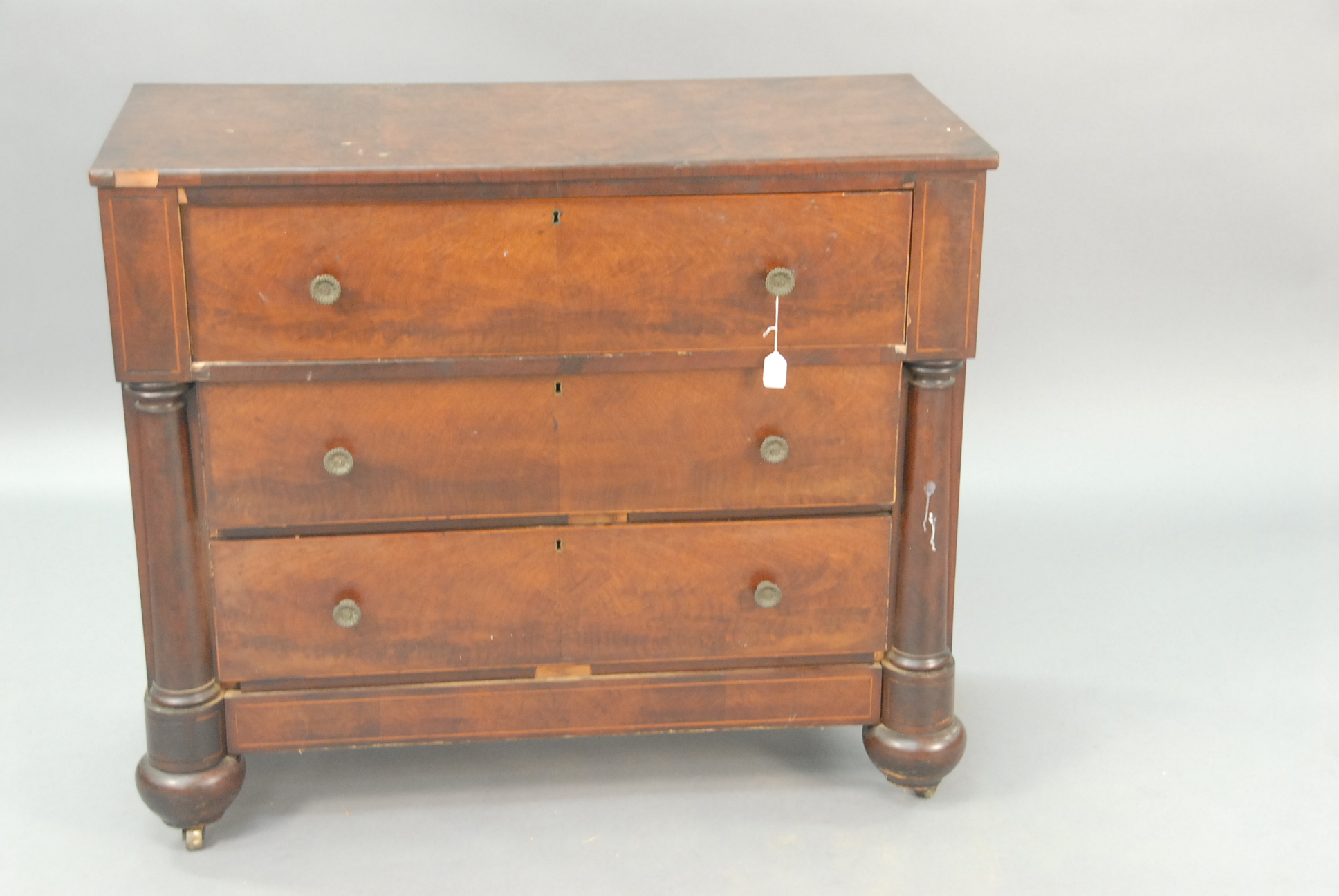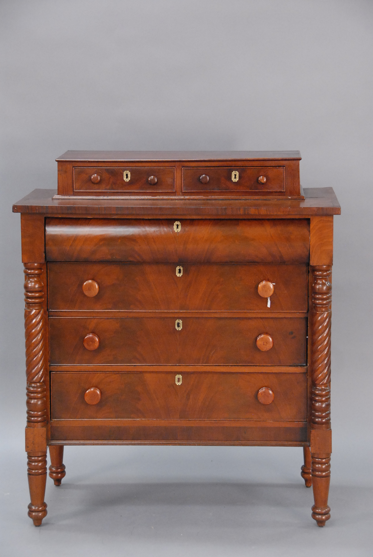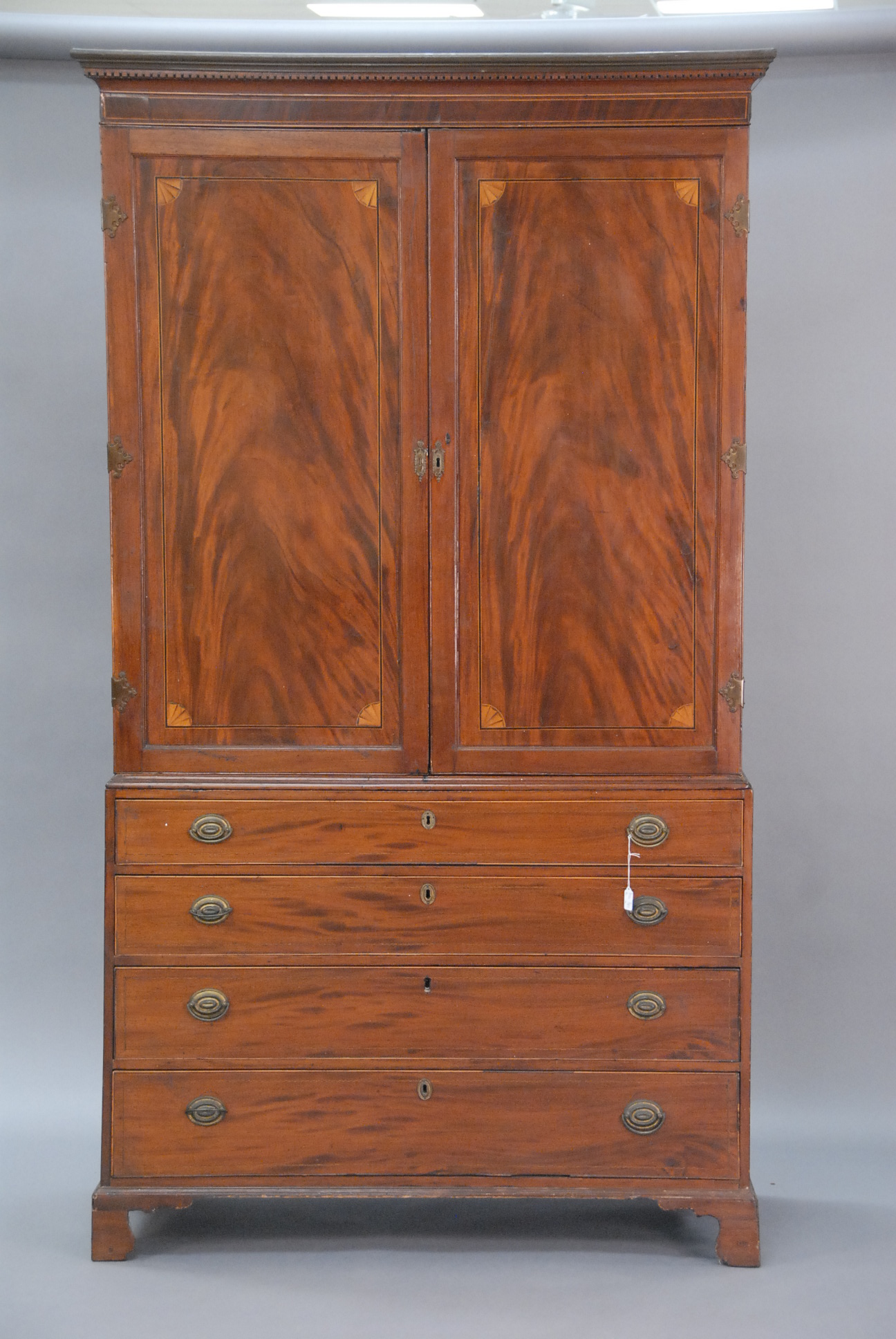 Mahogany and mahogany veneer linen press in two parts having two drawers over four drawers all set on cut out bracket feet, interior with three fitted drawers and one shelf all with line and fan inlay.