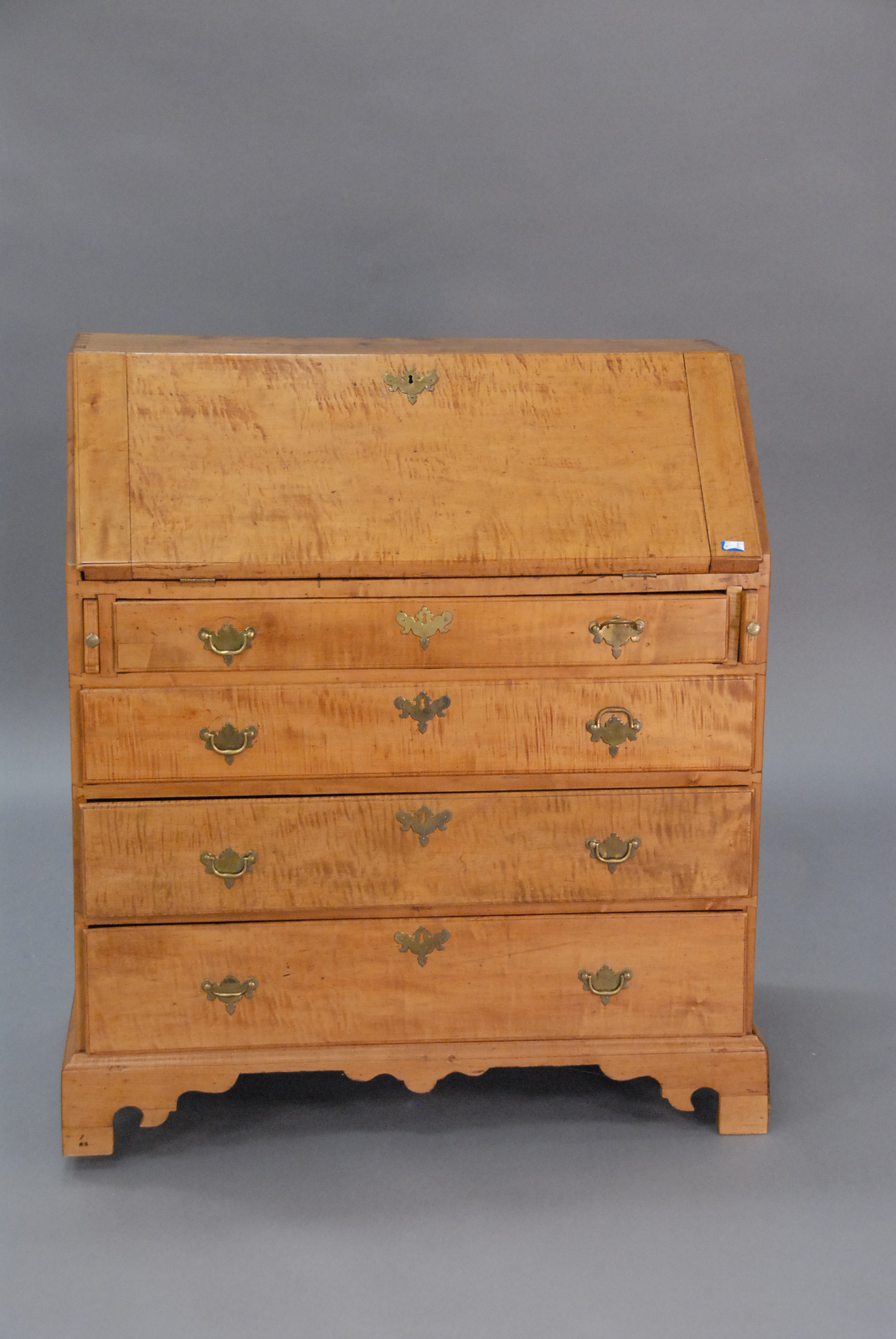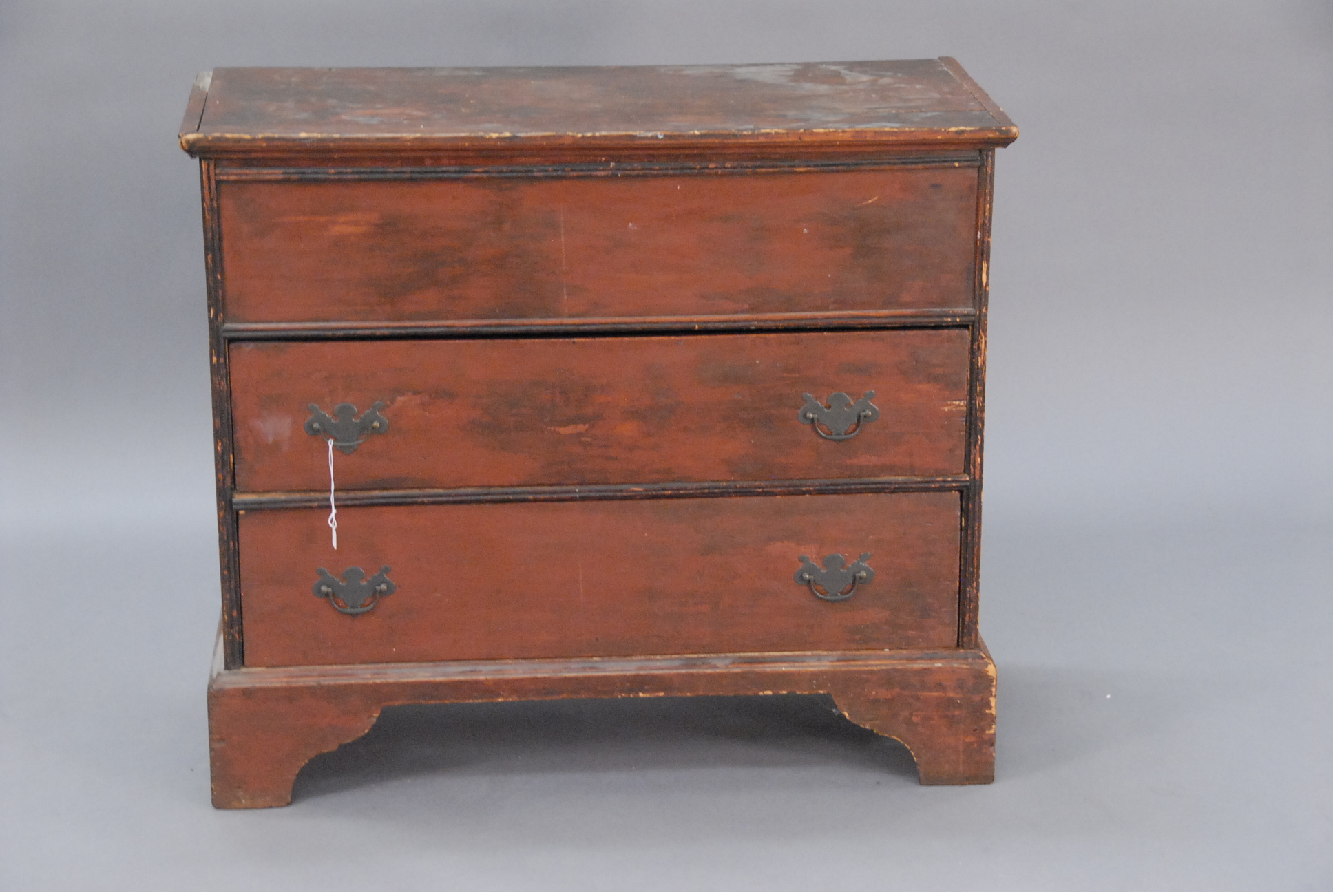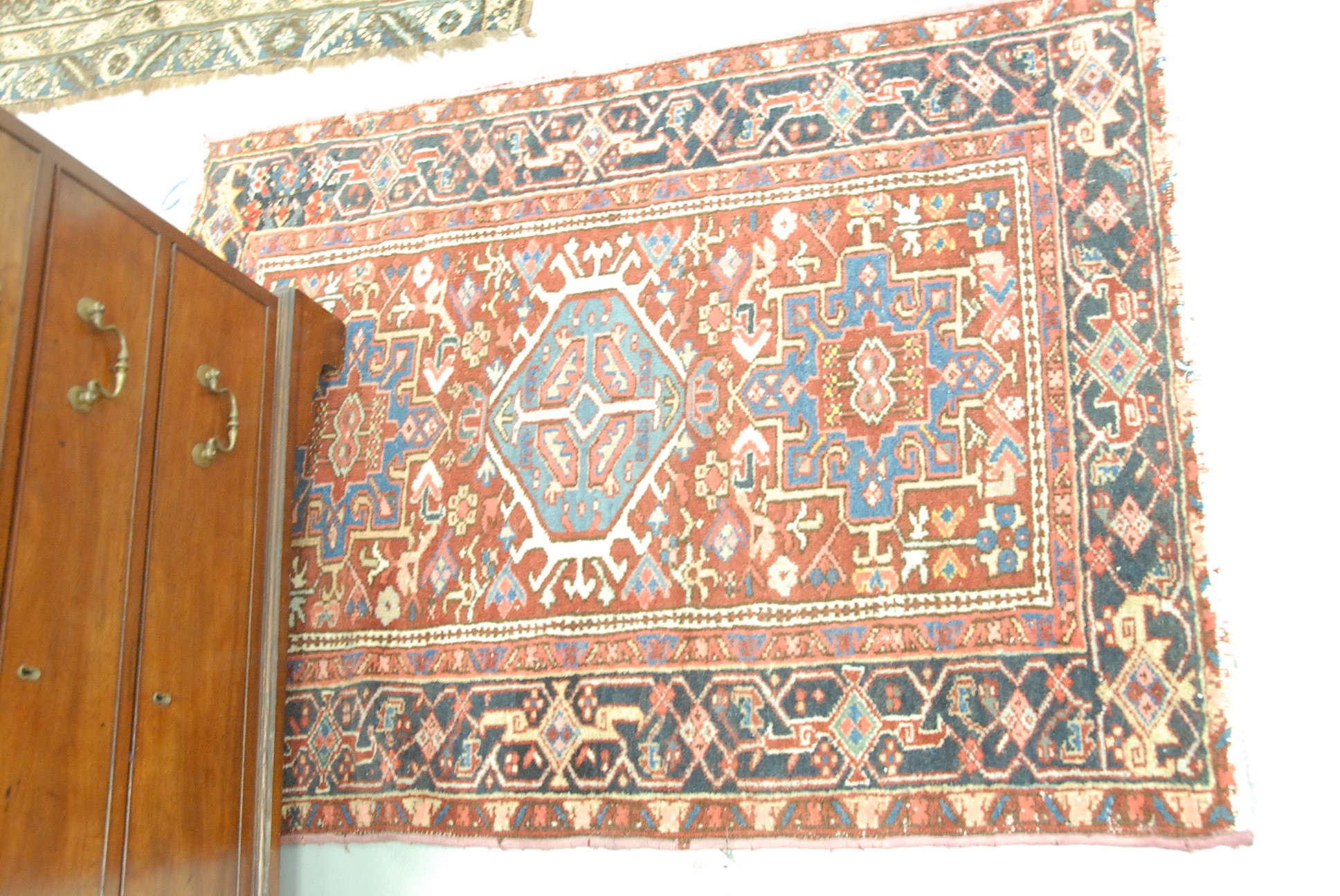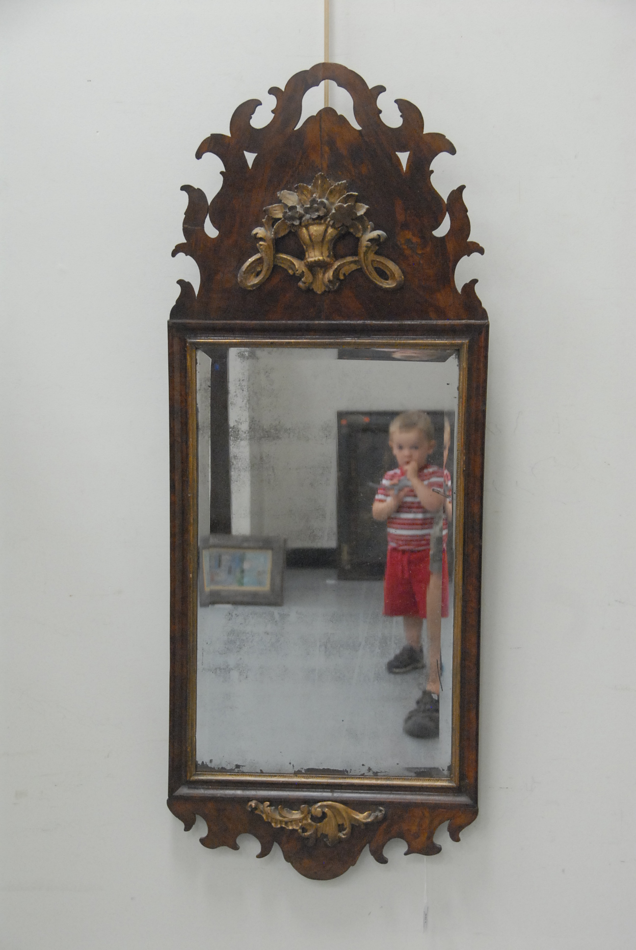 Mahogany and mahogany veneer linen press in two parts having two drawers over four drawers all set on cut out bracket feet, interior with three fitted drawers and one shelf all with line and fan inlay.