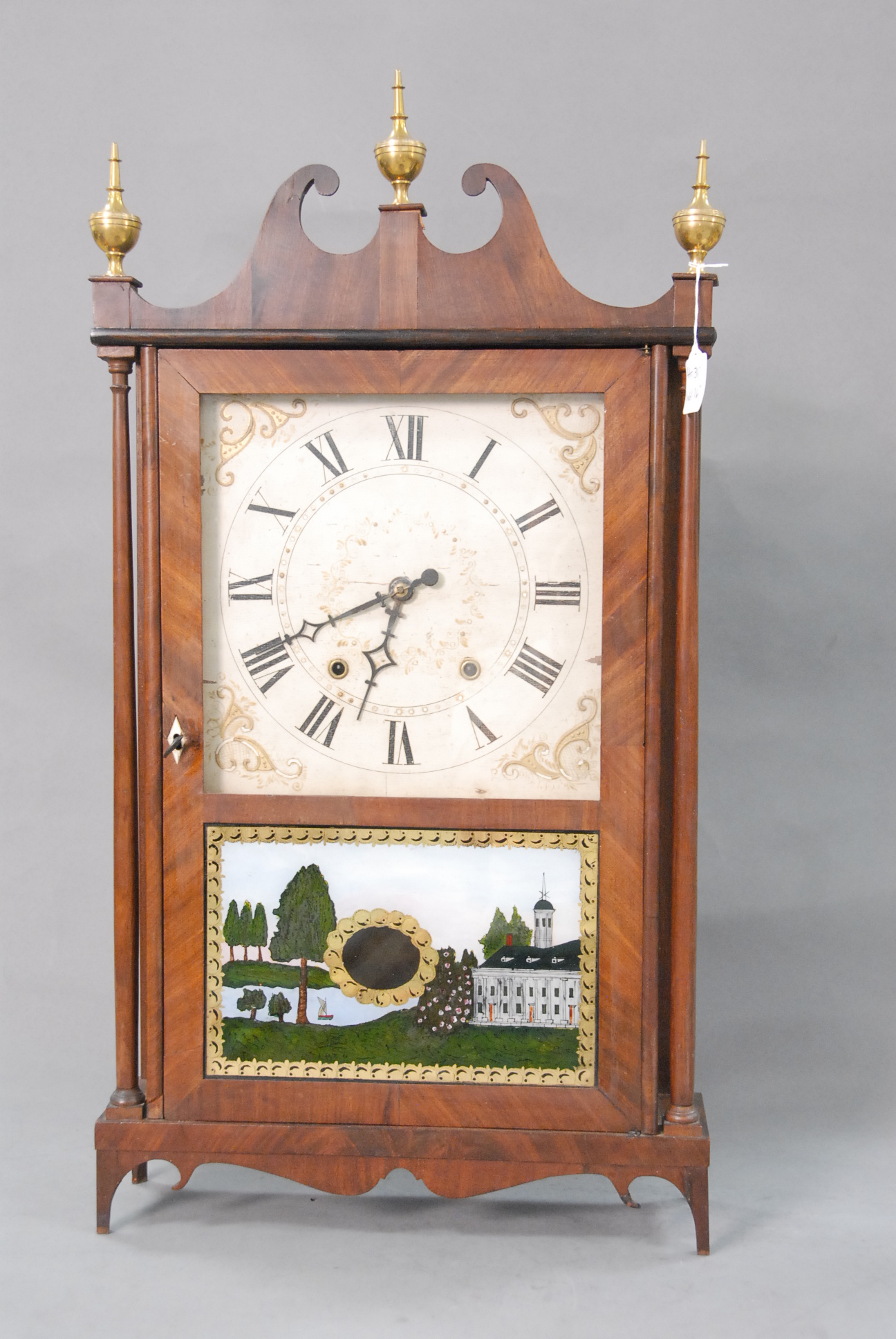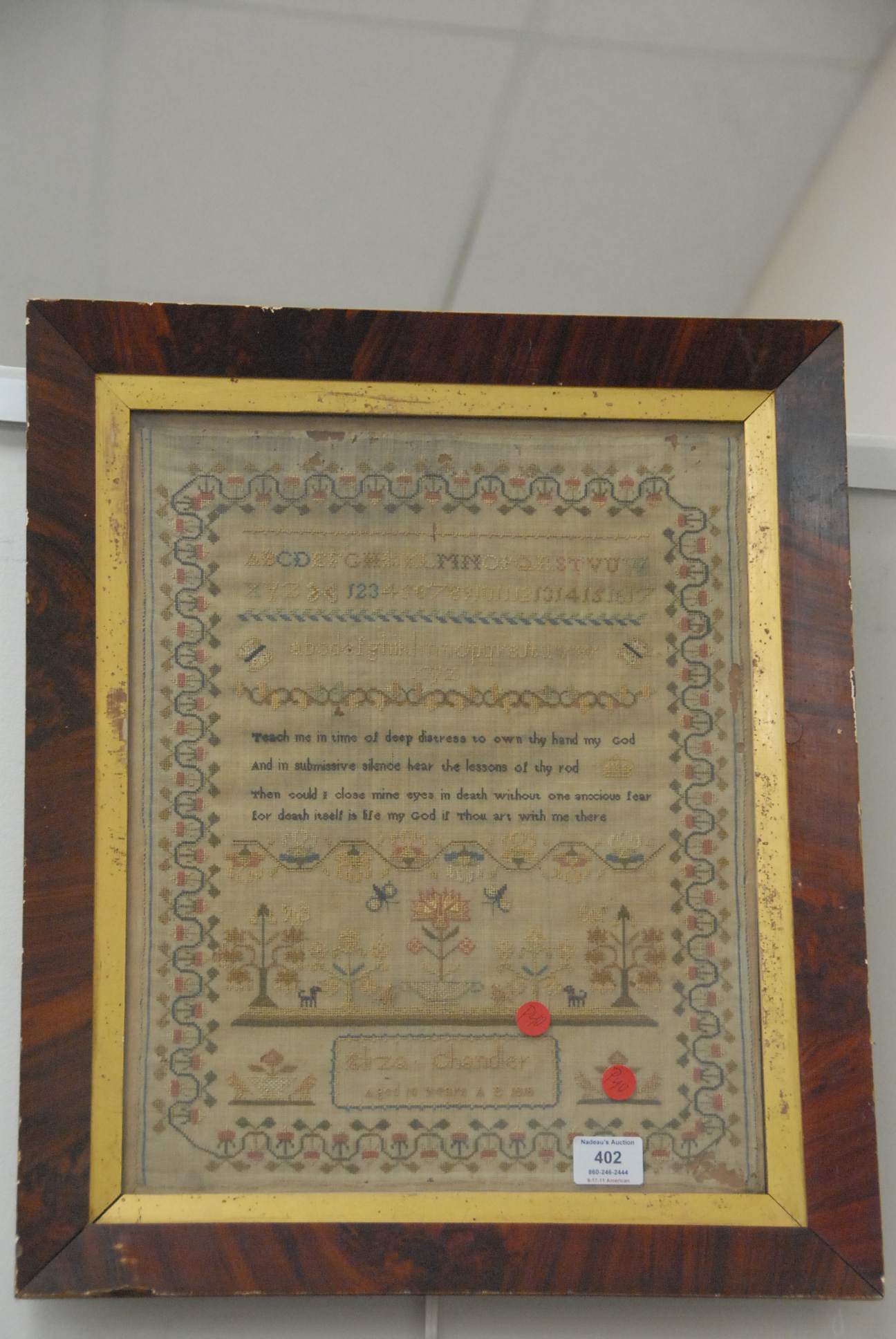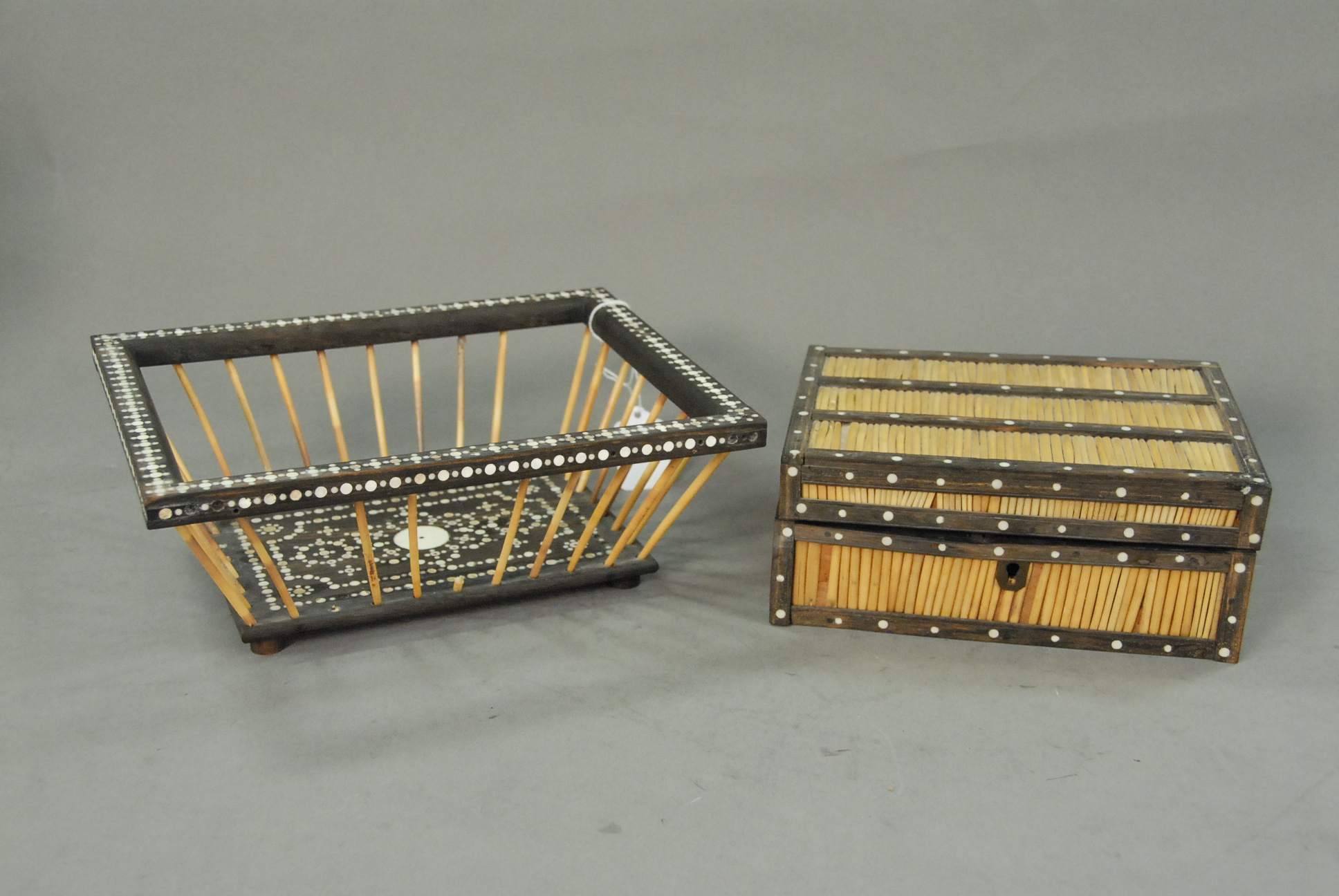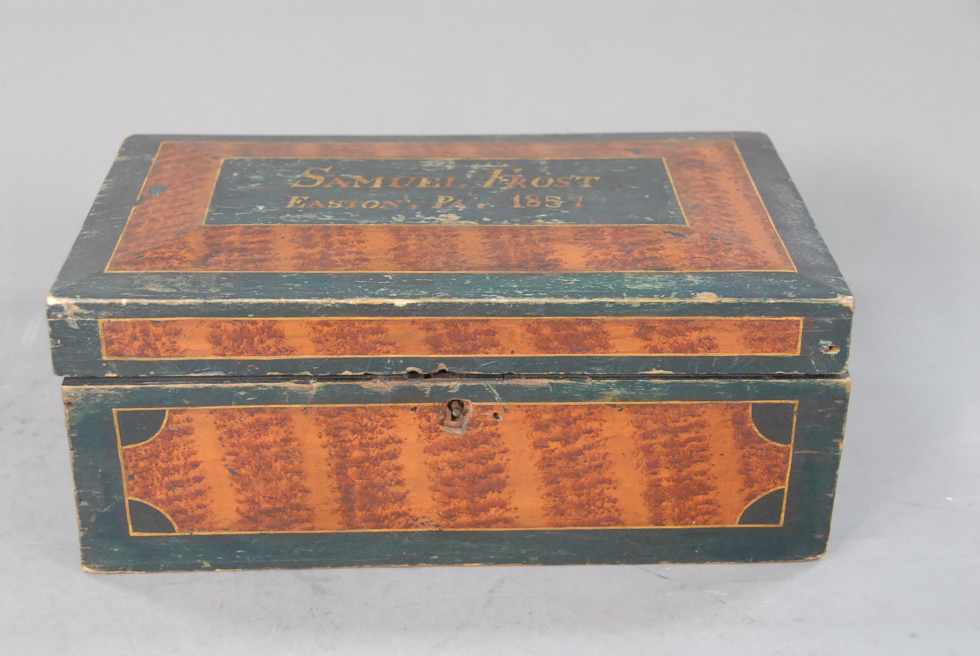 Mahogany and mahogany veneer linen press in two parts having two drawers over four drawers all set on cut out bracket feet, interior with three fitted drawers and one shelf all with line and fan inlay.