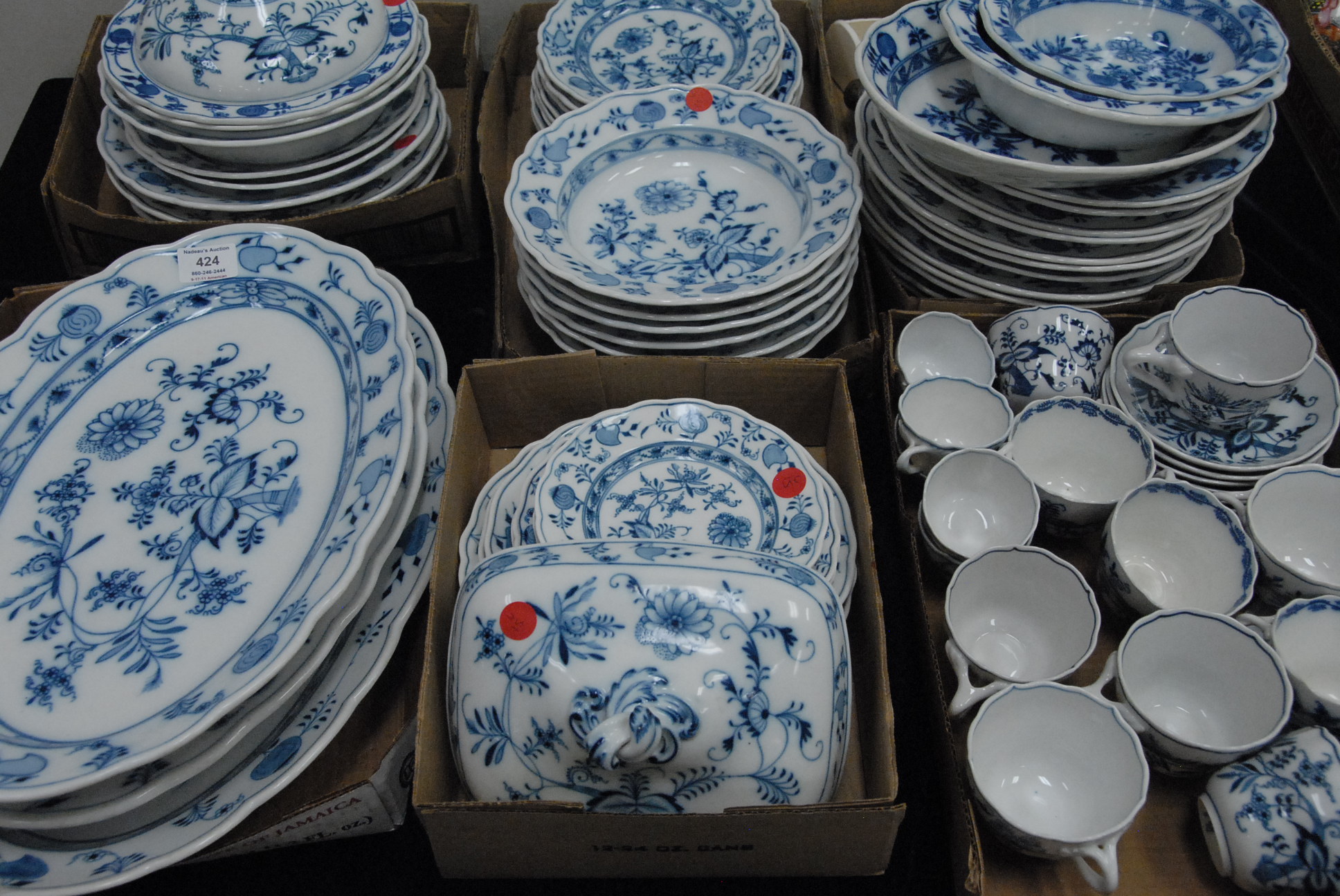 Assembled set of Meissen china, blue onion pattern to include three large platters, serving dishes, bowls, various plates, cups and saucers, 97 total pieces