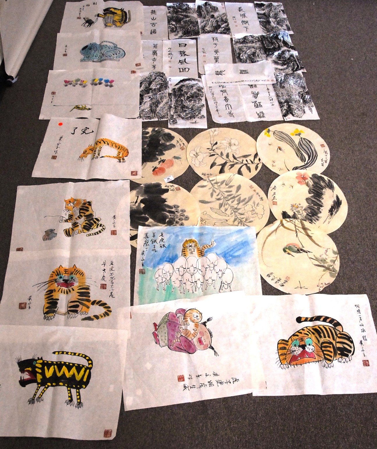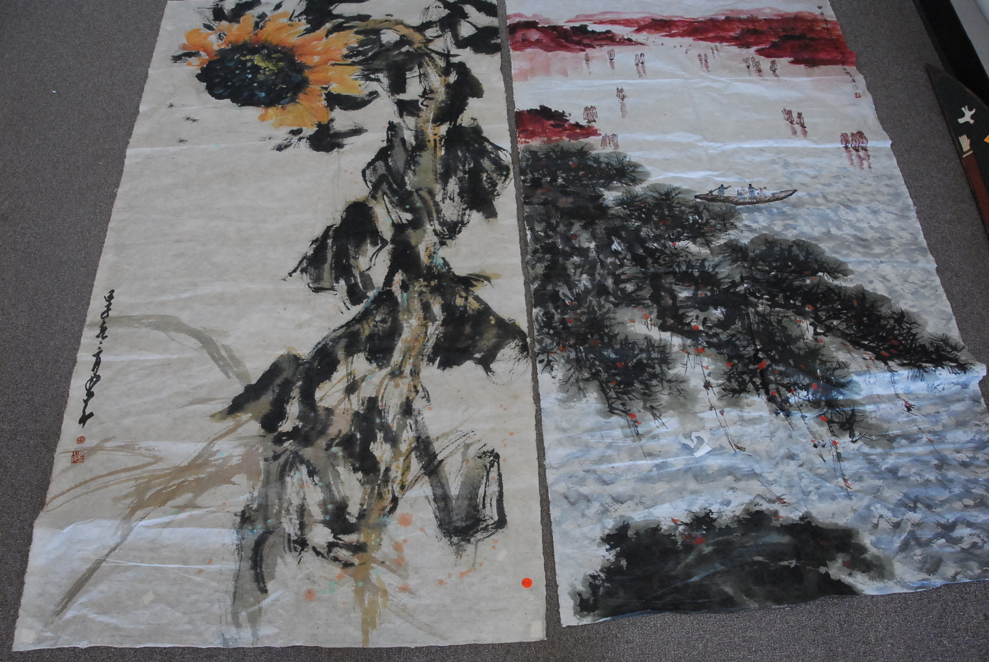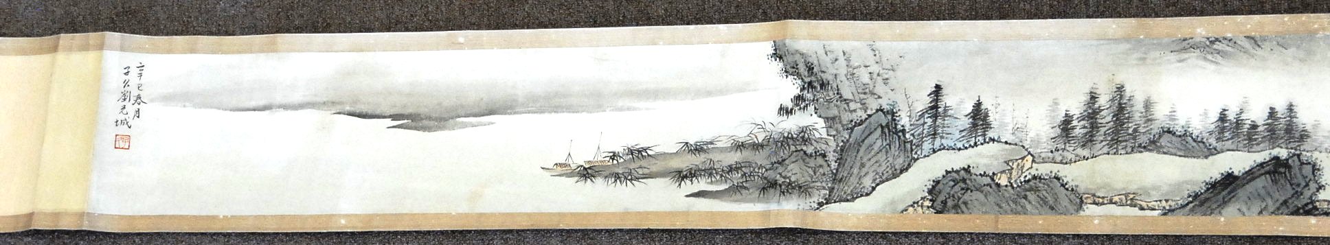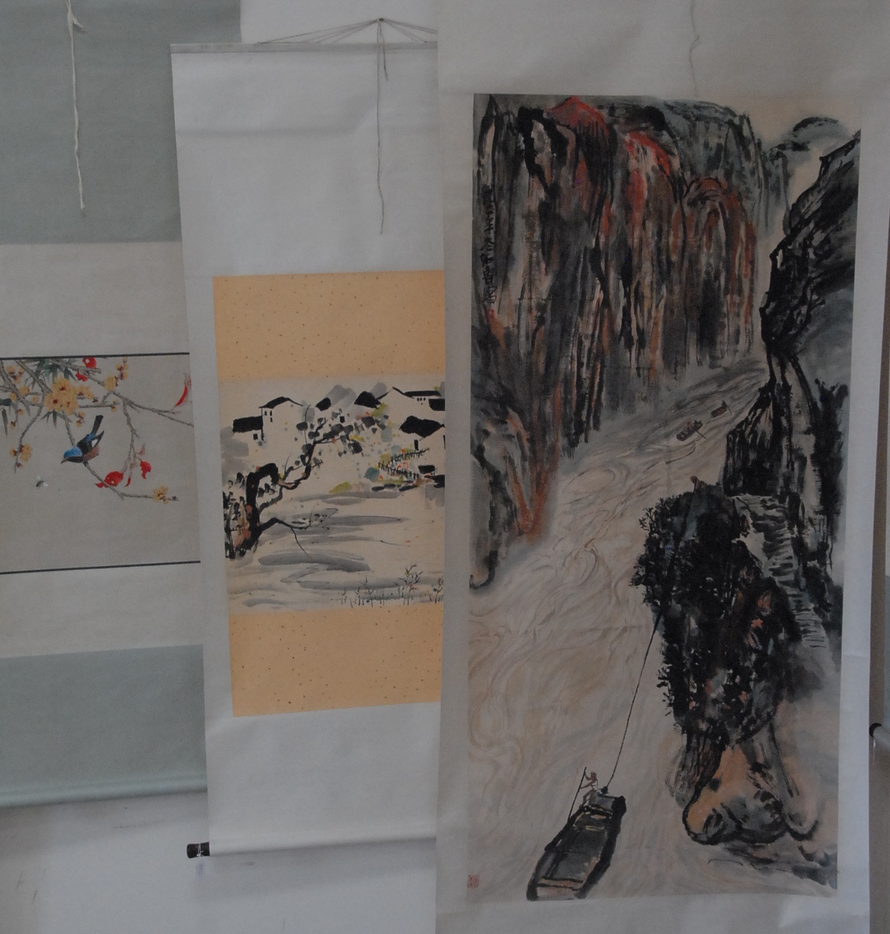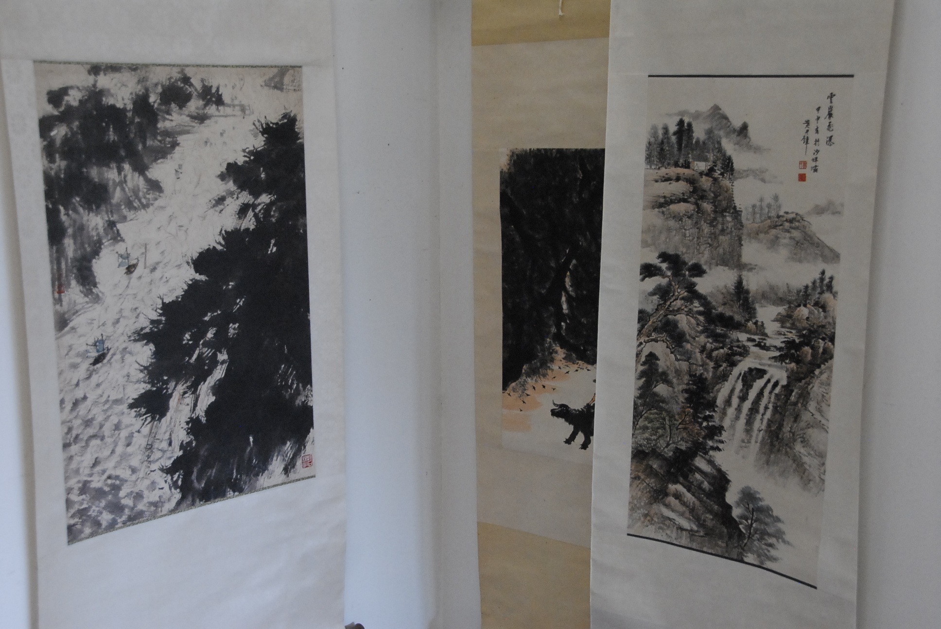Three Oriental scrolls, watercolor of large river valley 35 x 23, watercolor of buffalo 27 x 17, watercolor mountainous landscape with waterfall 38 x 17.