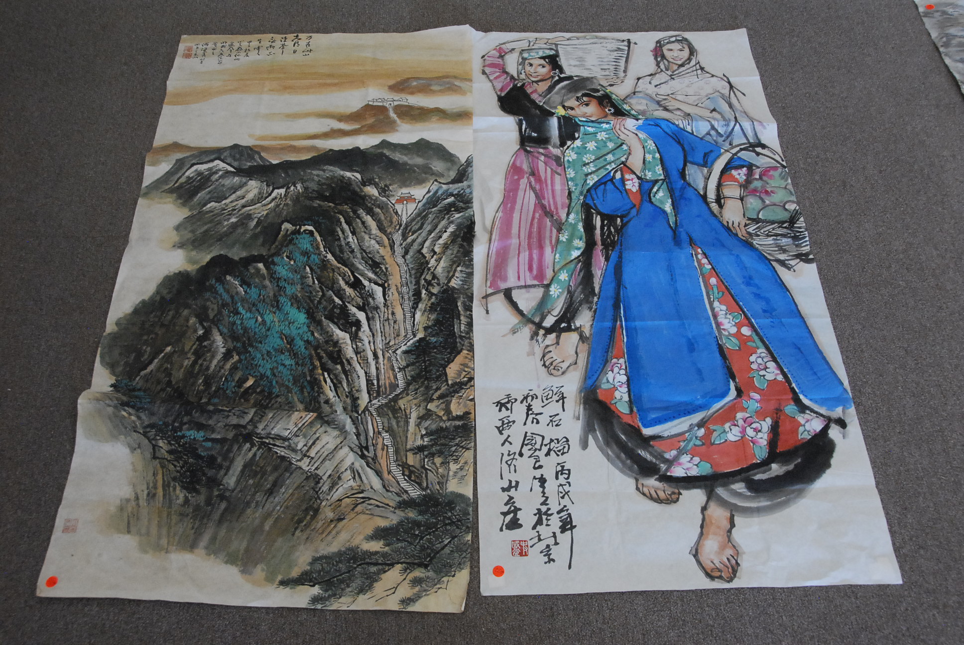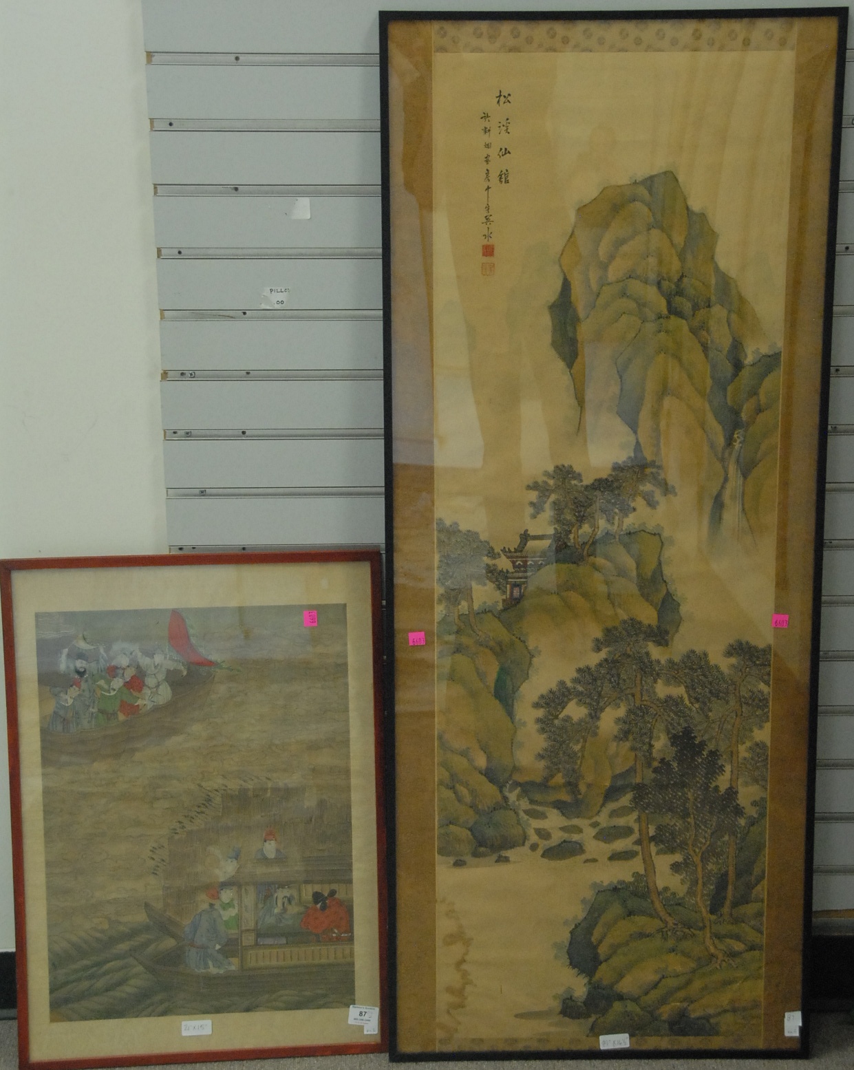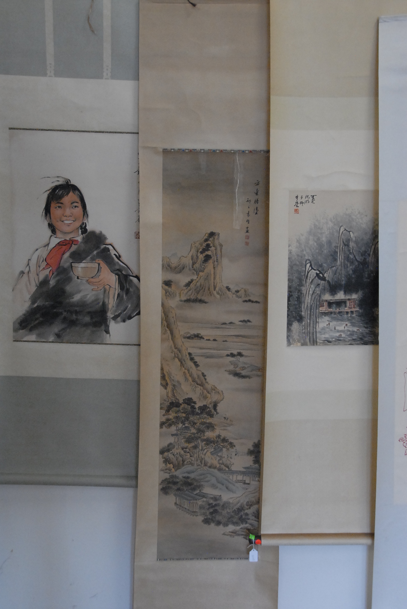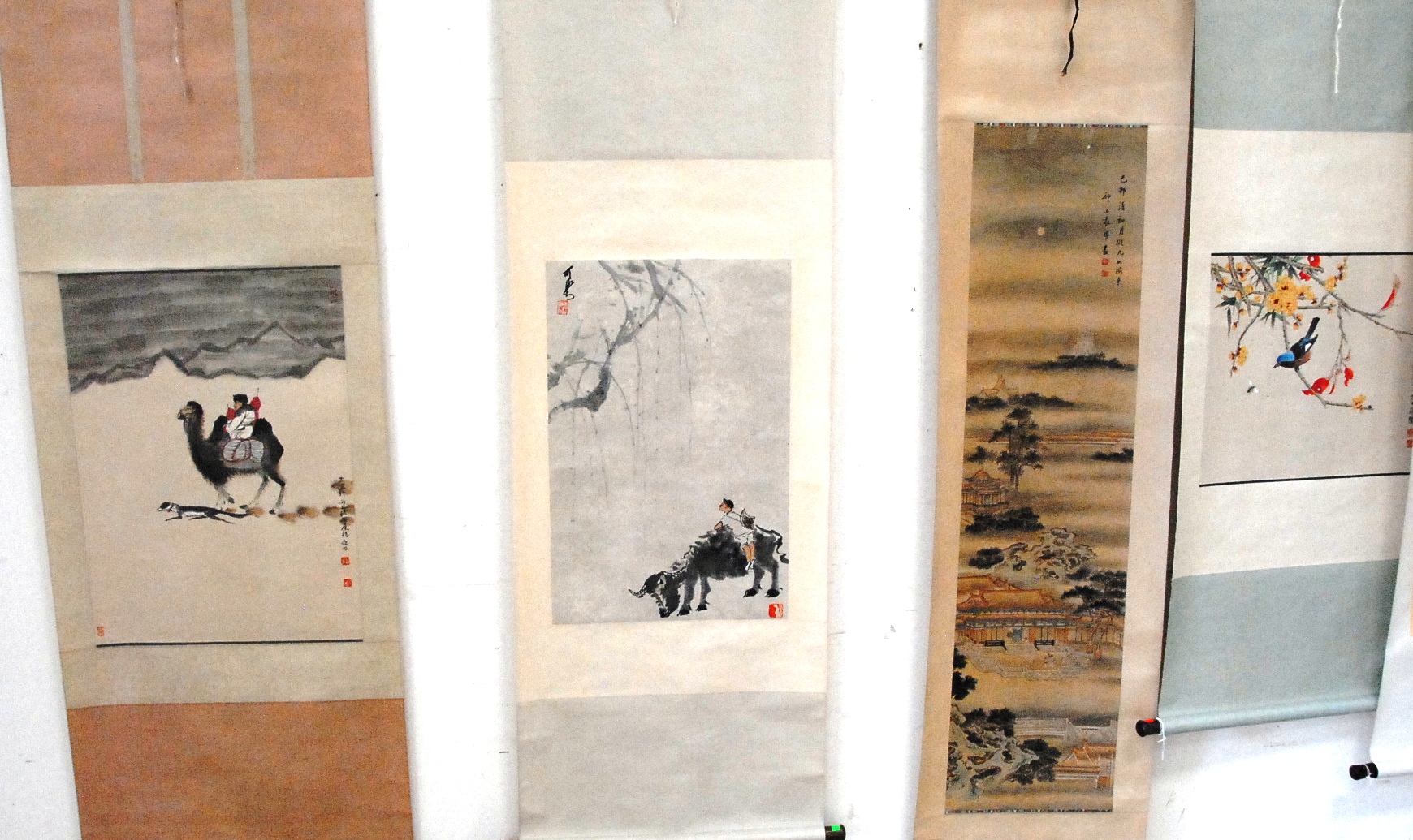 Group of three Oriental scrolls, watercolor landscape with courtyard and mountains 57 x 15, watercolor boy on bull 28 x 19, watercolor on camel 28 x 22.