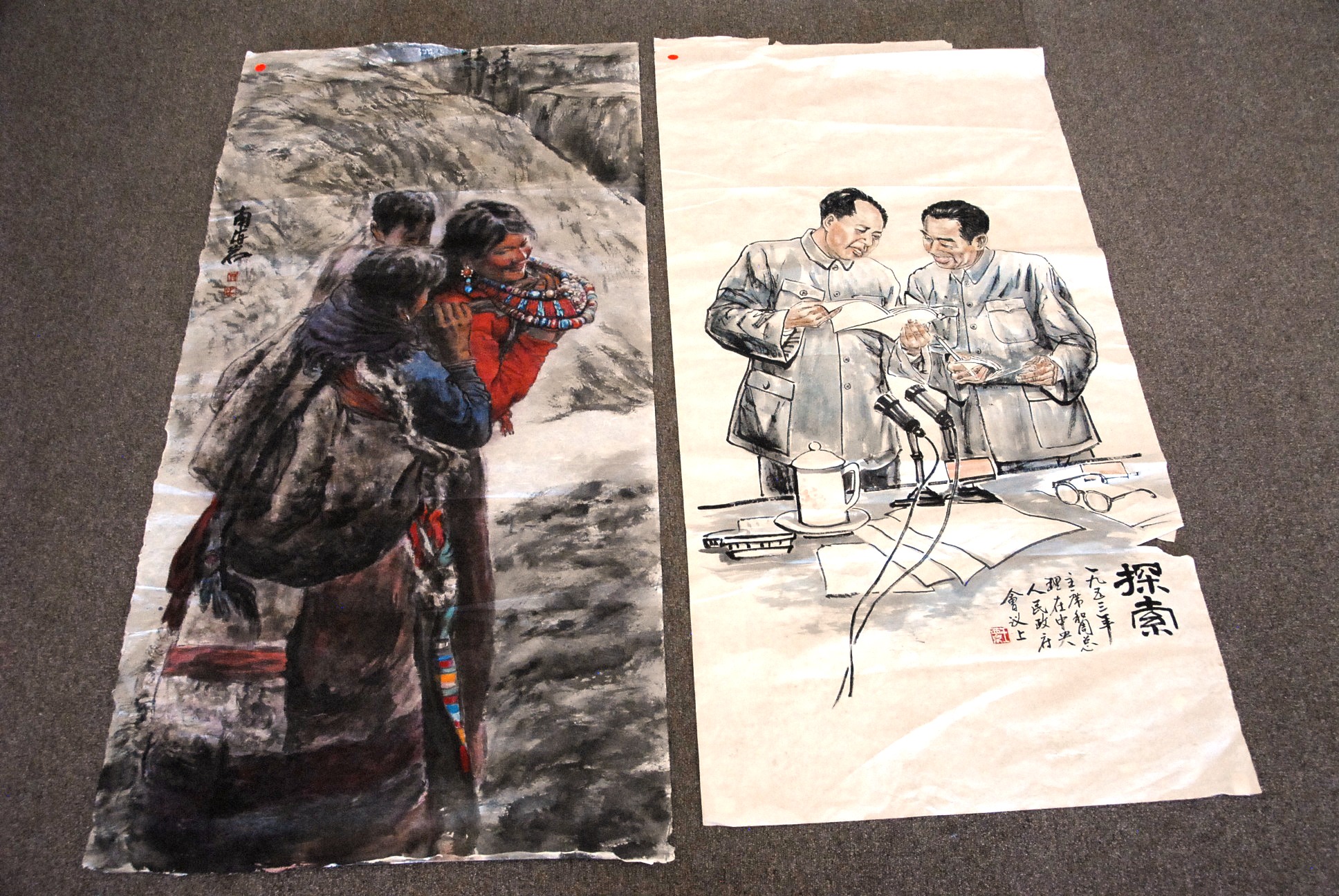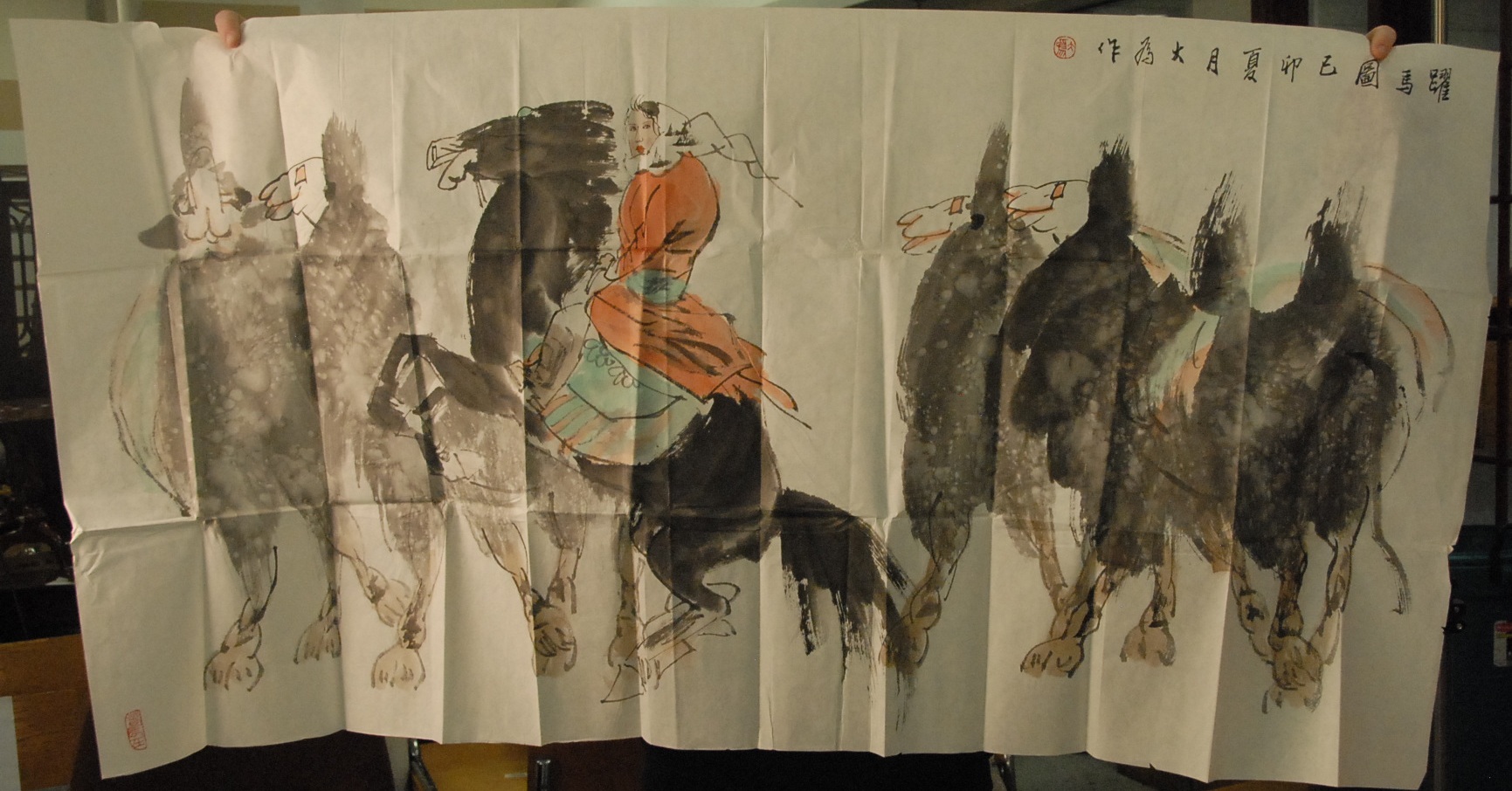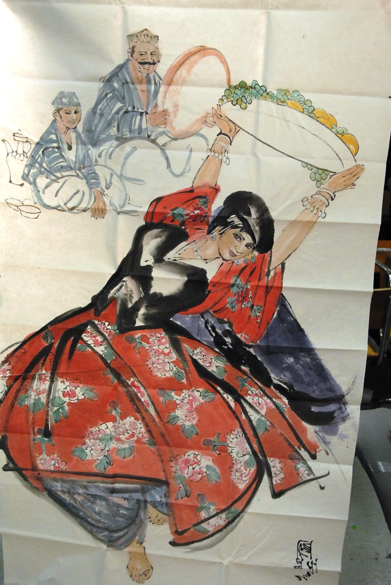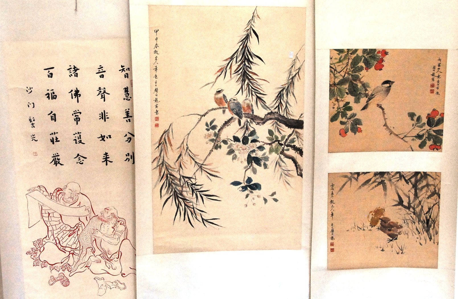 Group of three Oriental scrolls, watercolor landscape with courtyard and mountains 57 x 15, watercolor boy on bull 28 x 19, watercolor on camel 28 x 22.
