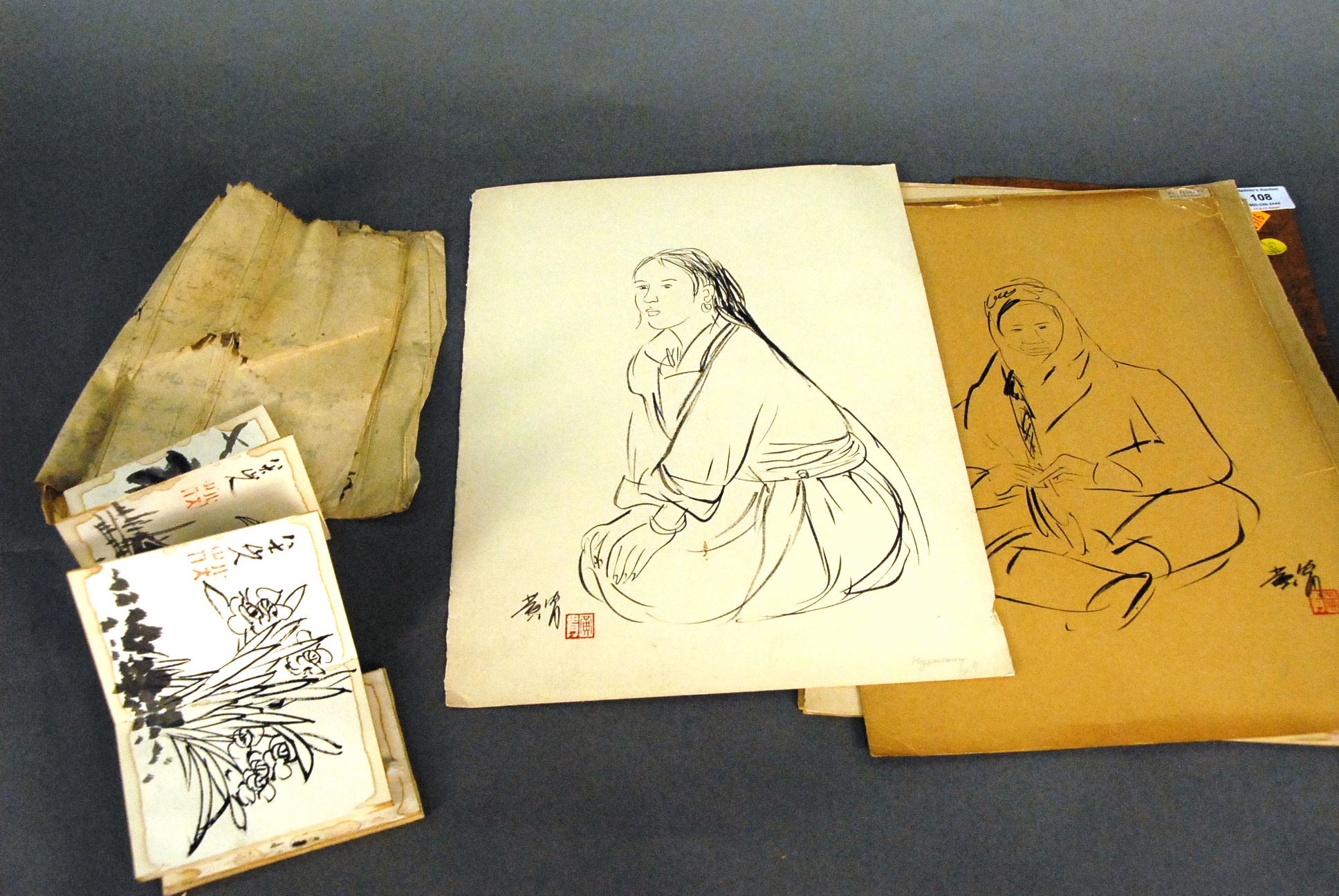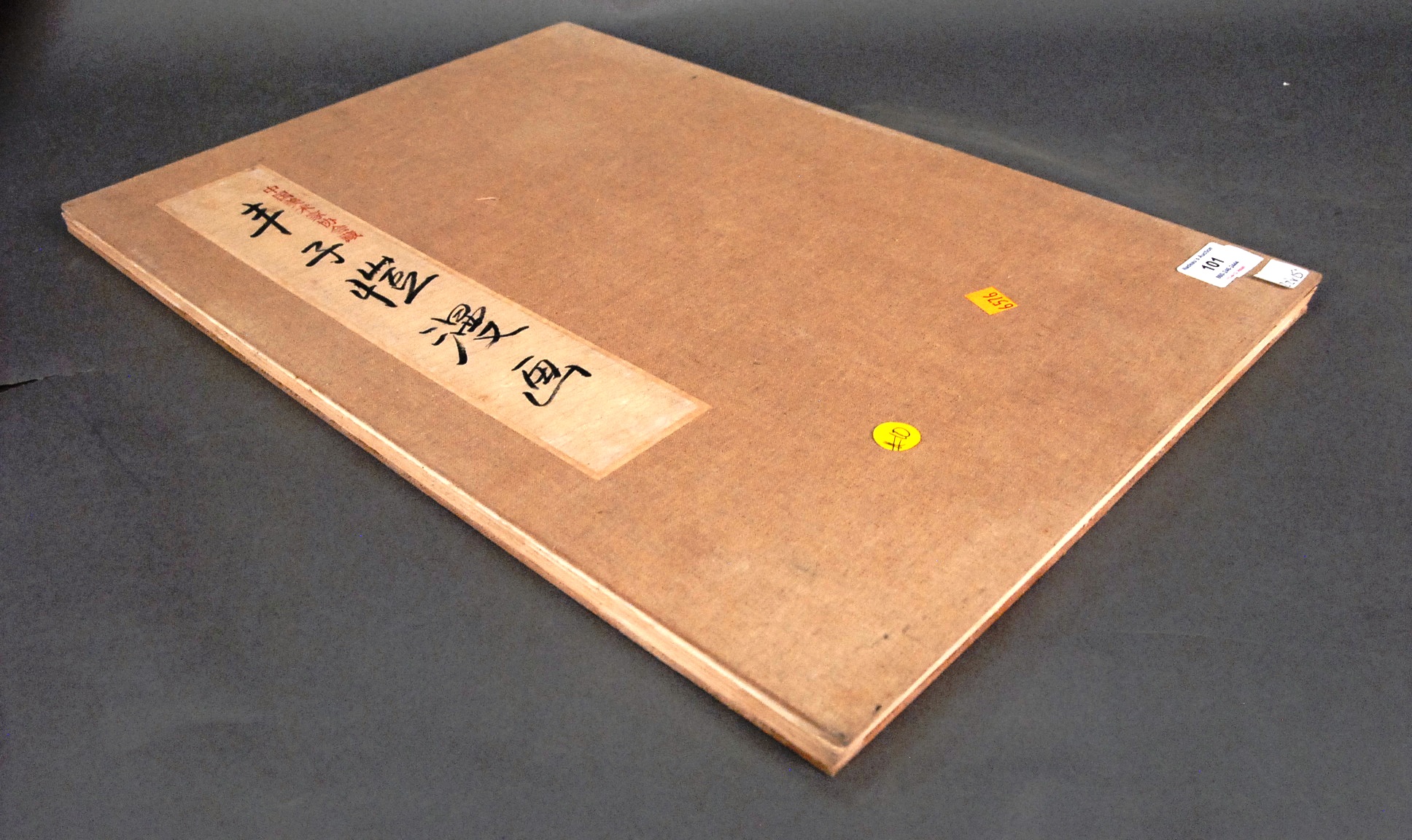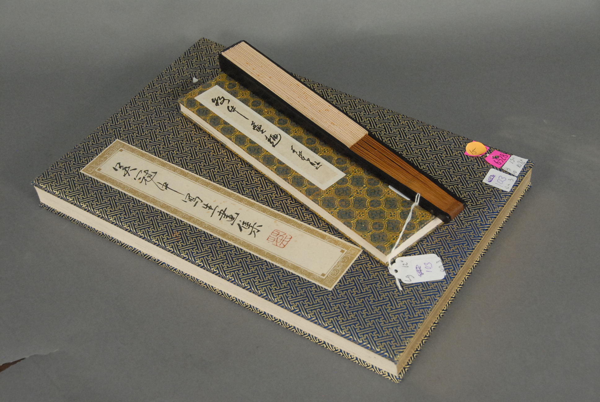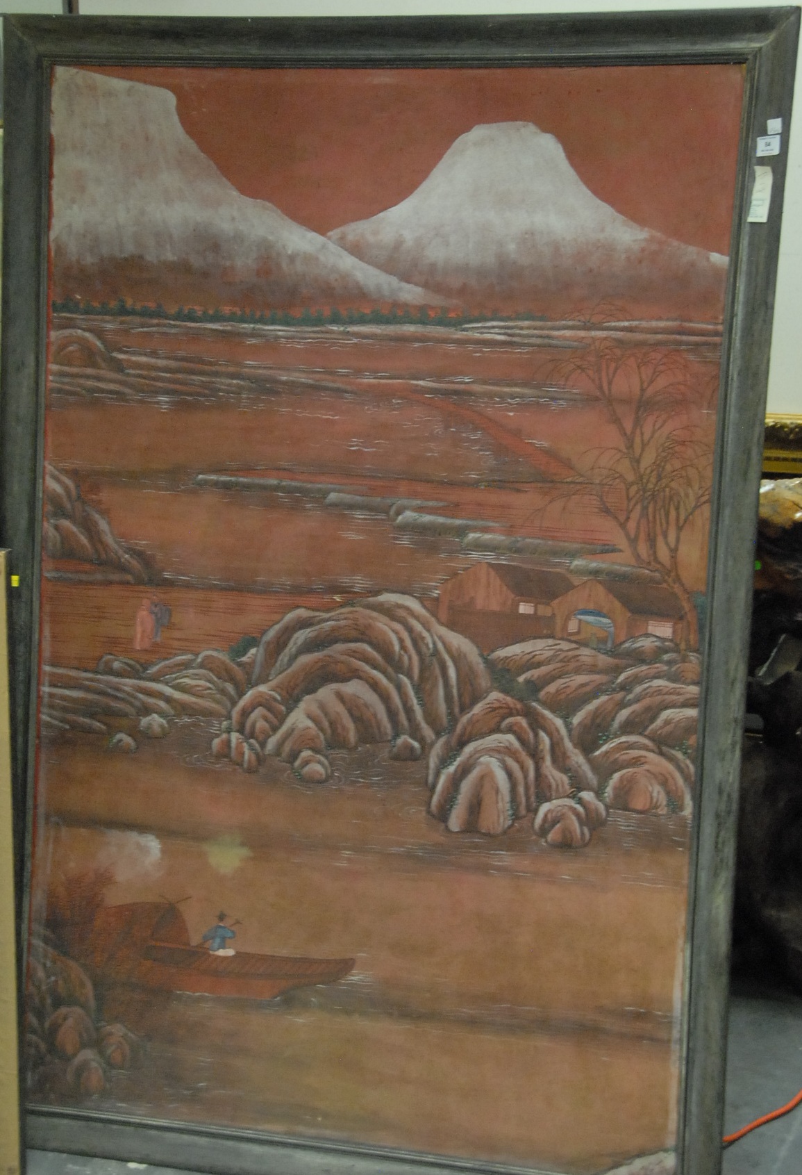 Group of three Oriental scrolls, watercolor landscape with courtyard and mountains 57 x 15, watercolor boy on bull 28 x 19, watercolor on camel 28 x 22.