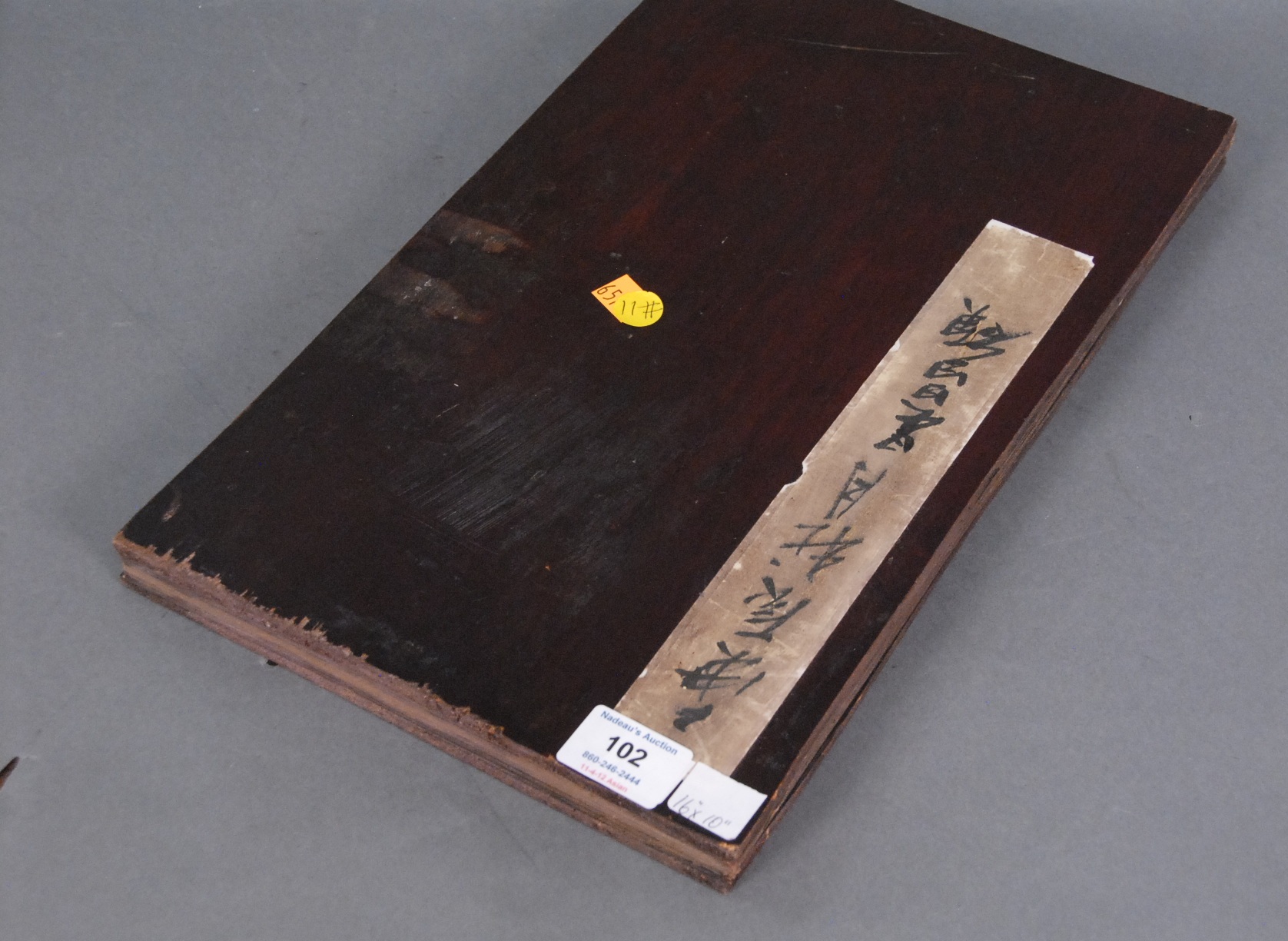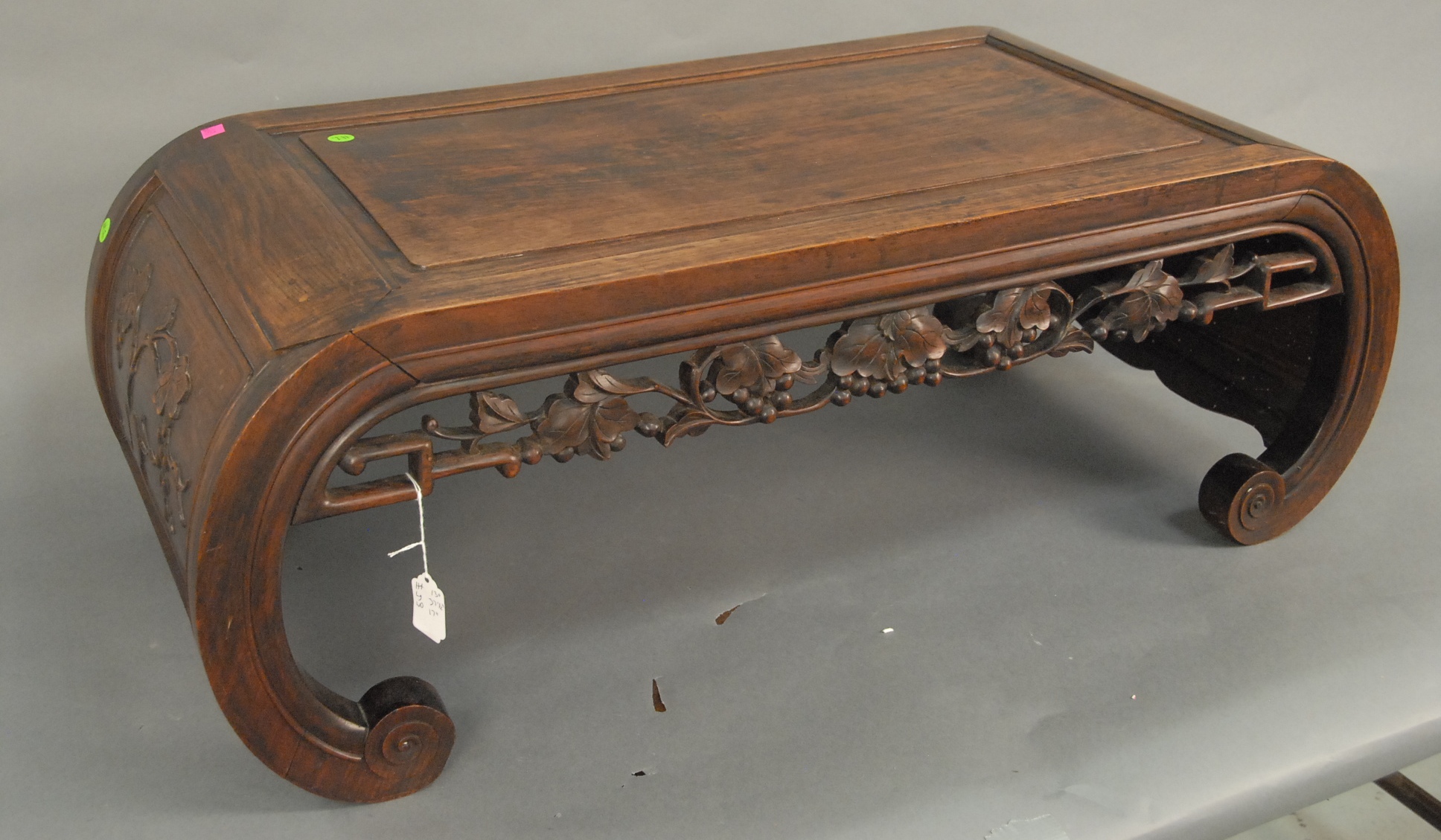 Eighteenth century Chinese horseshoe back armchair with cyma curved carved and paneled back splat, paneled seat, set on carved and turned legs connected by box stretcher in an exotic hardwood, ht. 38in.