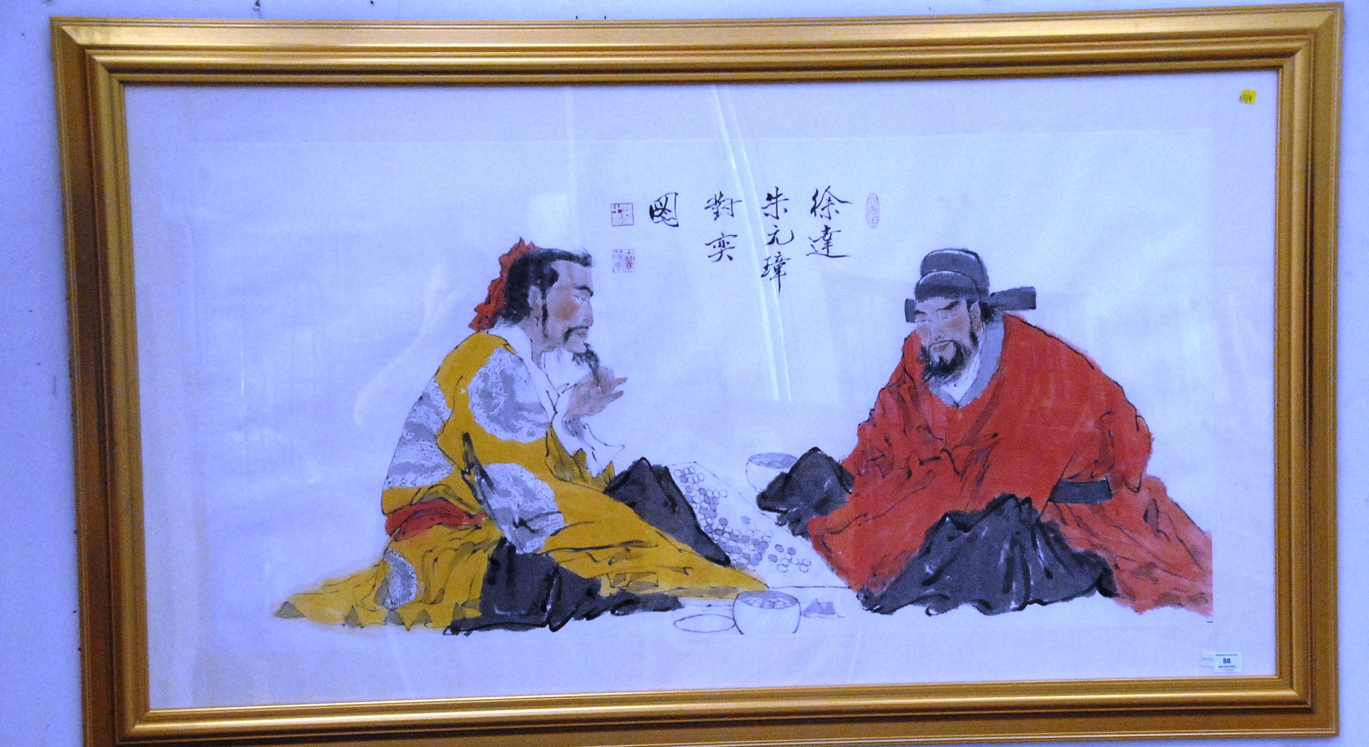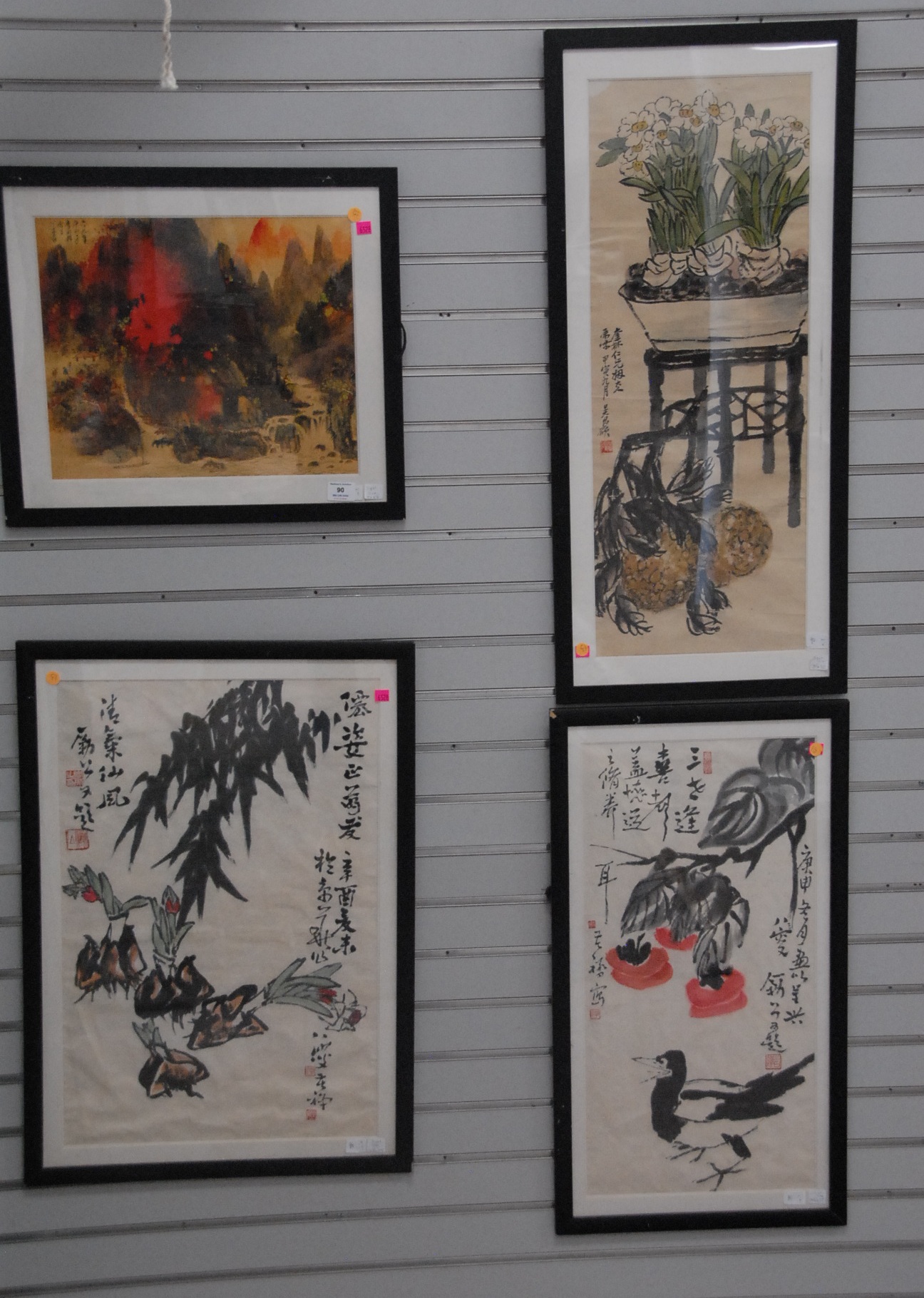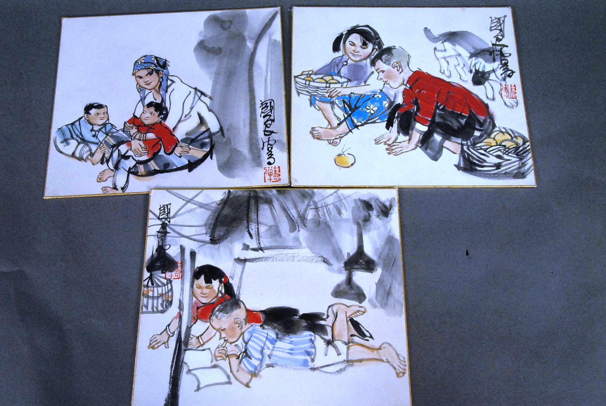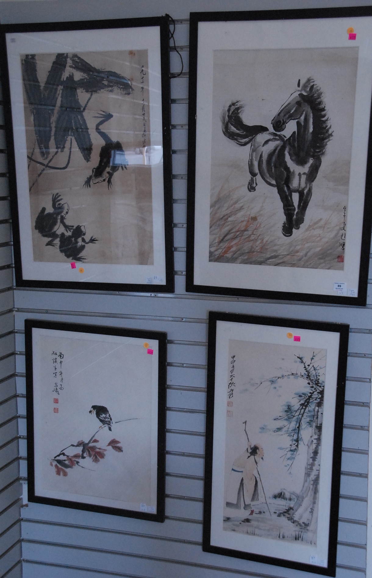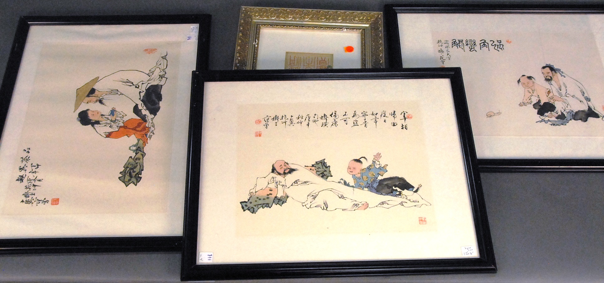 Group of four framed Oriental paintings, one of six character mark 4 x 4, two of a man with boy sight size 12: x 16, and one of a man with a girl 13 x 17.