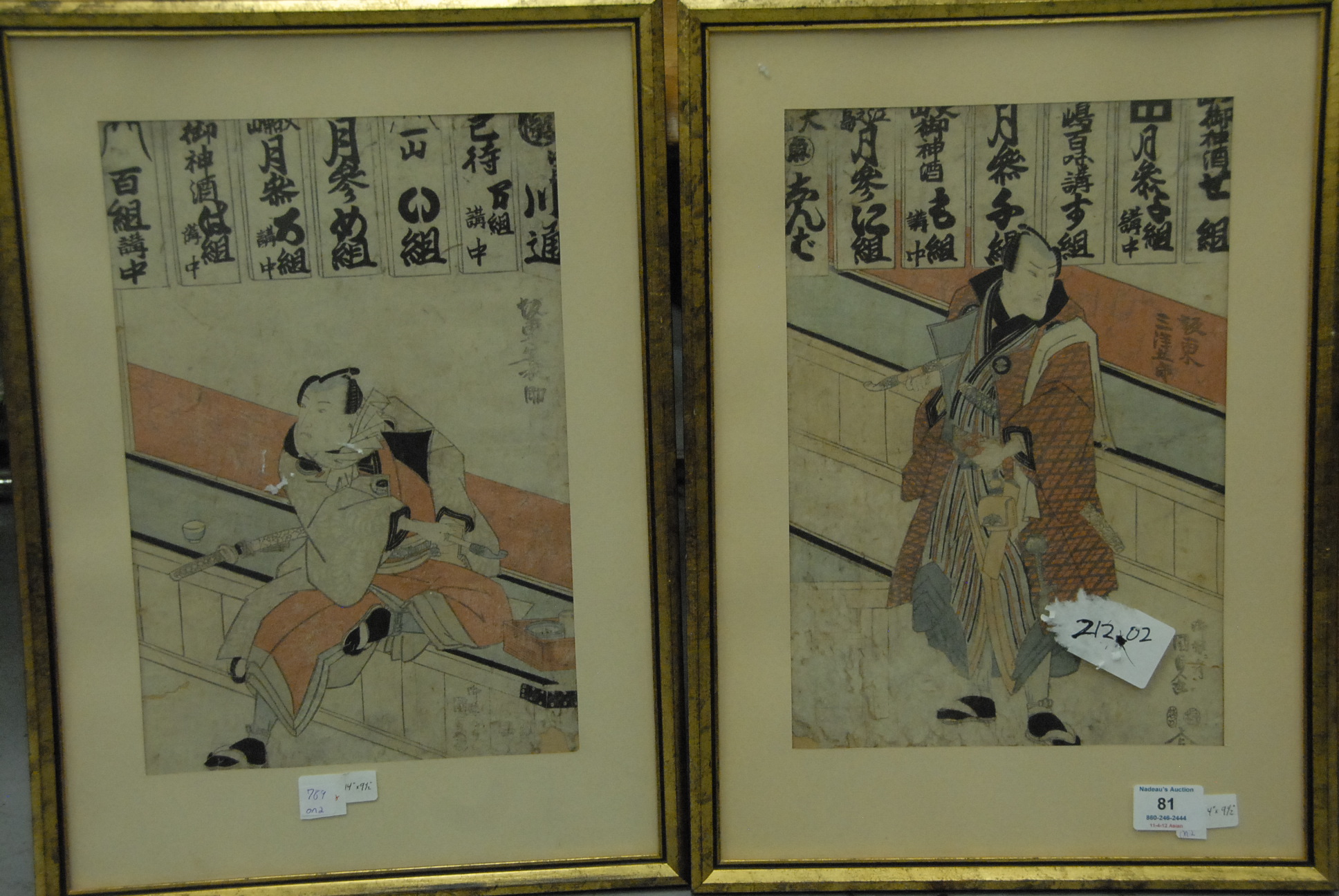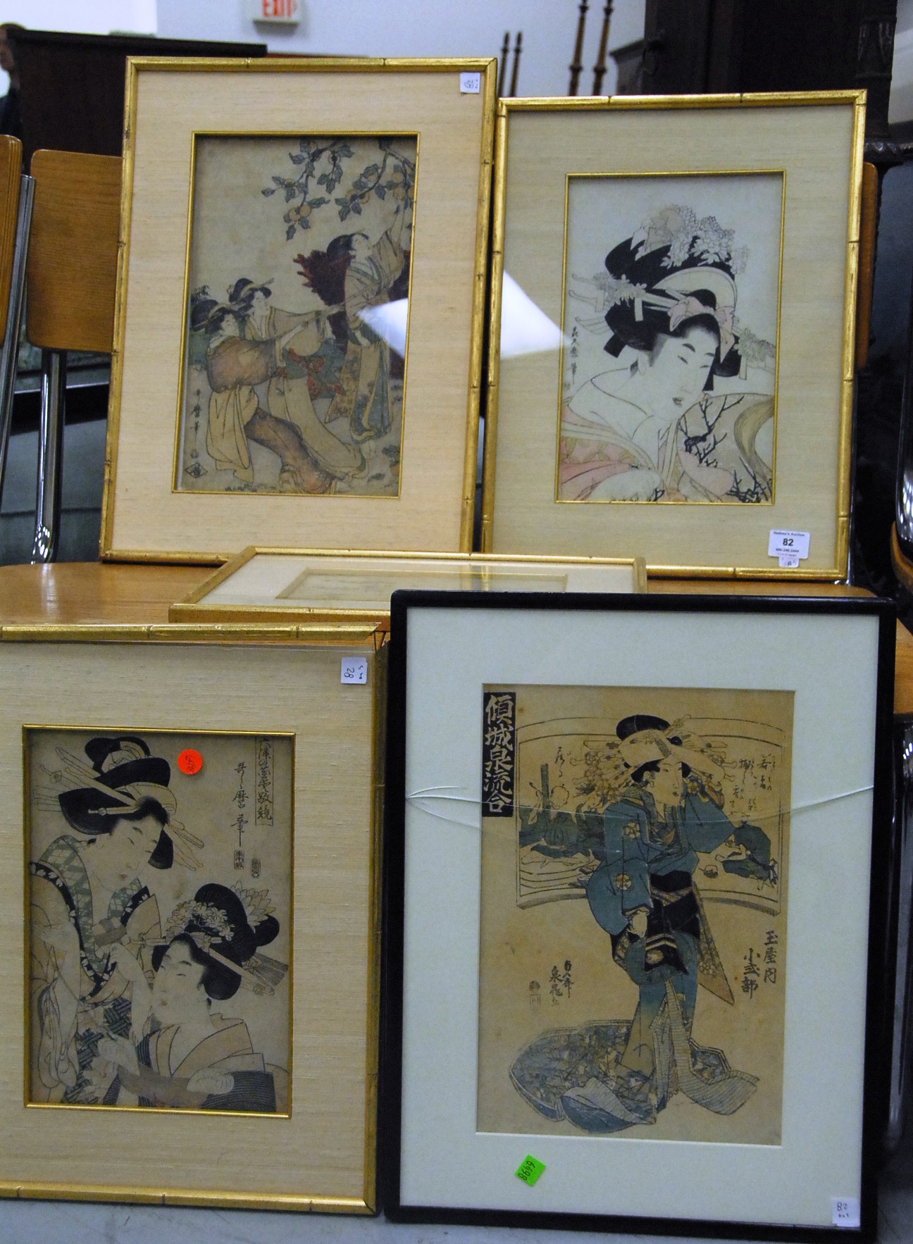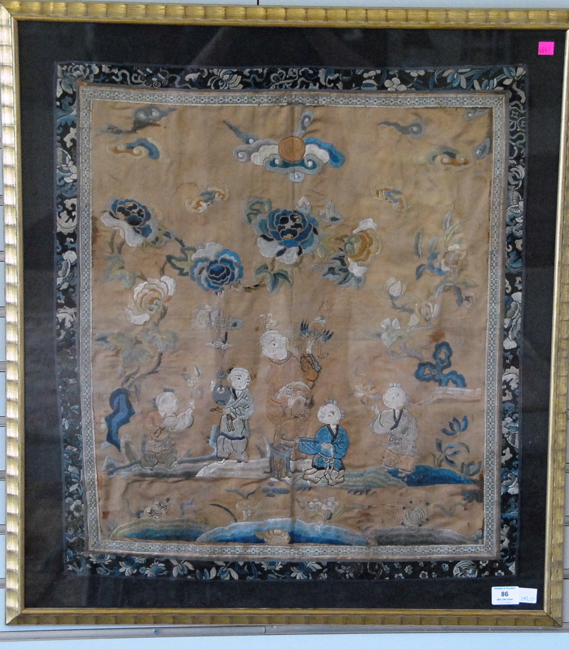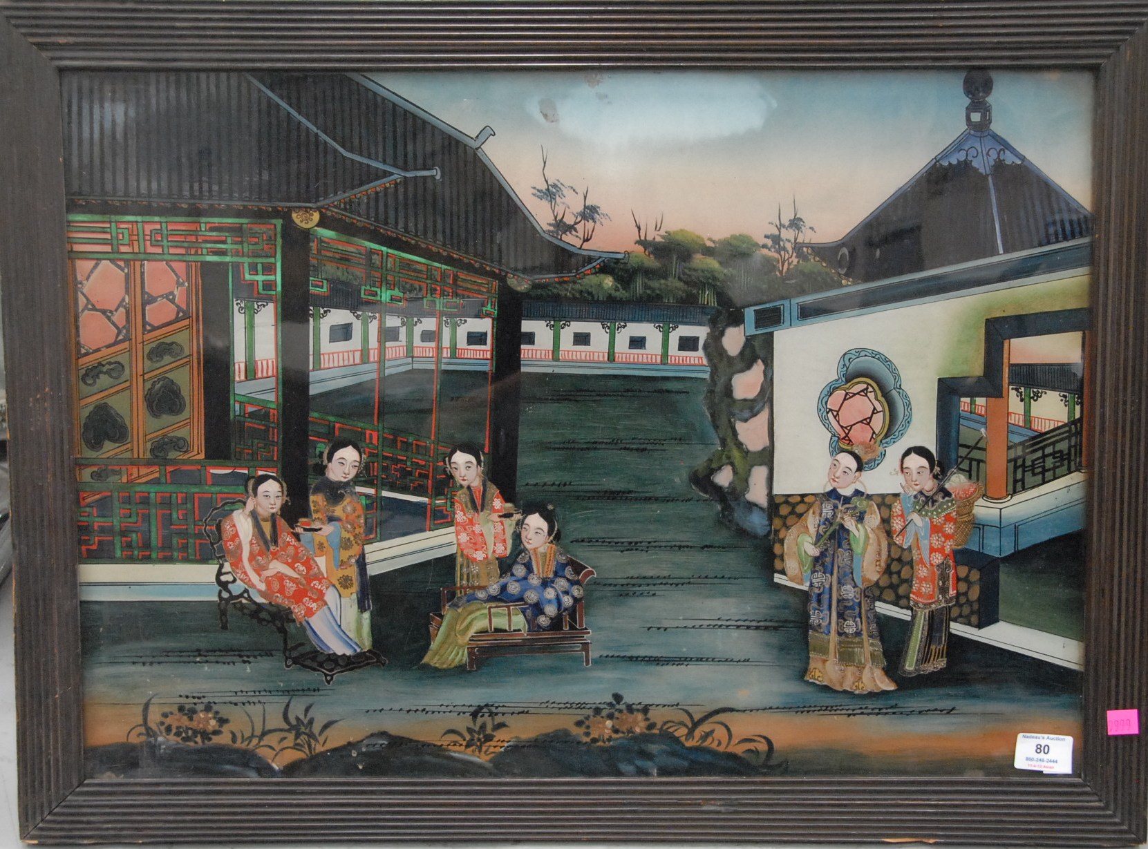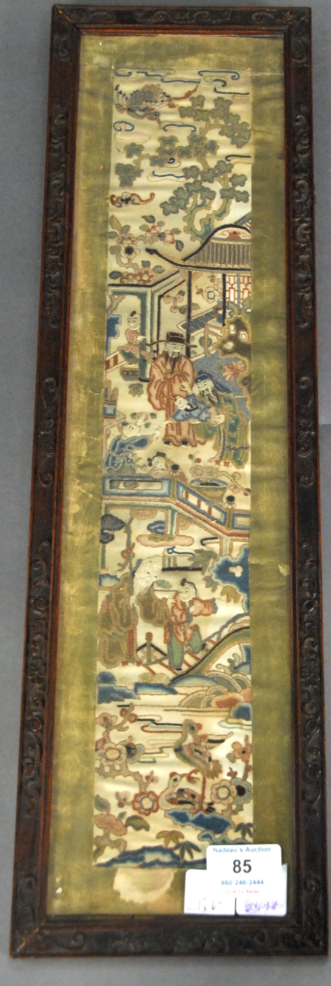 Group of four framed Oriental paintings, one of six character mark 4 x 4, two of a man with boy sight size 12: x 16, and one of a man with a girl 13 x 17.