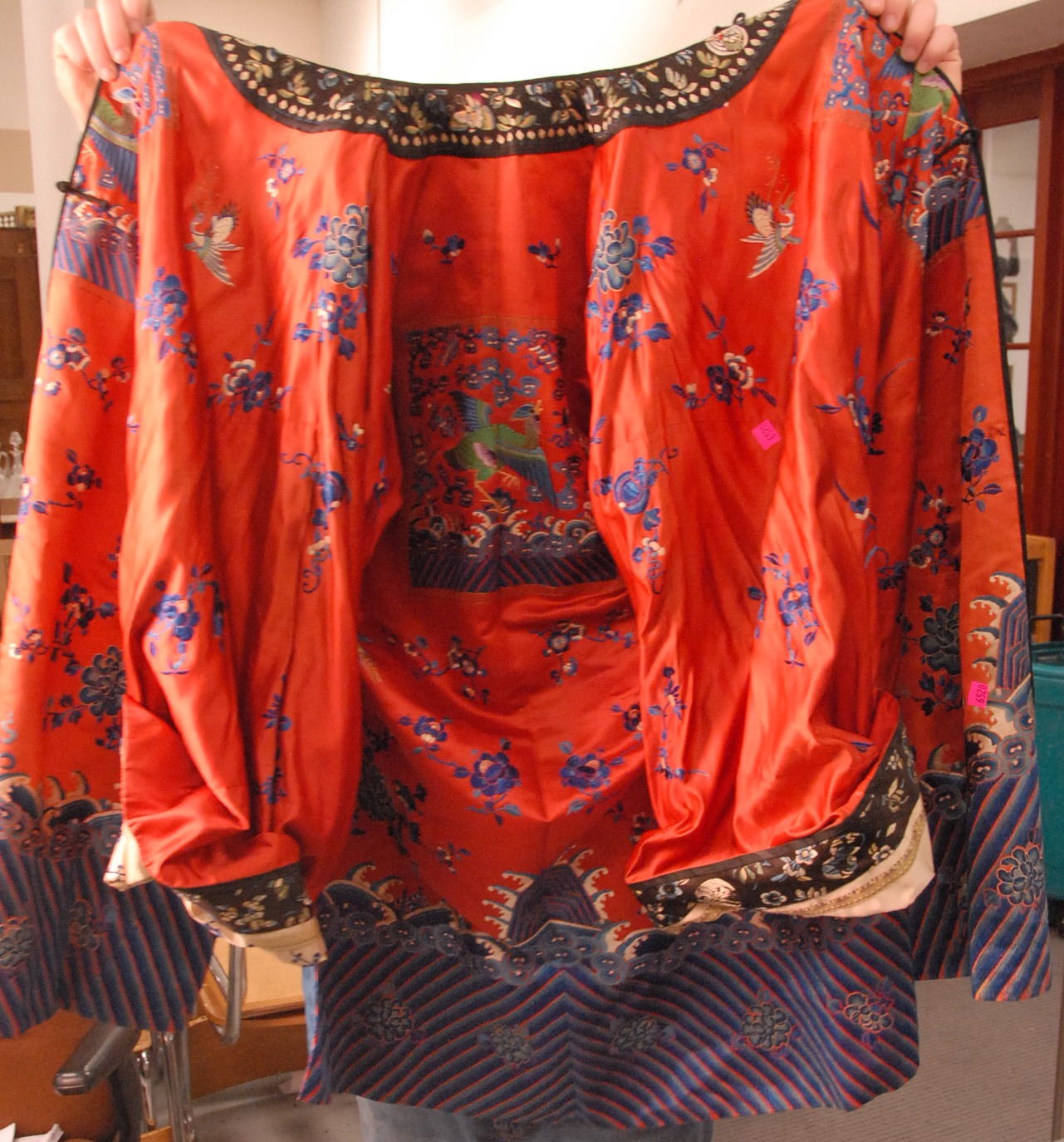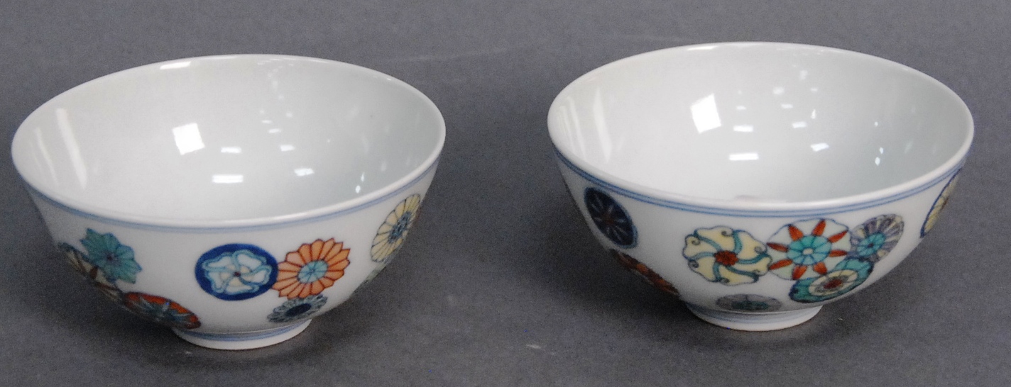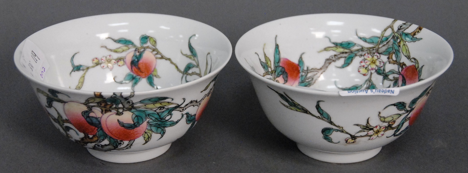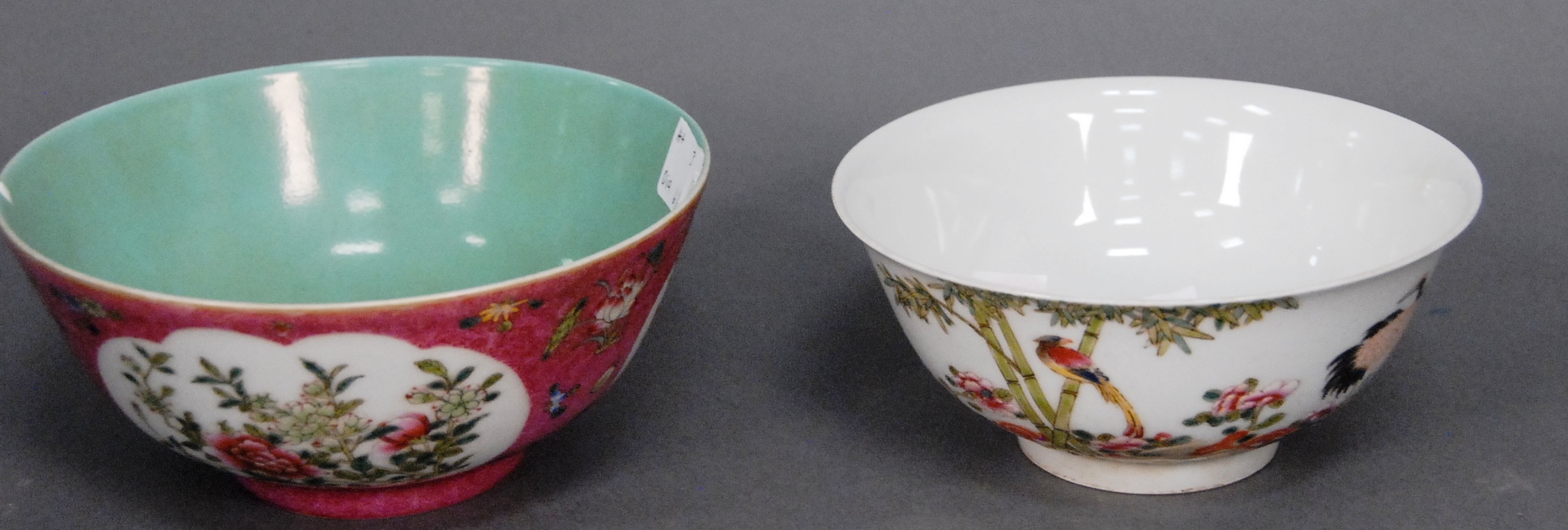 Two famille rose bowls one with pink ground and blossoming flower panels and character mark on bottom as is dia. 6 1/2in. and ostrich bird bowl with four character mark on bottom dia. 6in.