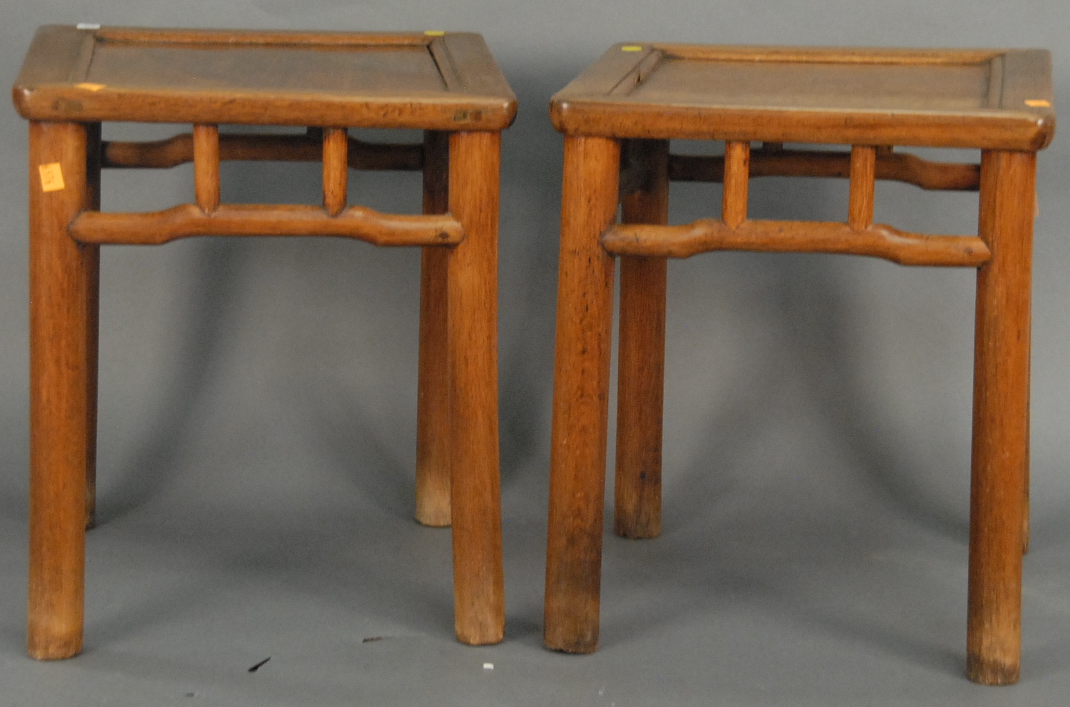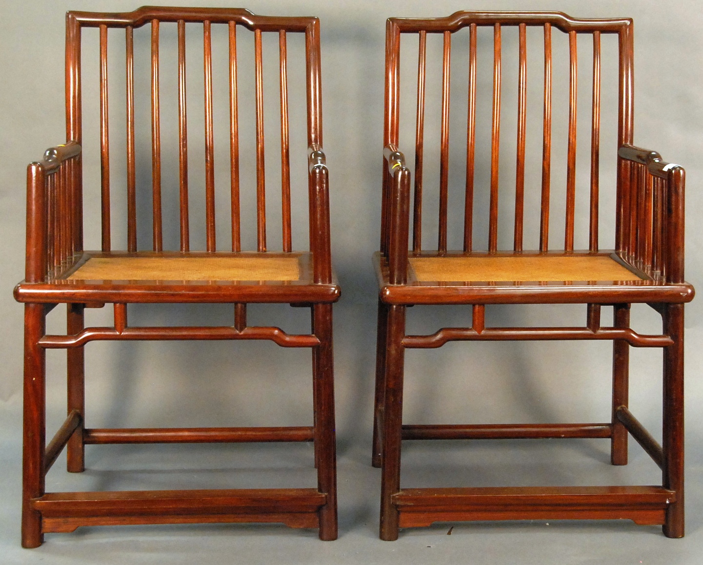 Pair of Huanghuali wood armchairs, 19th century, back and arms with verticle spools and woven seat, raised on round legs with shaped skirt above stretcher base.