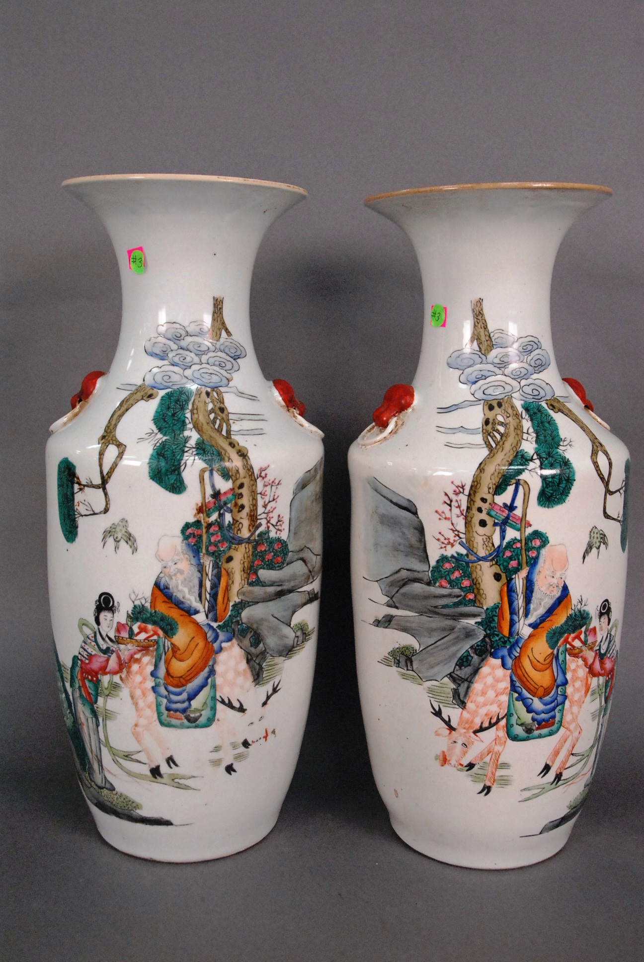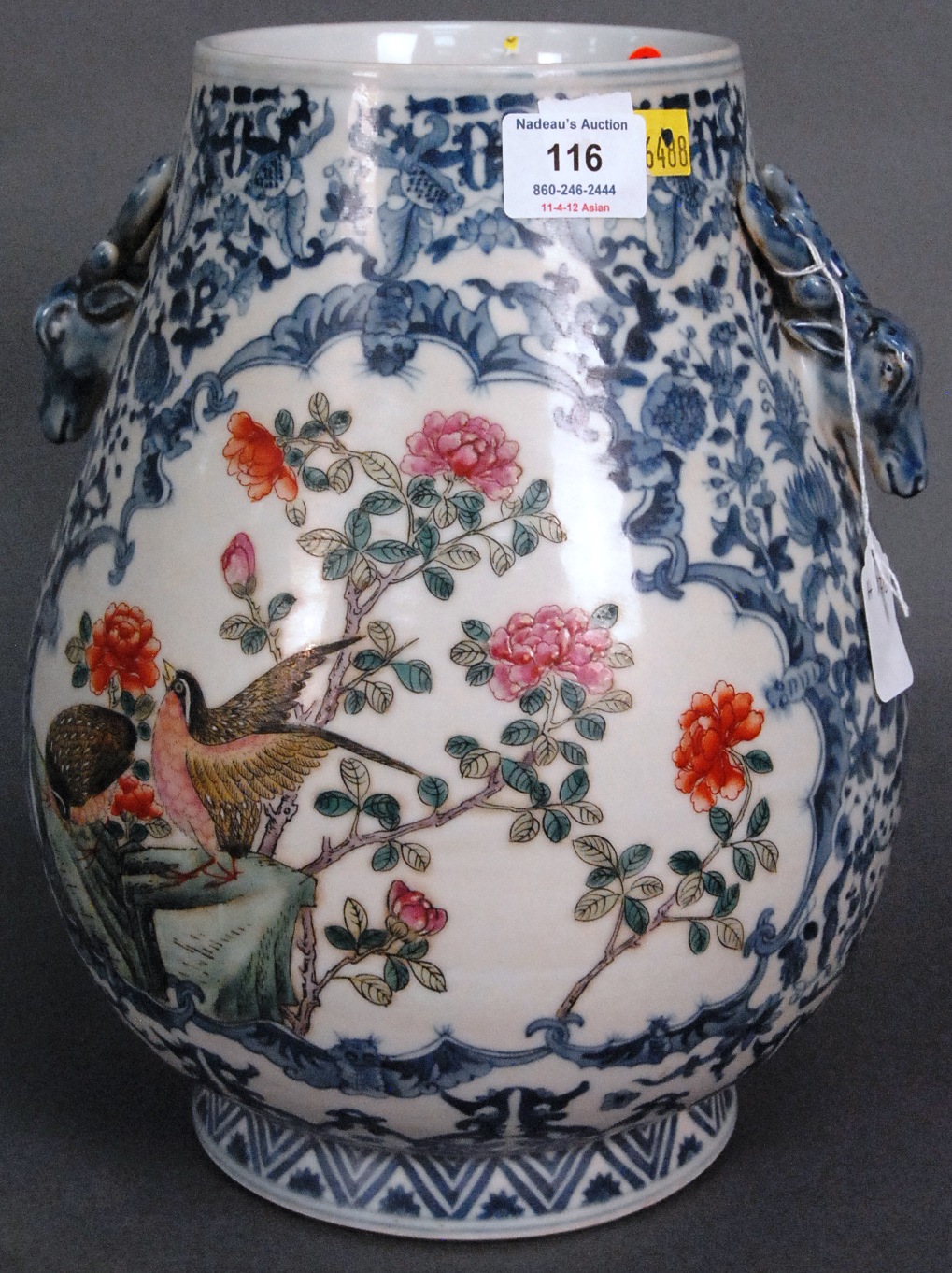 Famille rose vase having an overall blue and white scrolling vine and flower decoration and deer head handles, one panel on each side with painted bird and blossoming wild flowers, ht. 12 1/2in.