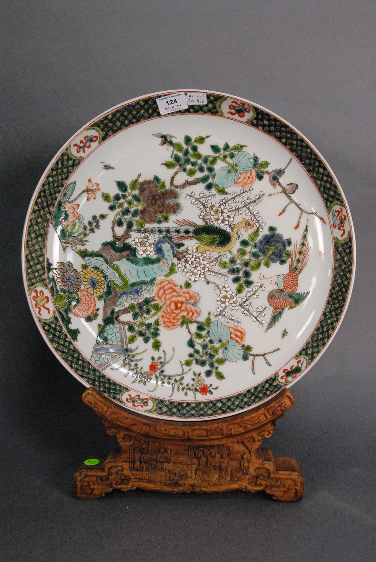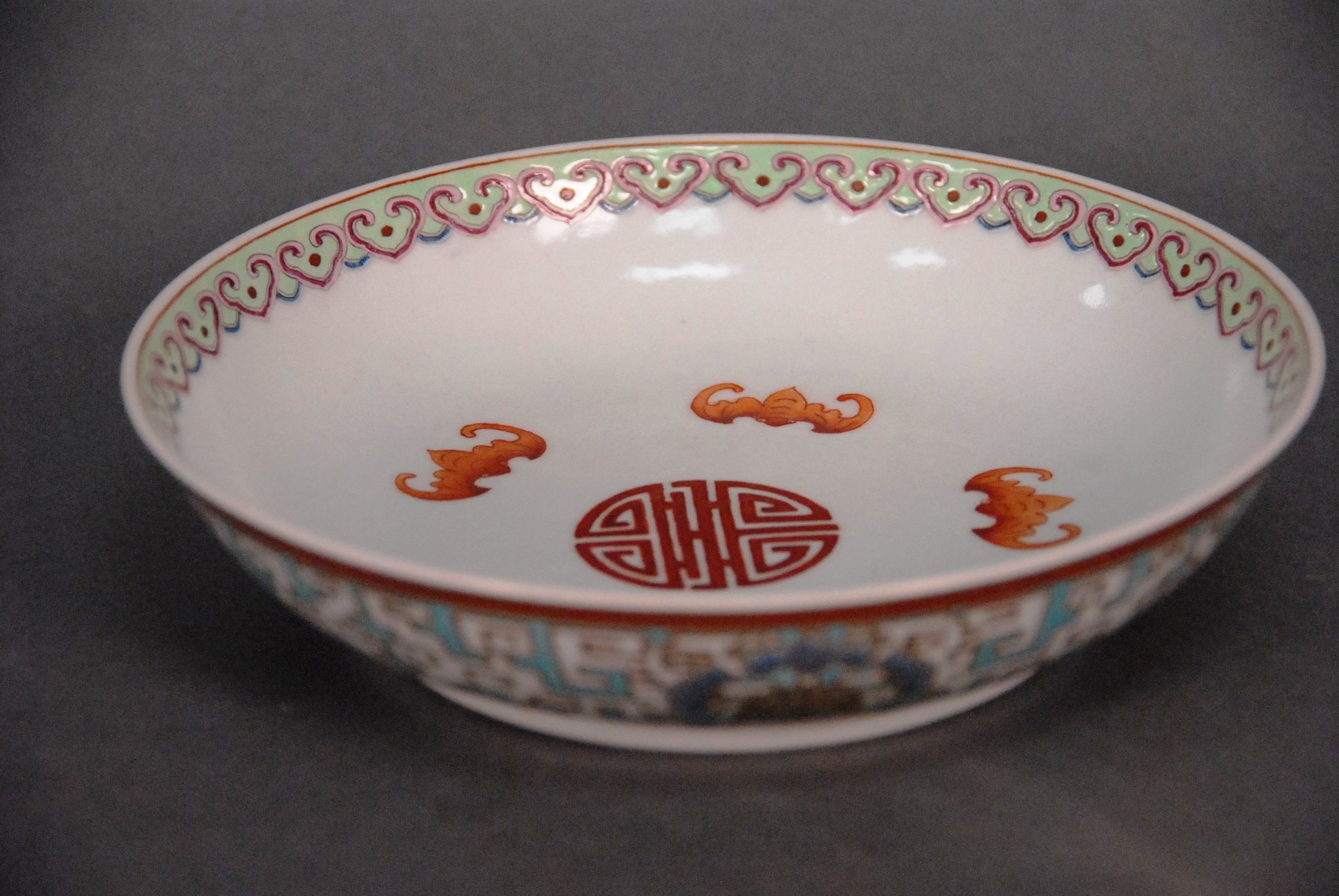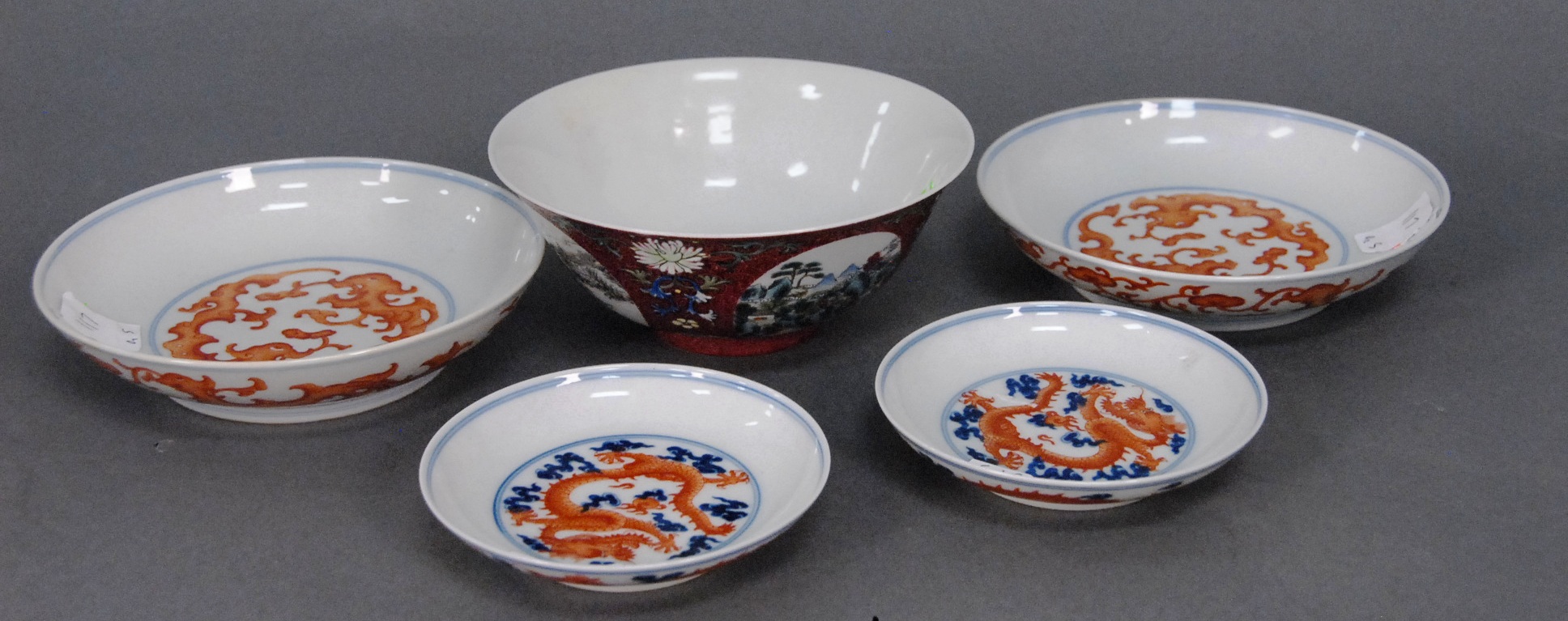 Group of five Oriental porcelain items small pair of five claw dragon dishes with six character mark on bottom dia. 4 1/4in. pair of porcelain foo dragon dishes marked with Yongcheng mark on bottom dia. 6in. and Famille rose bowl with Qianlong mark ht. 2 1/2in. dia. 6in.