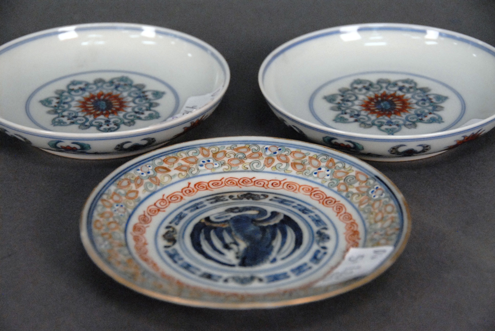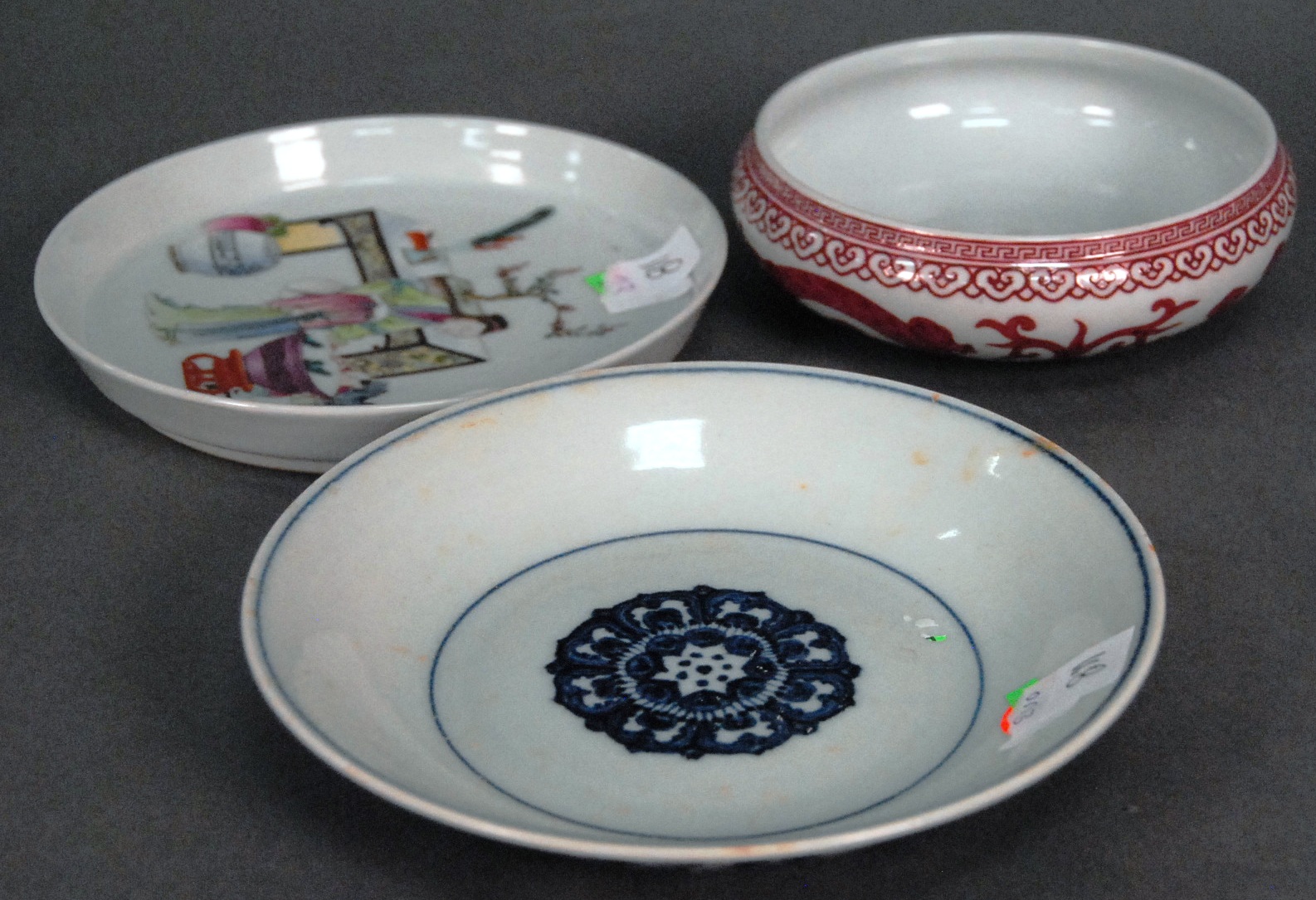 Group of three Oriental porcelain pieces to include a blue and white bowl dia. 7in., Famille rose plate with Guanyin figure having Yongzheng mark, and dragon bowl with Qianlong mark on bottom.