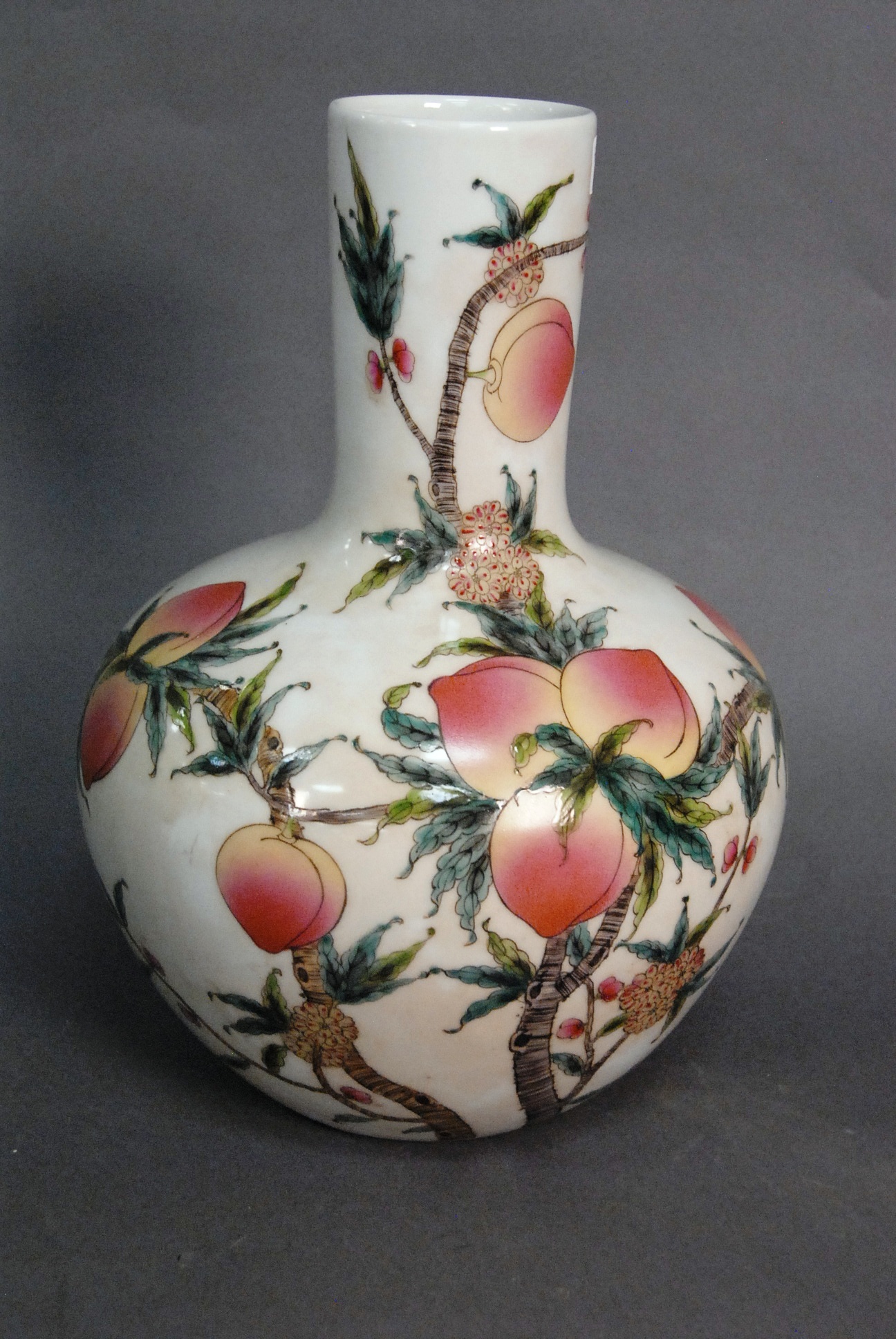 Porcelain peach vase in globular form with painted groupings of peaches and blossoming flowers having four character mark on bottom, ht. 13 1/2in.