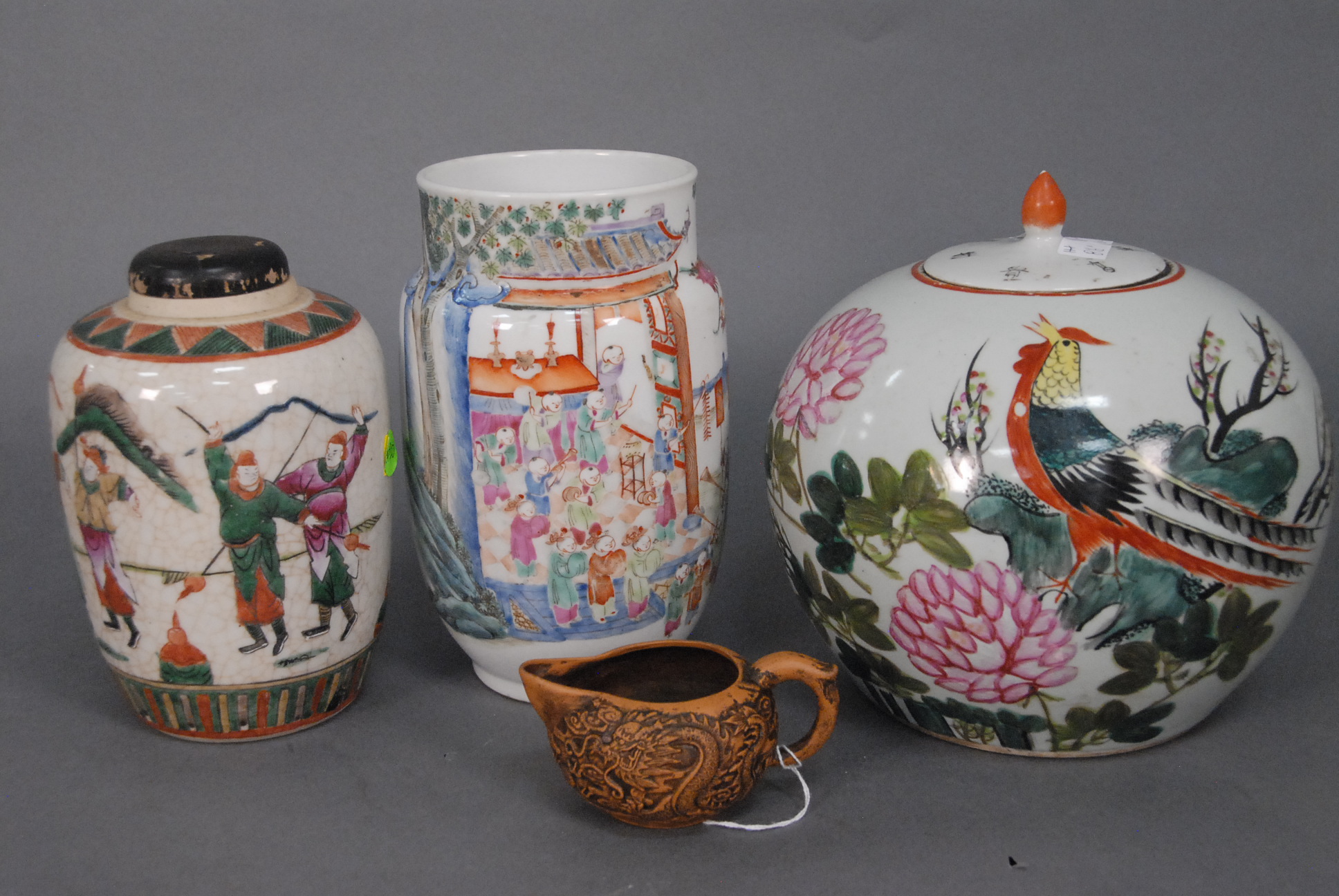 Group of four Oriental porcelain pieces to include boys vase, small creamer, rooster ginger jar, and vase with warrior figure.