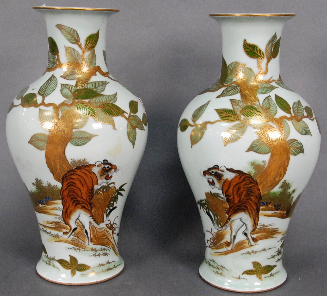 Pair of baluster vases with painted tigers under a tree having six character marks on bottom, ht. 14 1/2in.