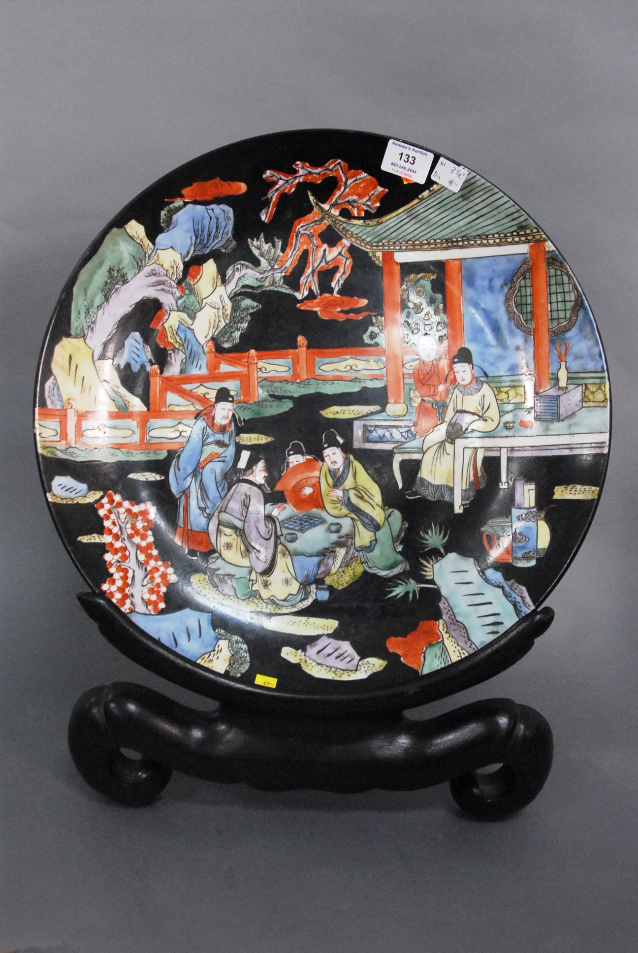 Large Oriental charger having courtyard scene with figures, dia. 18in.